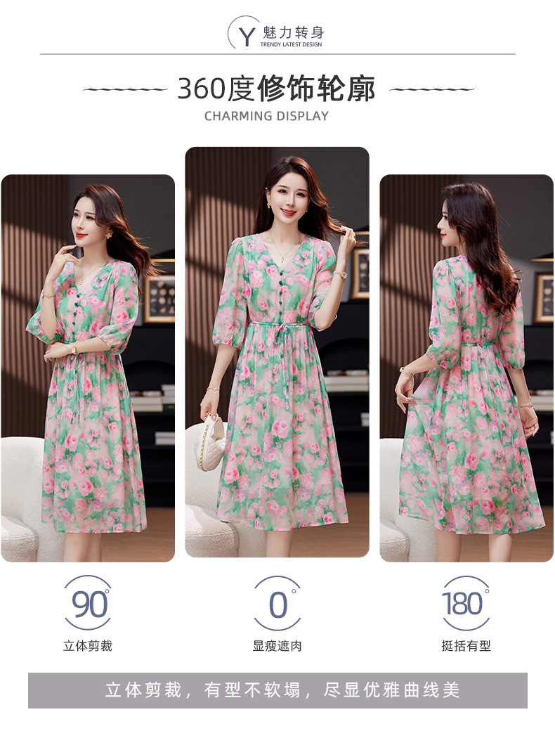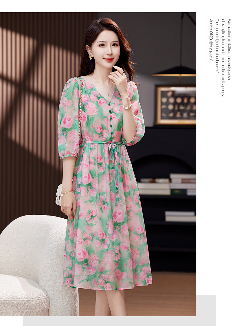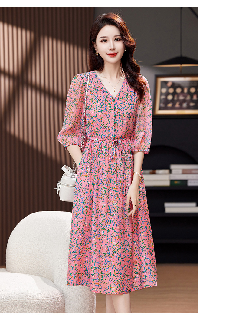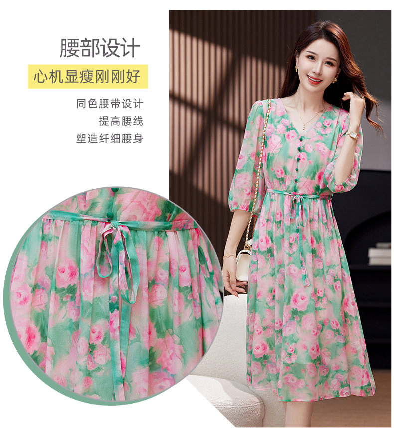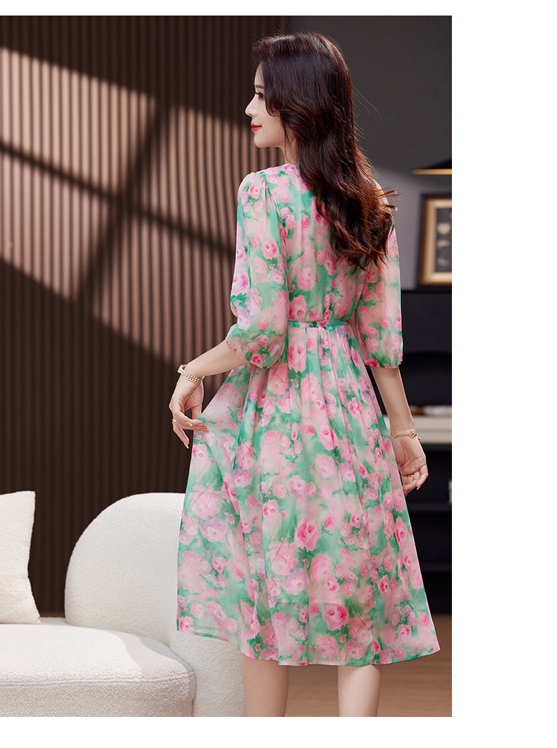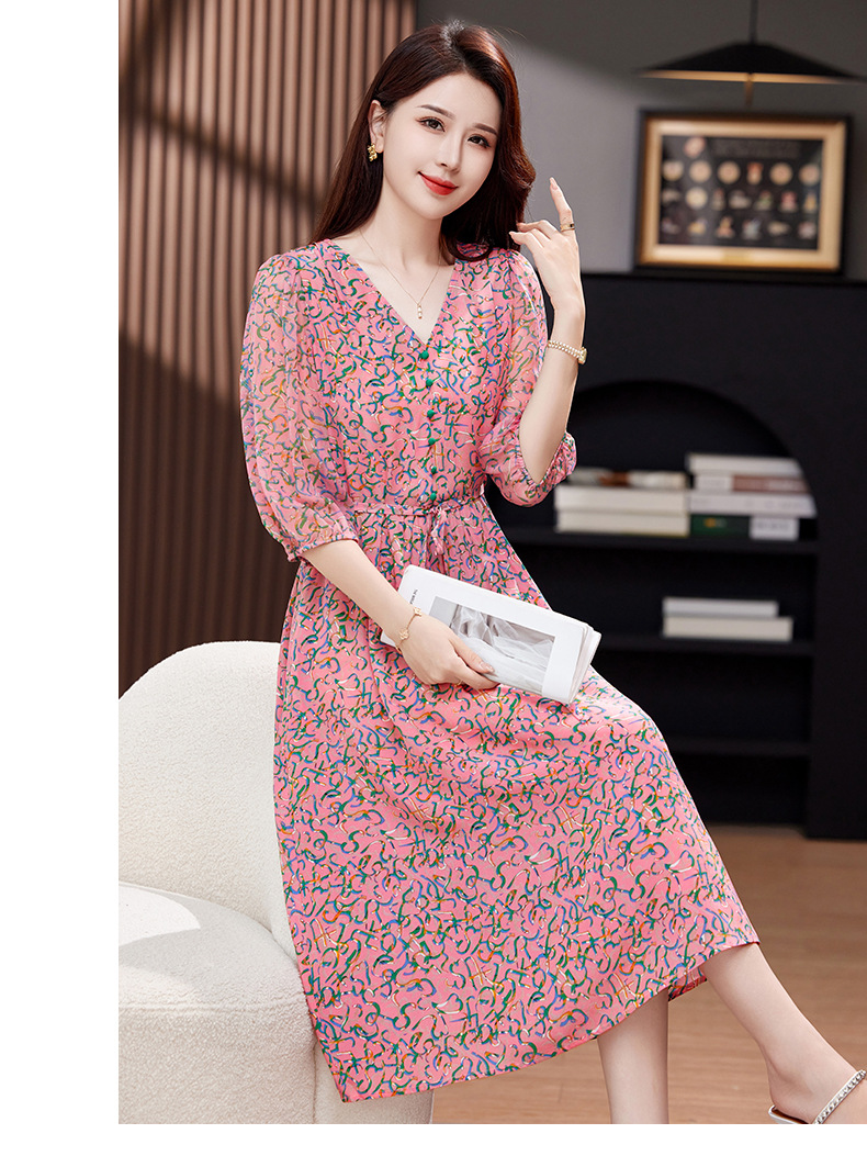 气质V领时尚印花,显瘦中长款桑蚕丝裙KQN- 9356