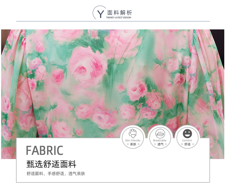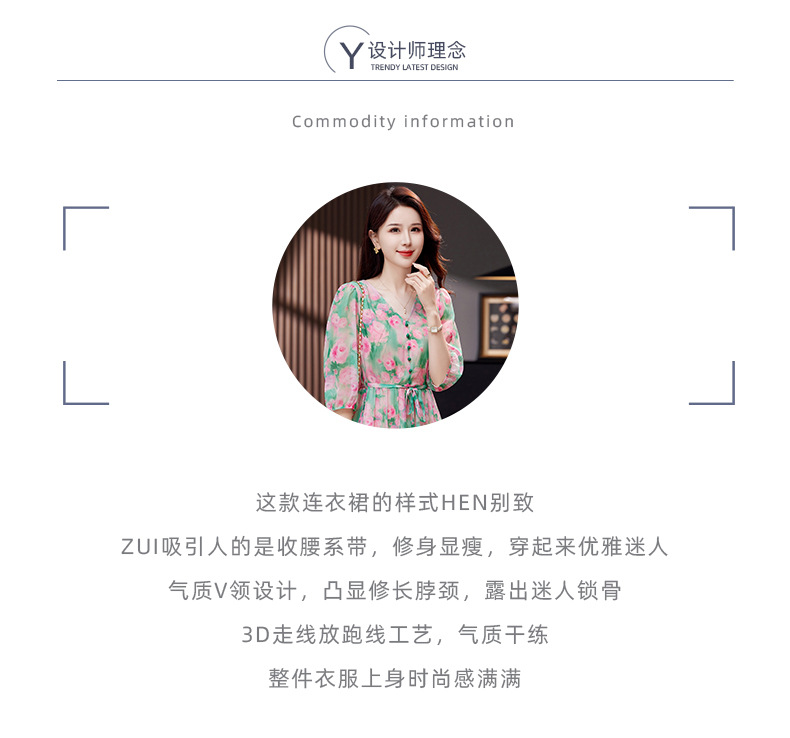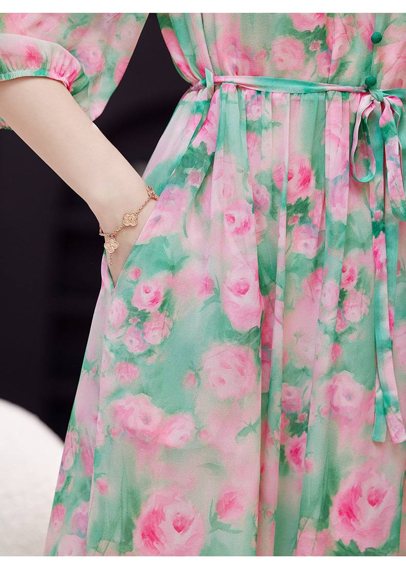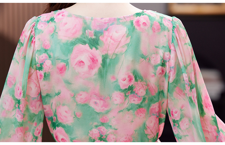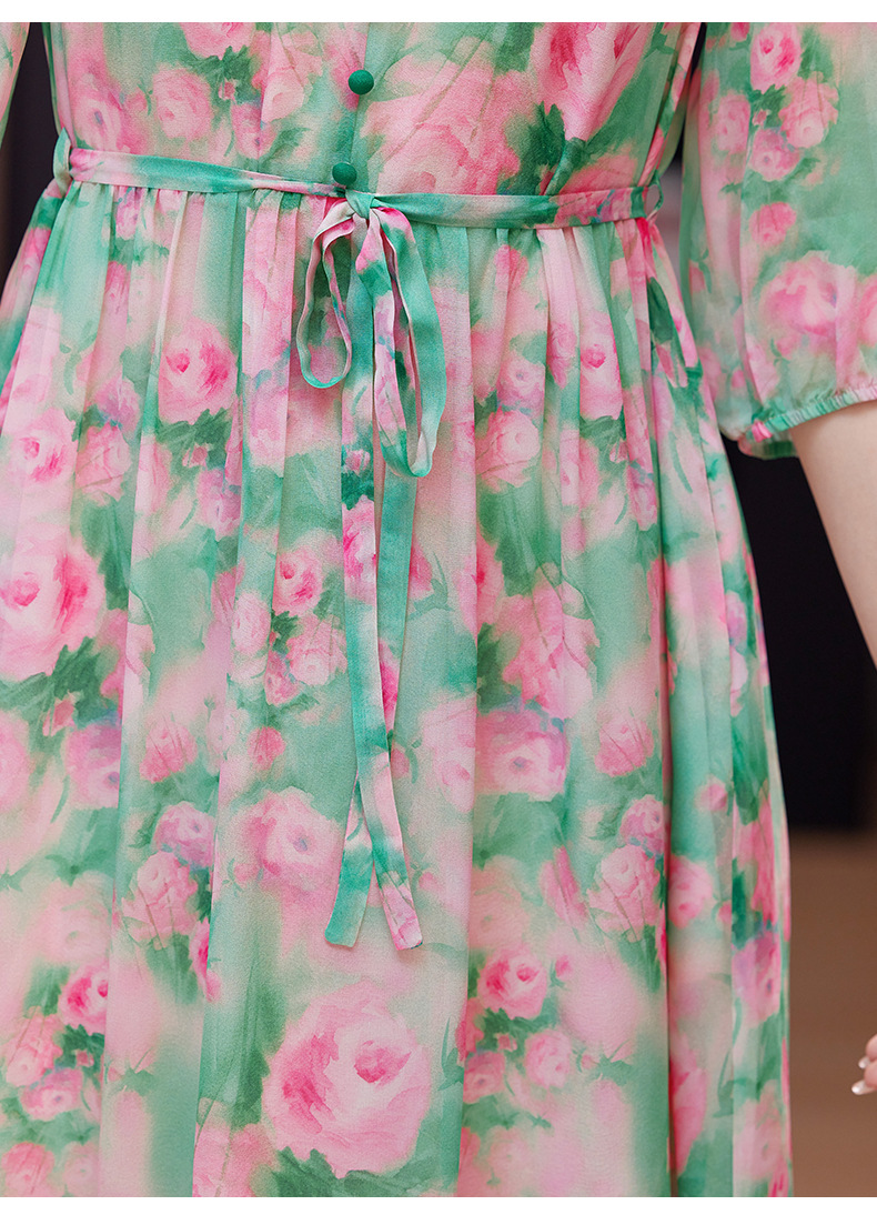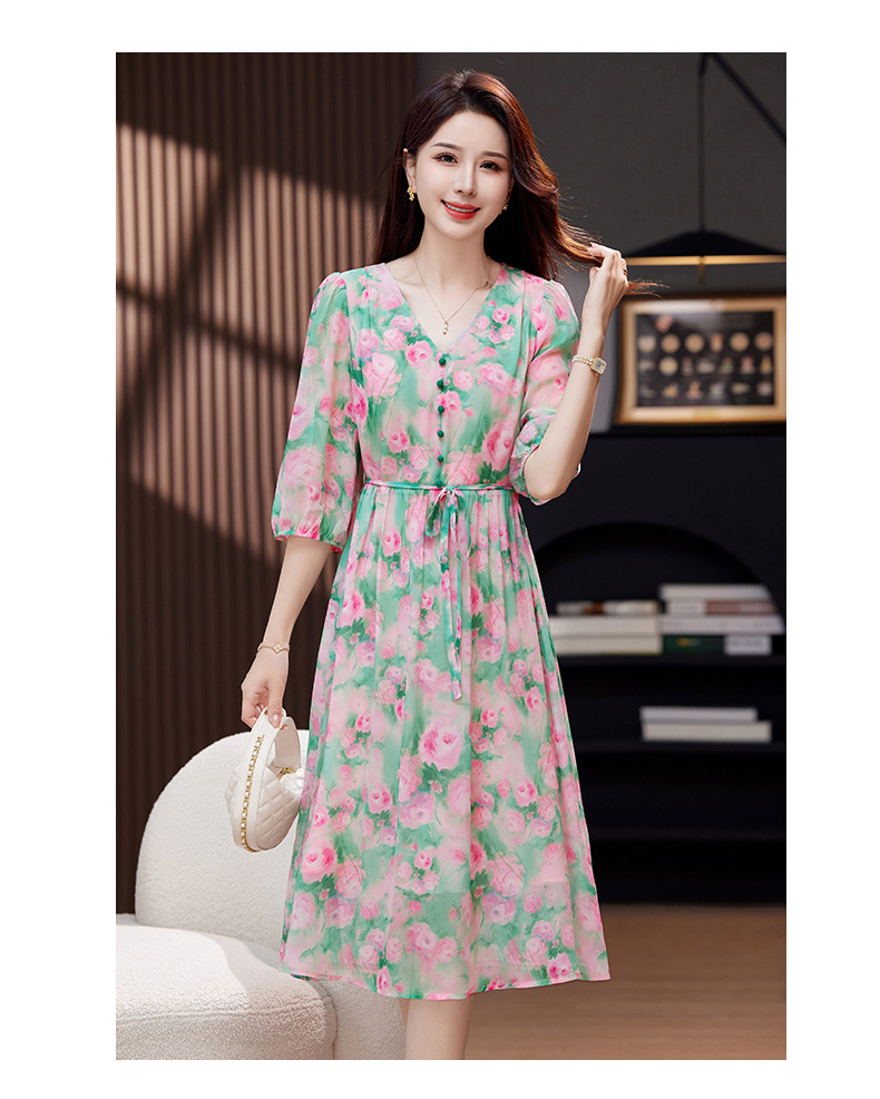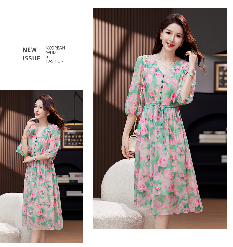 气质V领时尚印花,显瘦中长款桑蚕丝裙KQN- 9356