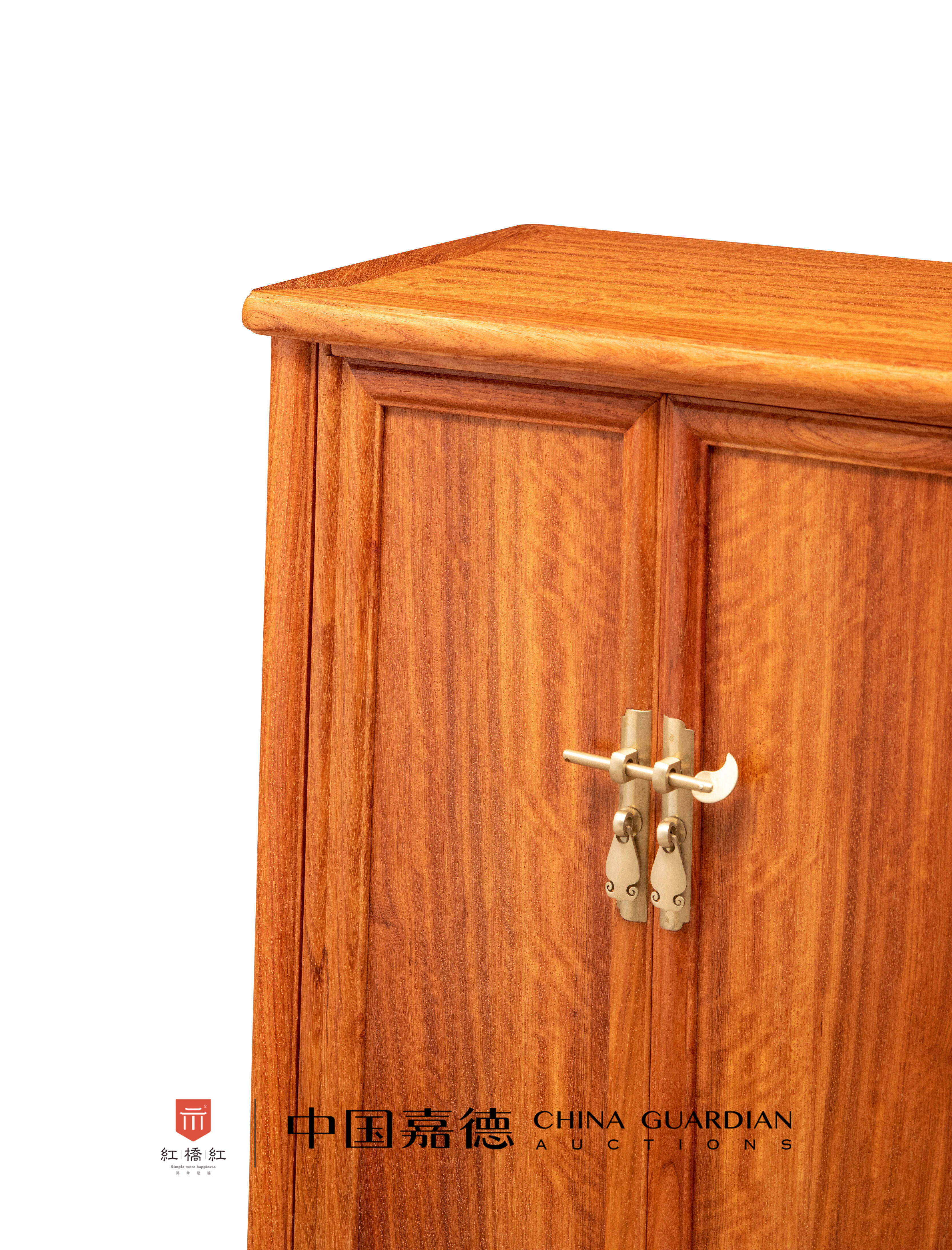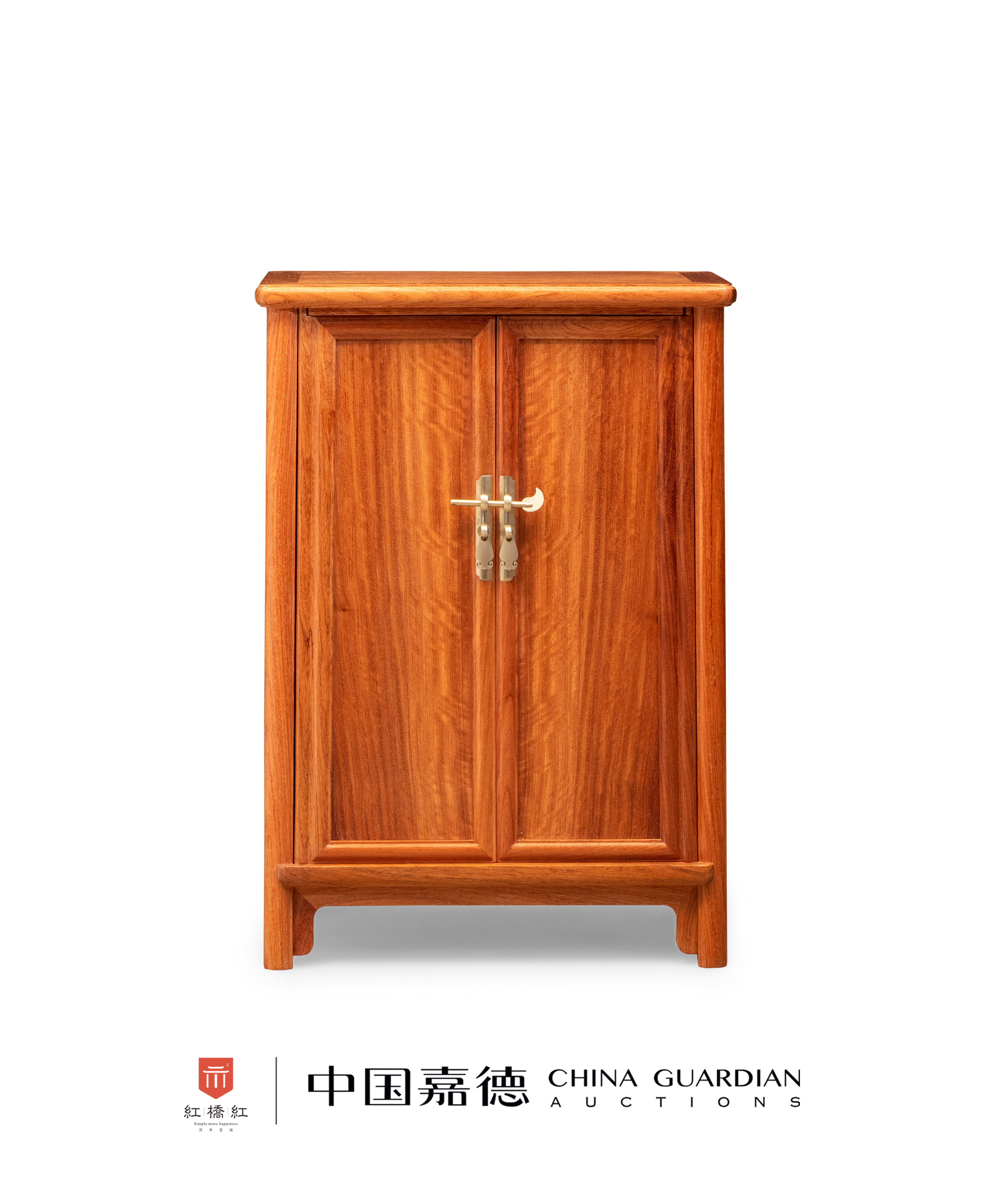 小圆角柜以缅甸花梨木制,整器呈A字型,无闩杆,硬挤门,侧脚显著。柜帽喷出,腿足圆材,纳入柜顶边框中,柜门攒框镶板而成,板心纹饰对称美观,柜门边上下两端伸出门轴,纳入柜身框上下的臼窝。柜门设如意云头形面叶及吊牌,可上锁。腿足间设光素刀牙板。