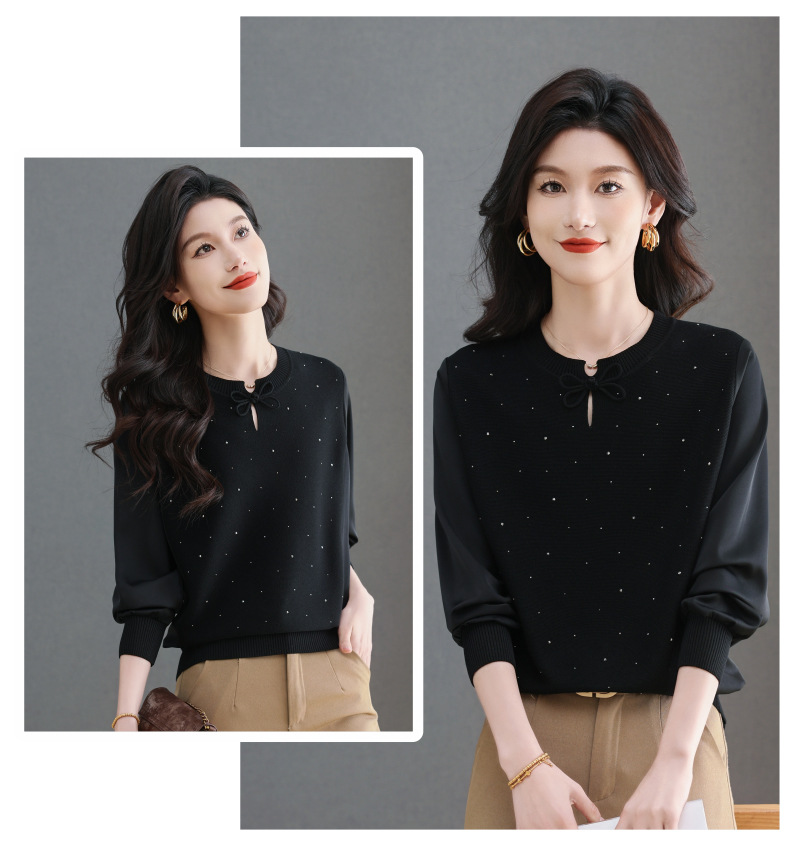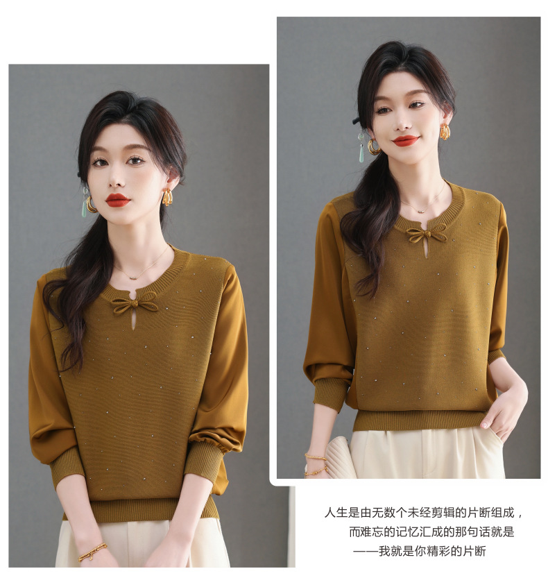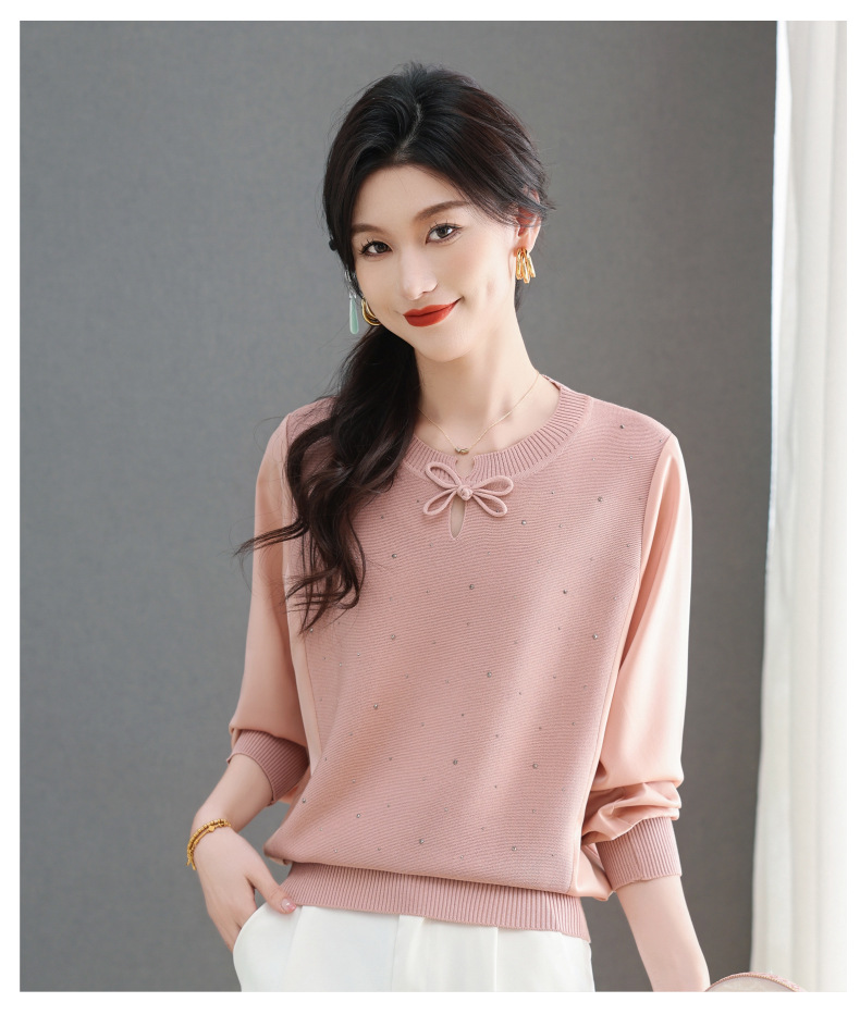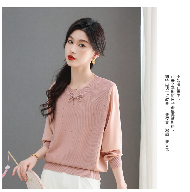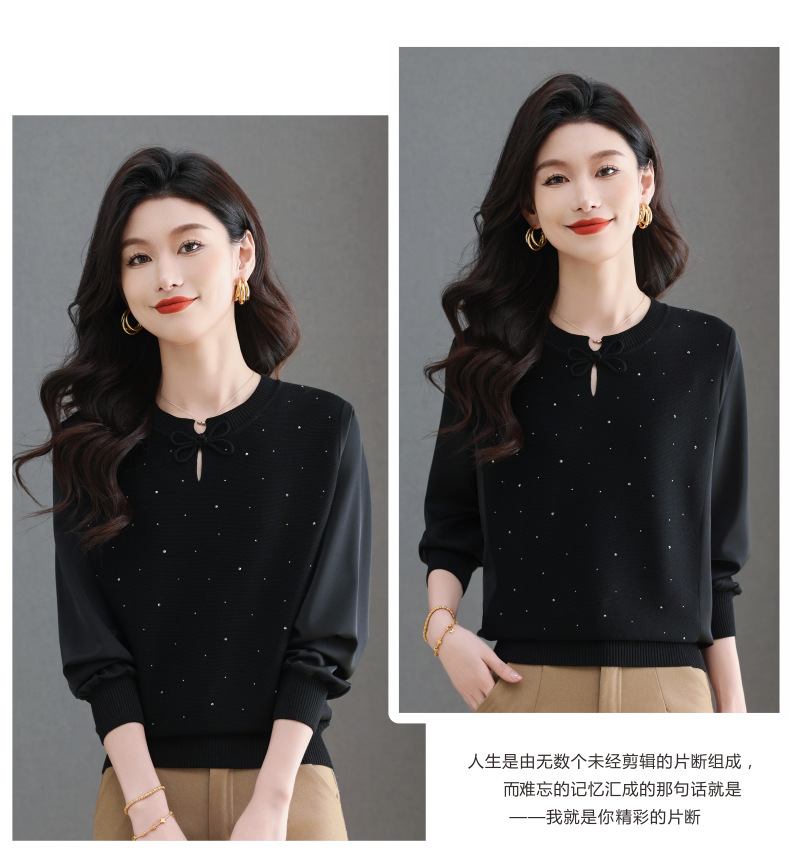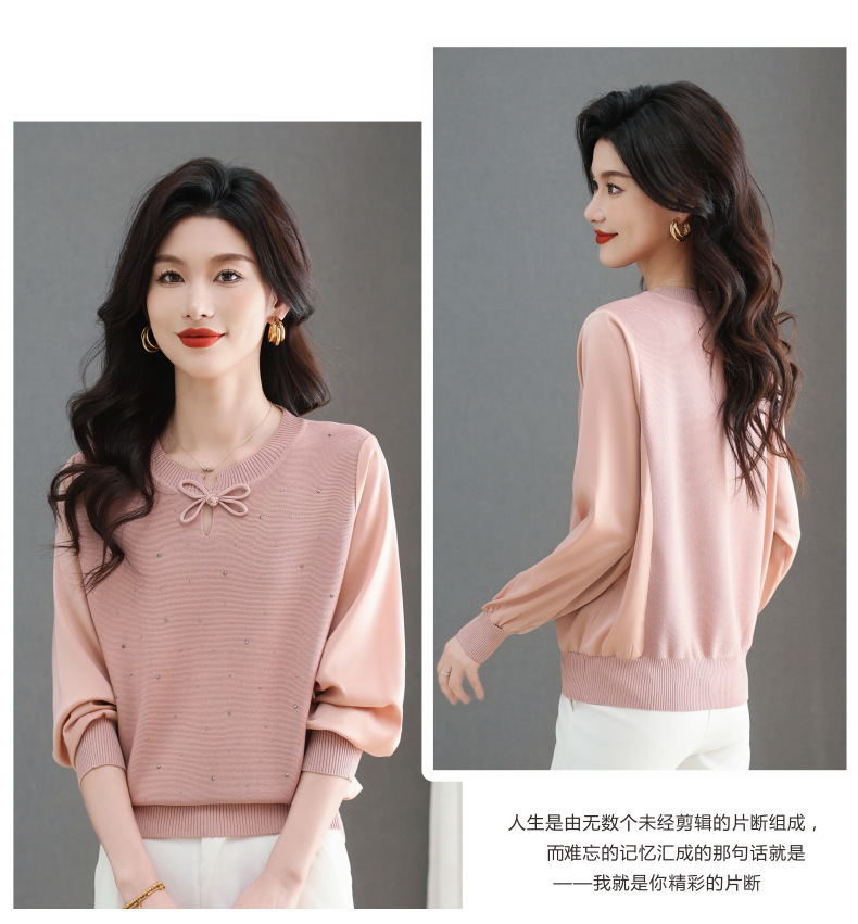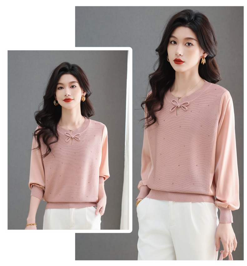 CC-5-6357洋气圆领镶钻长袖针织衫女士2025新款春秋宽松拼接遮肚雪纺上衣服