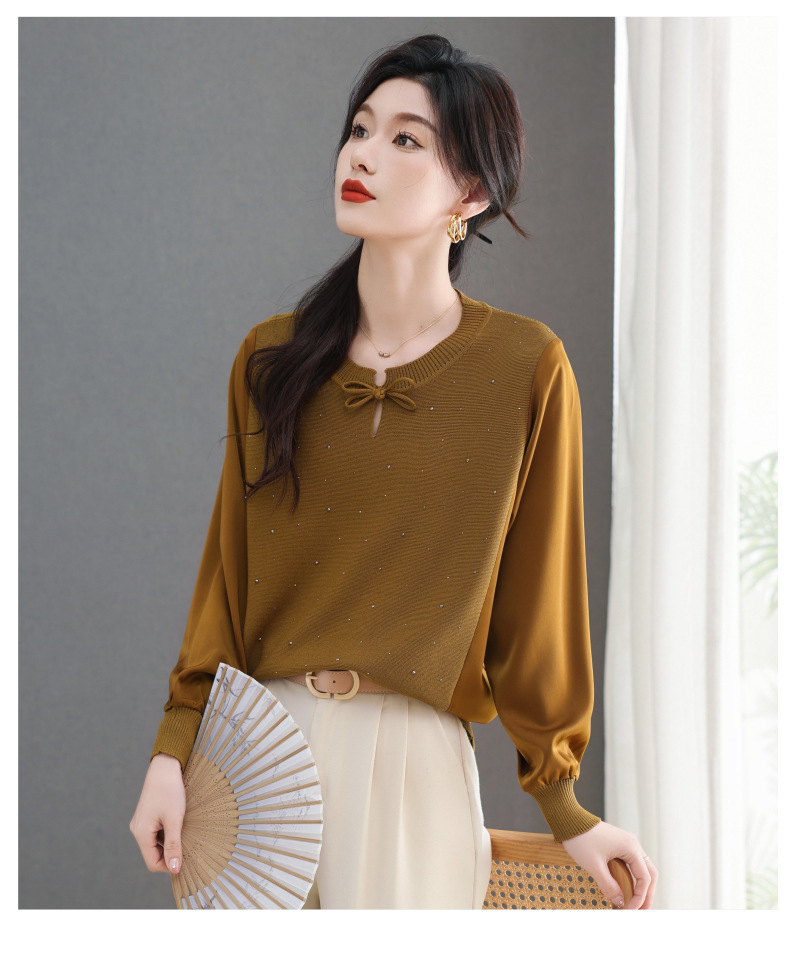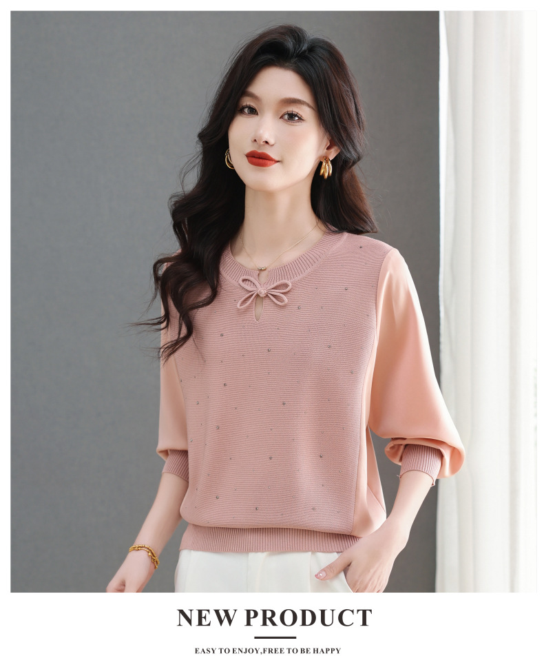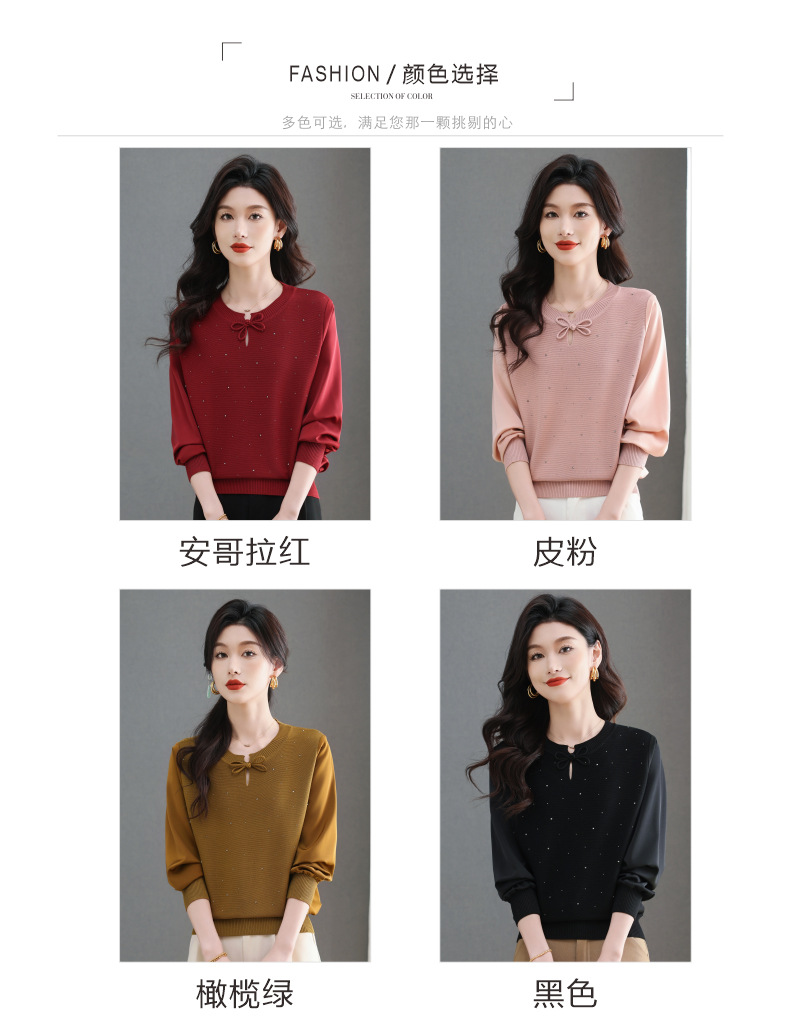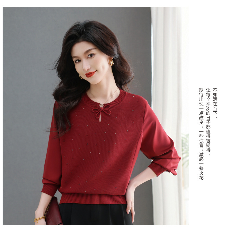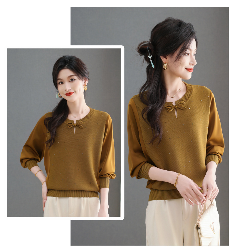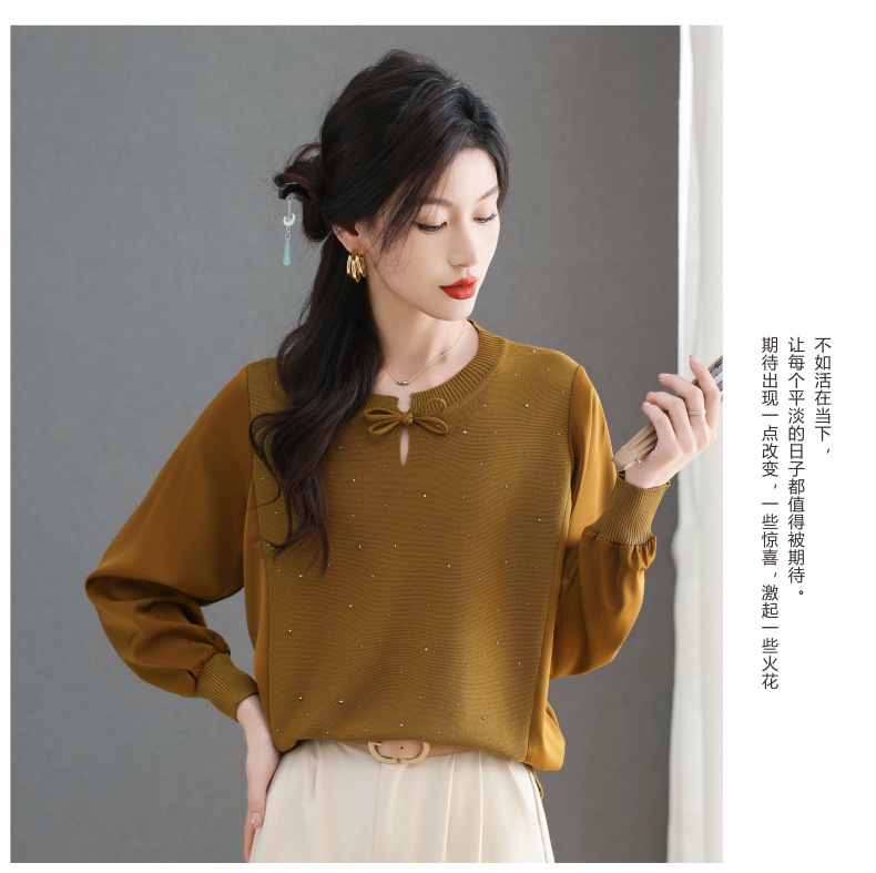 CC-5-6357洋气圆领镶钻长袖针织衫女士2025新款春秋宽松拼接遮肚雪纺上衣服
