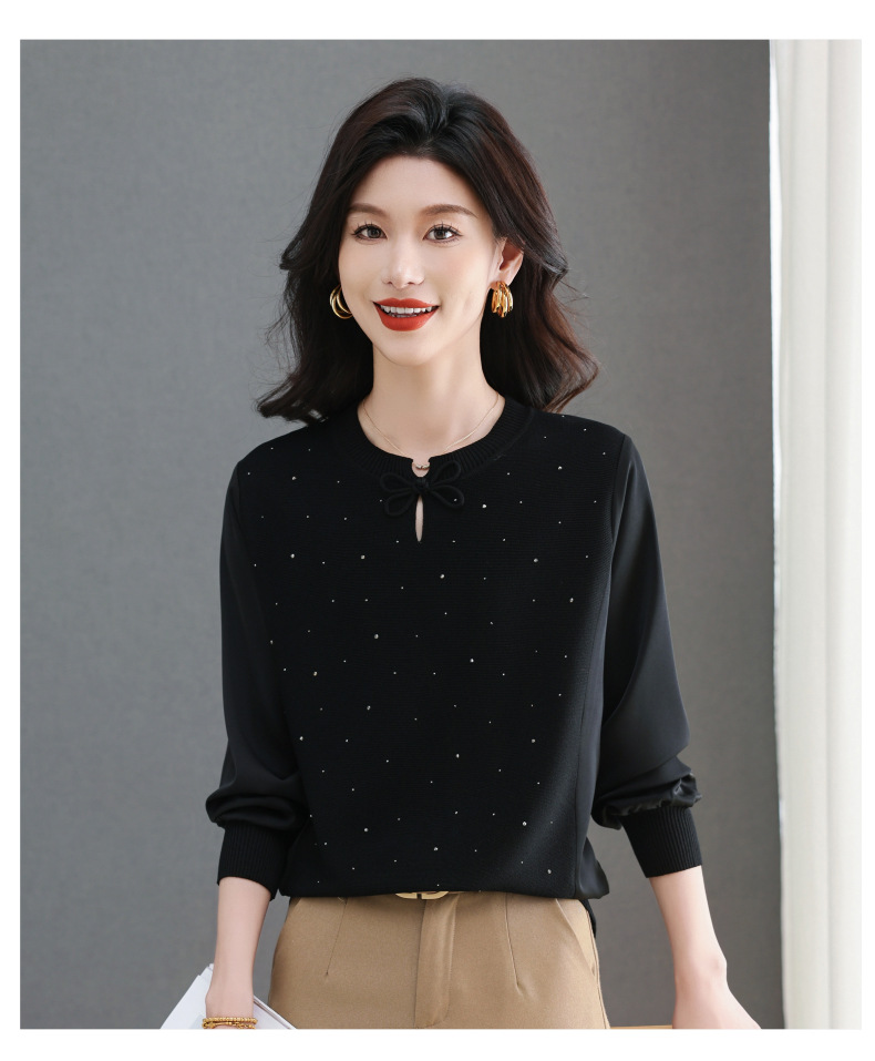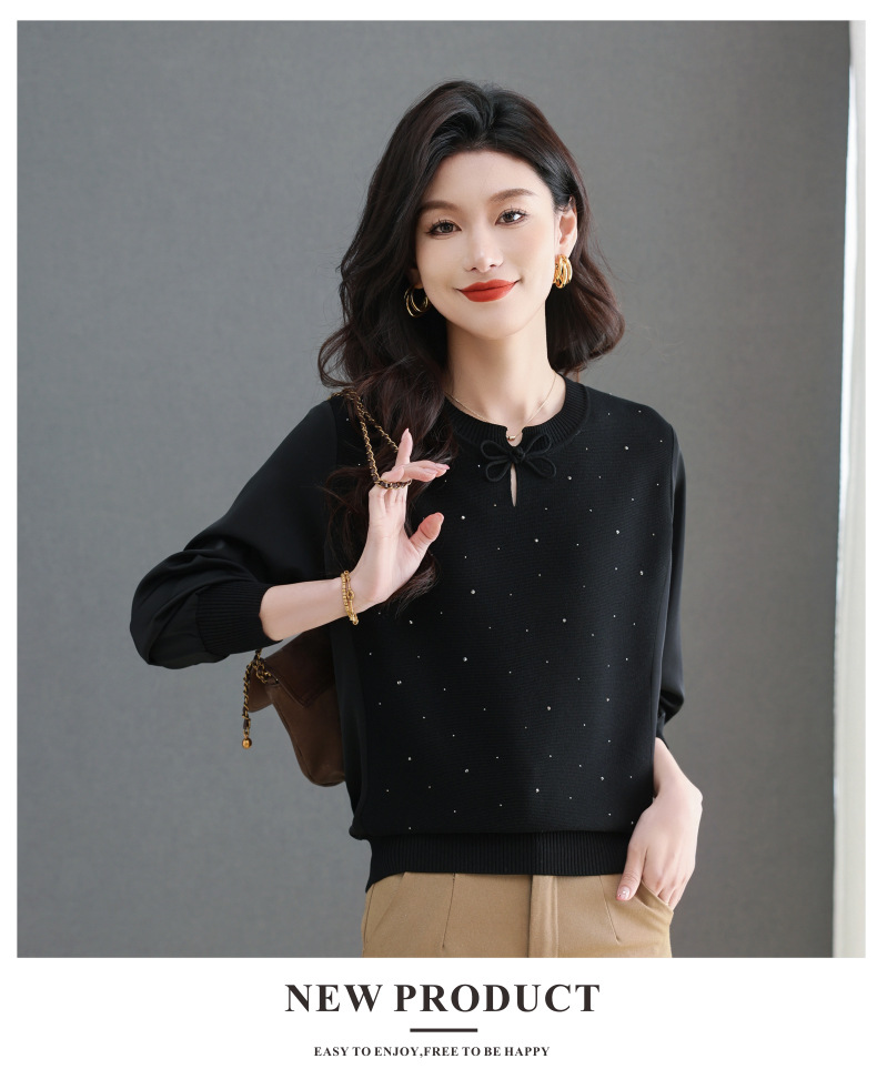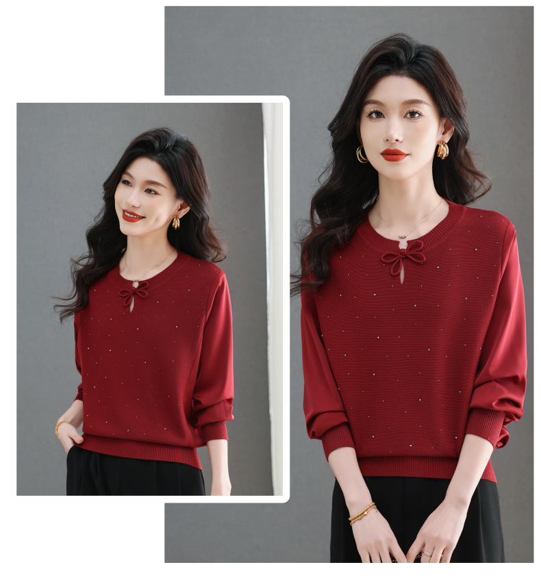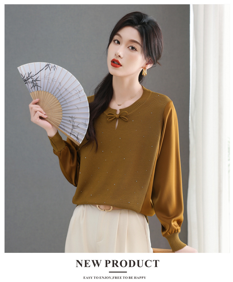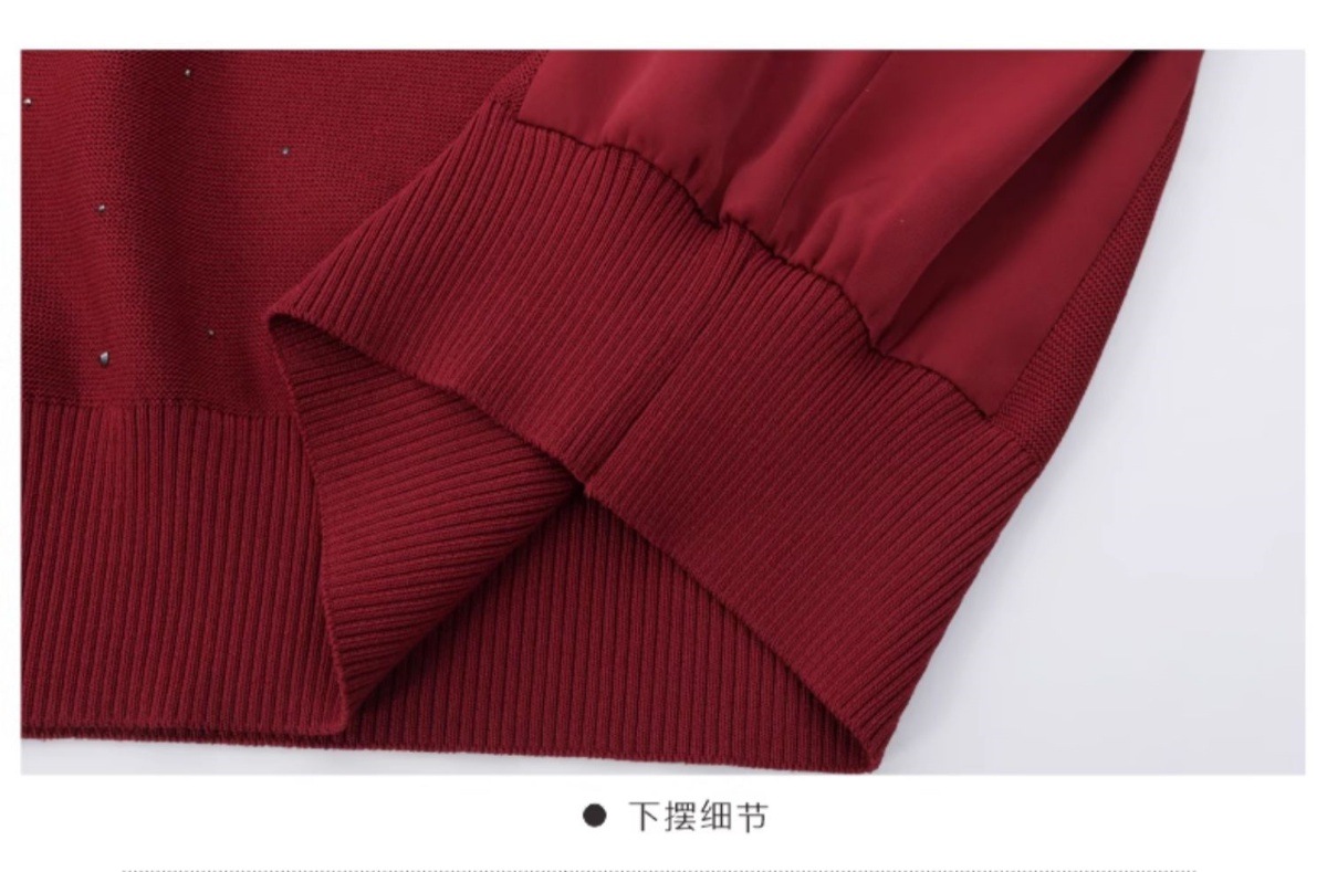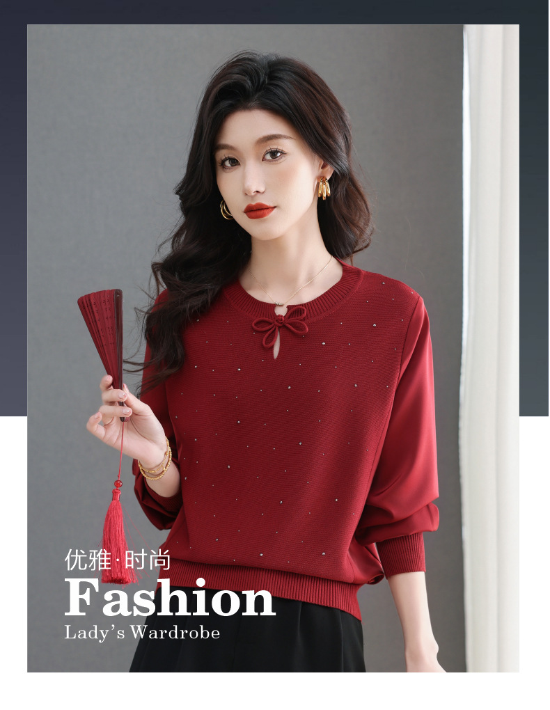 CC-5-6357洋气圆领镶钻长袖针织衫女士2025新款春秋宽松拼接遮肚雪纺上衣服