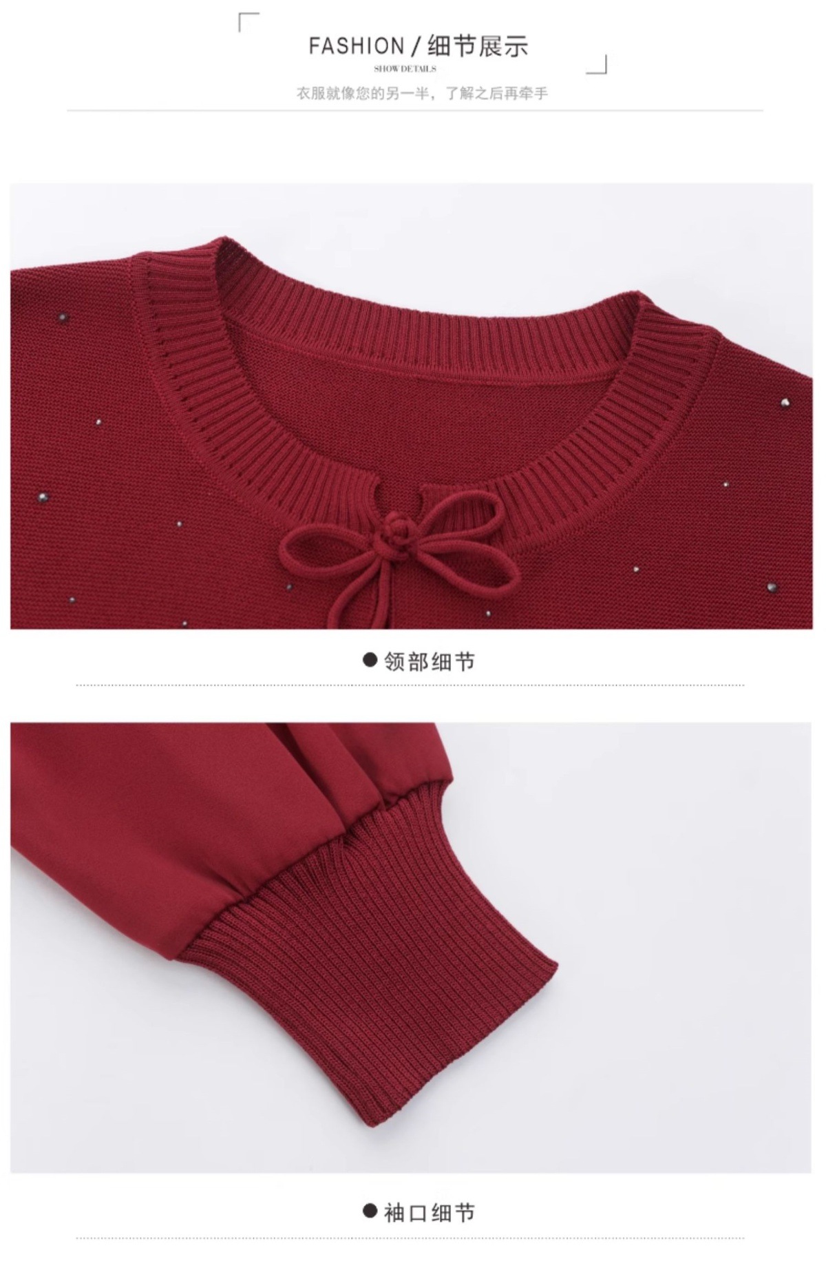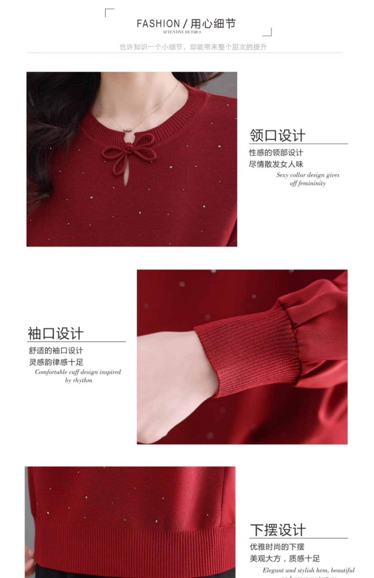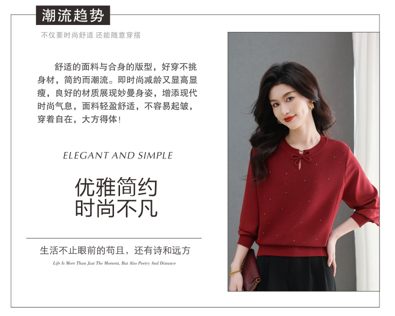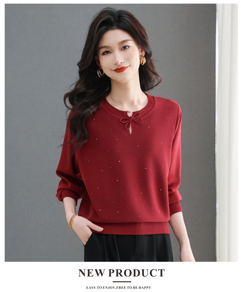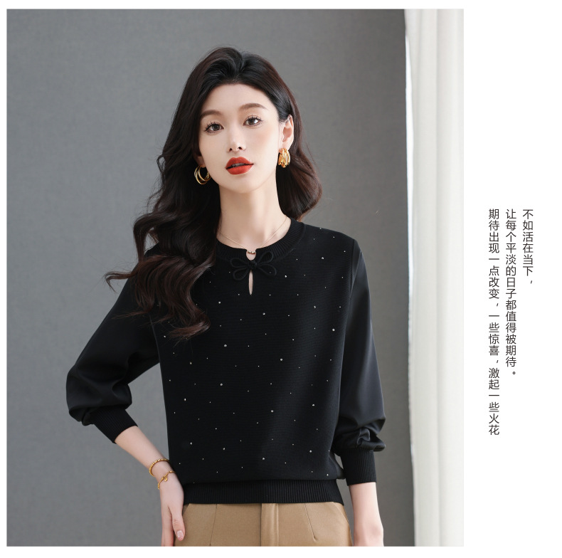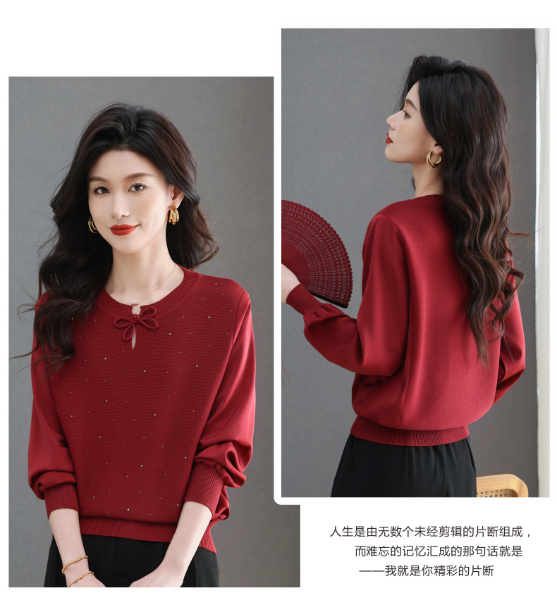 CC-5-6357洋气圆领镶钻长袖针织衫女士2025新款春秋宽松拼接遮肚雪纺上衣服