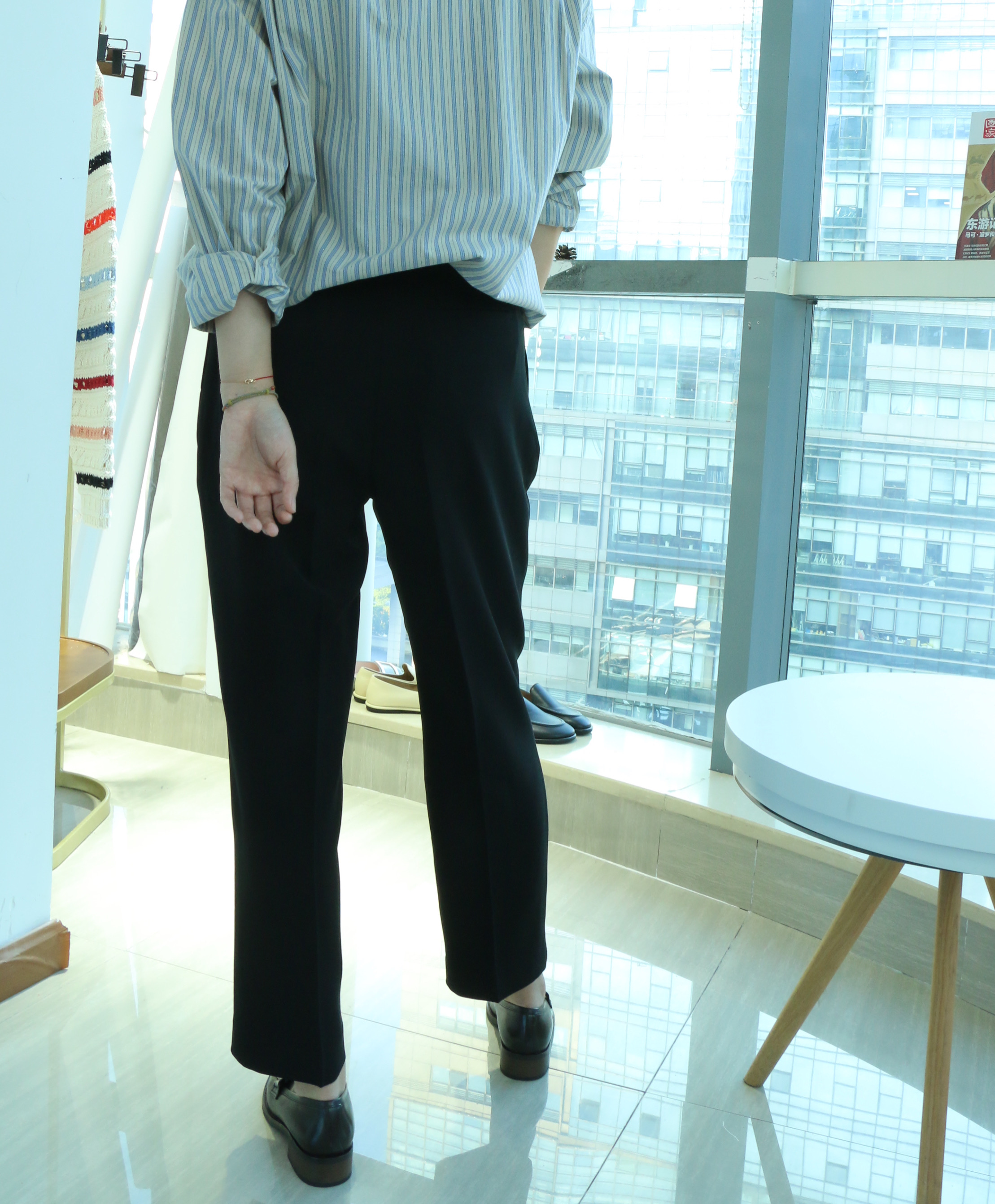 高腰9分锥形裤型,简单利落,显腿直,对梨形身材友好