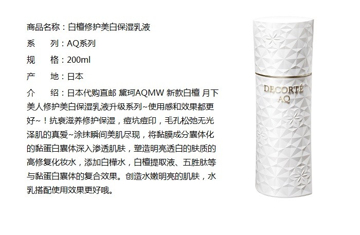 日本黛珂白檀升级版乳液 新AQ系列渗透乳化妆水 清爽型乳液