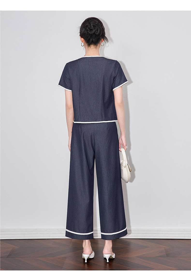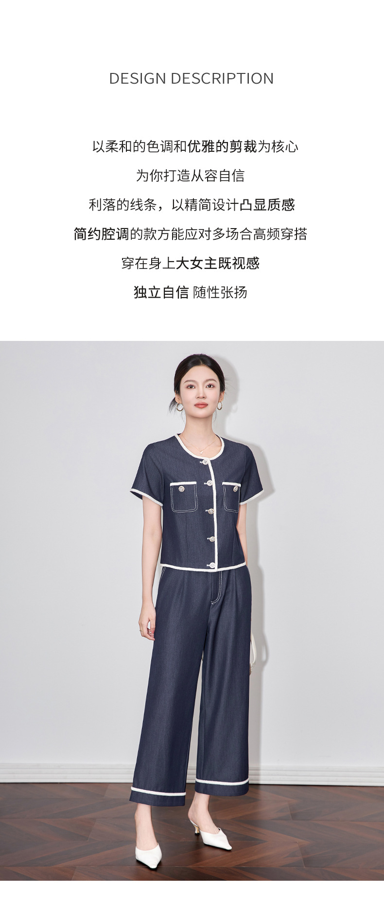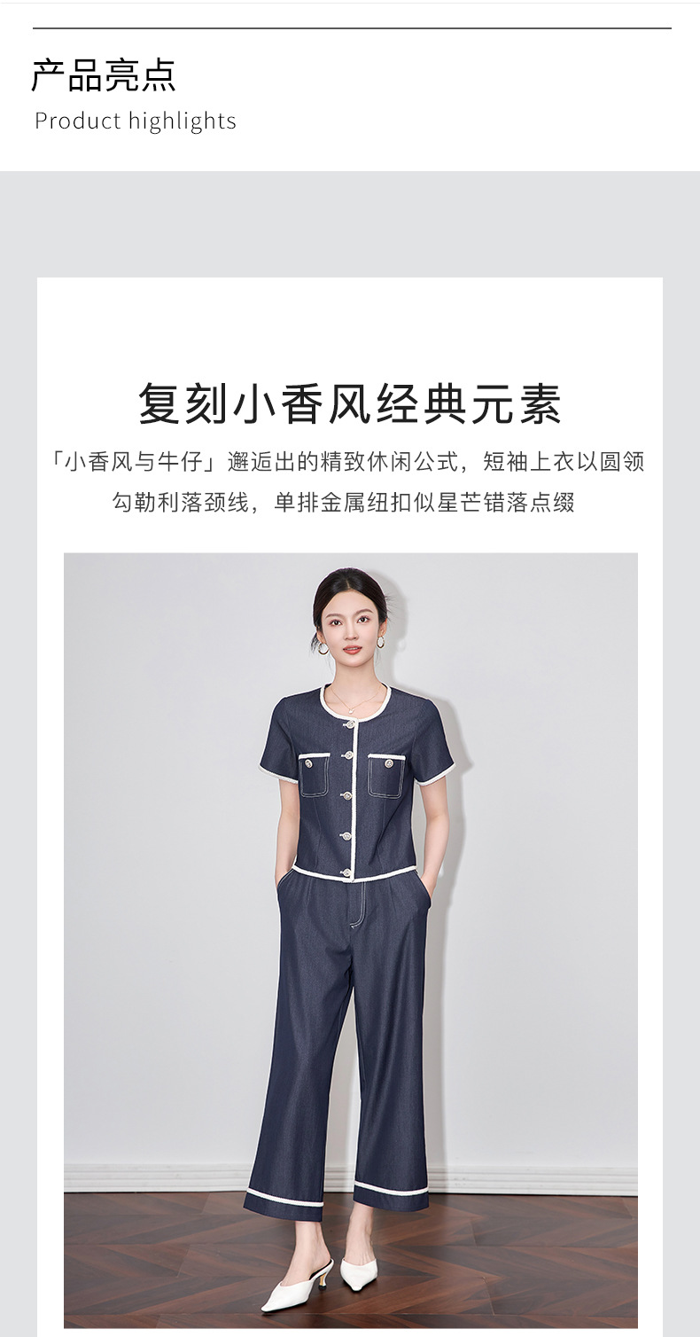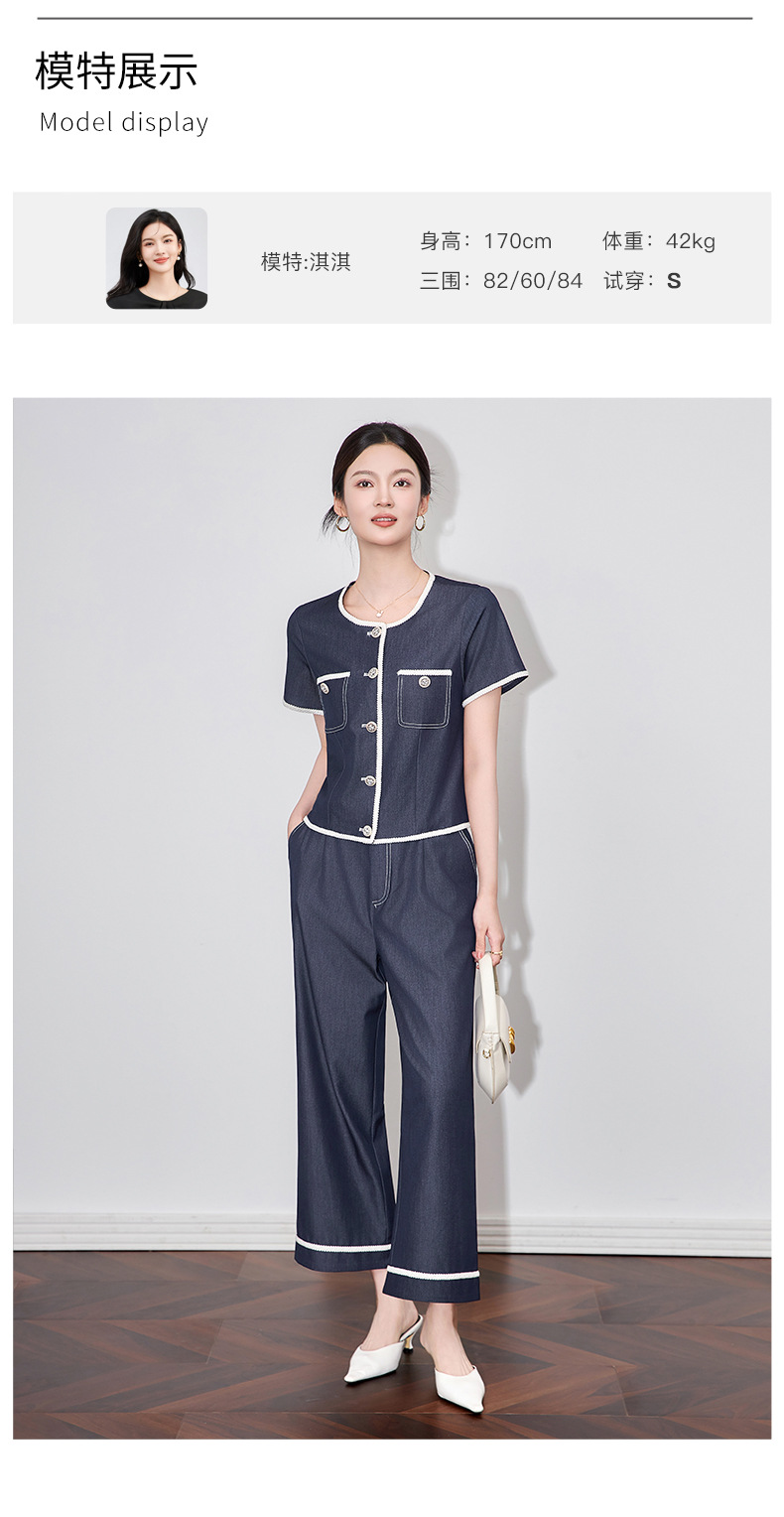 「高货wl」全新升级【铂金会员404/天猫539/差价135】(99901)洛诗琳夏季时尚撞色花边天丝竹节牛仔上衣牛仔裤套装女