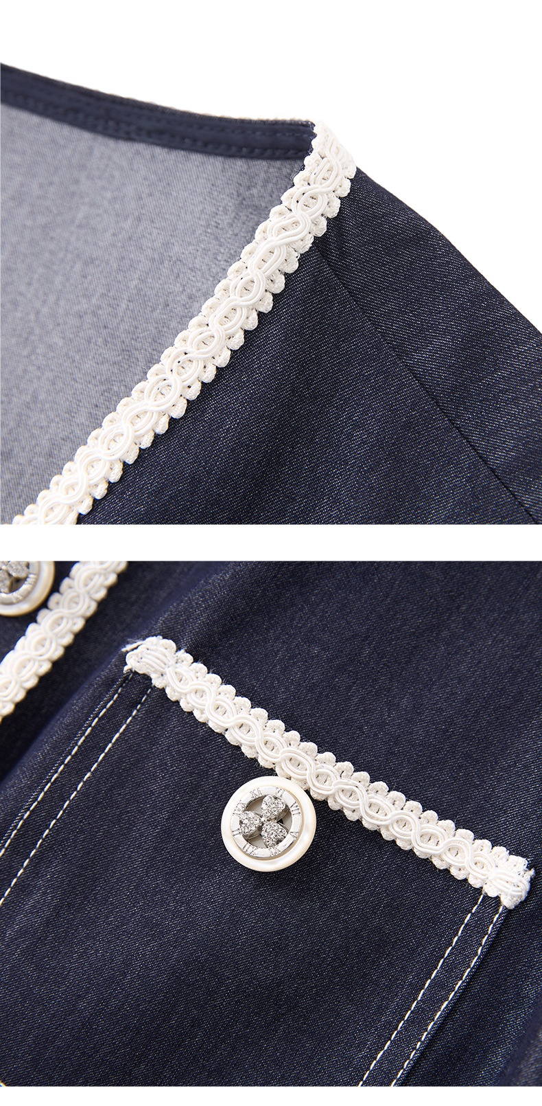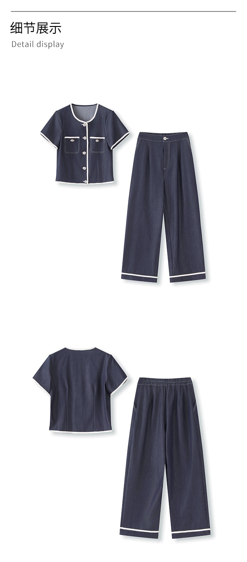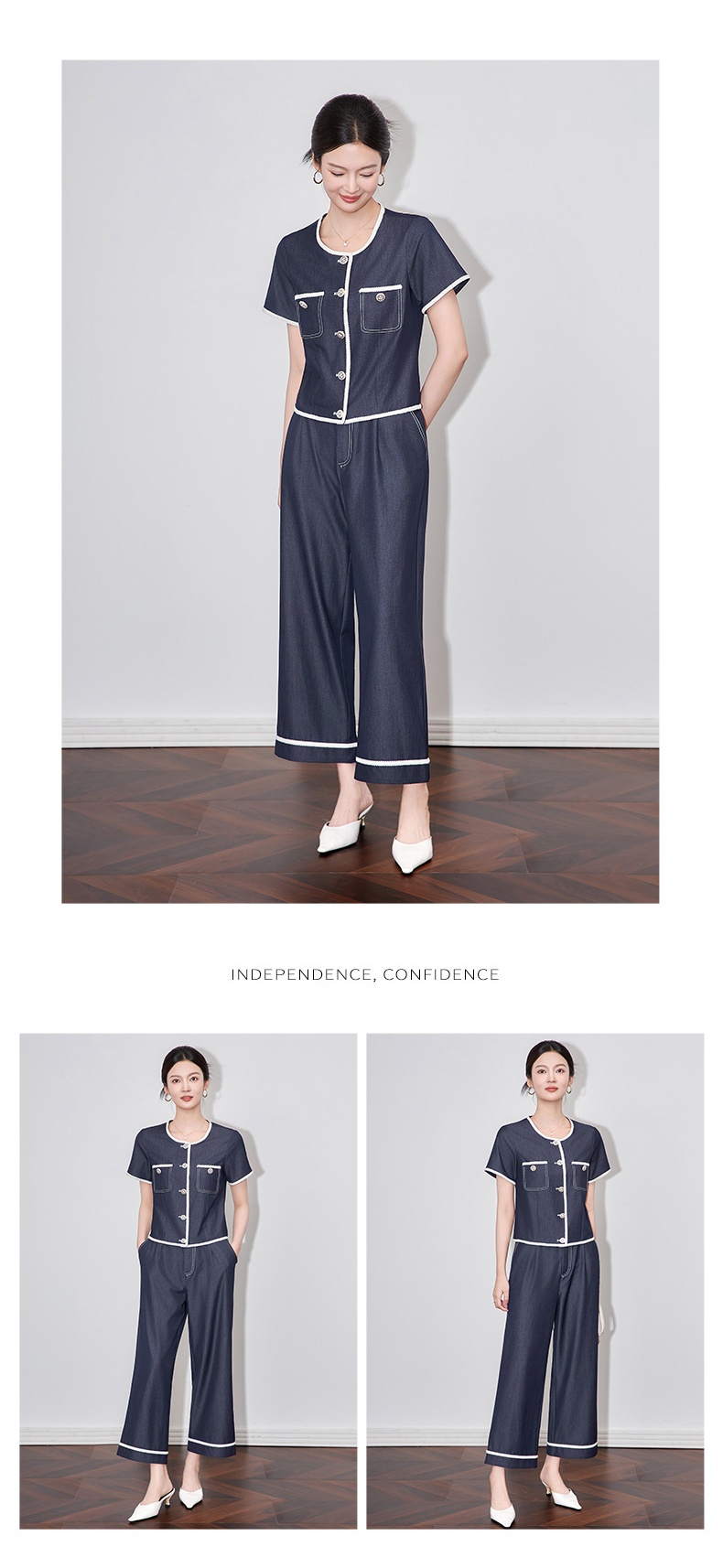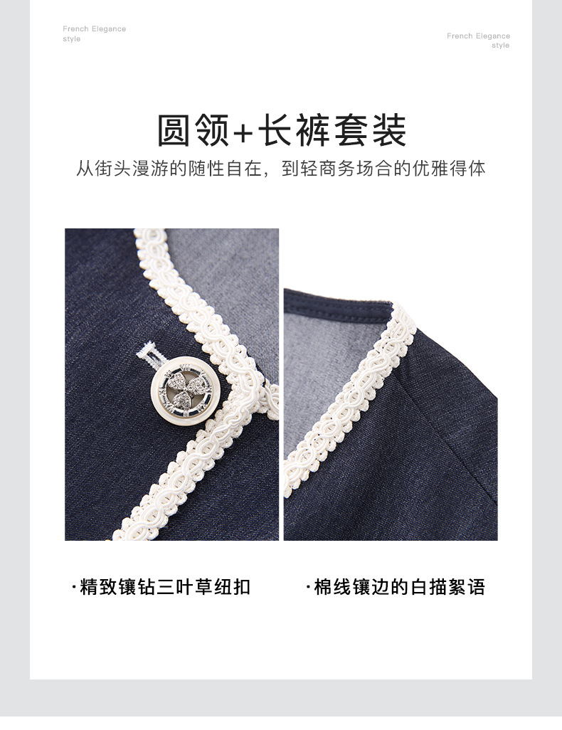 「高货wl」全新升级【铂金会员404/天猫539/差价135】(99901)洛诗琳夏季时尚撞色花边天丝竹节牛仔上衣牛仔裤套装女