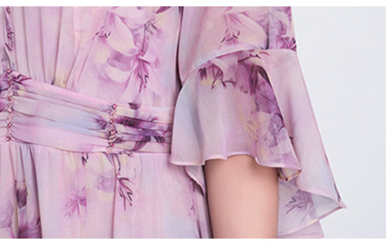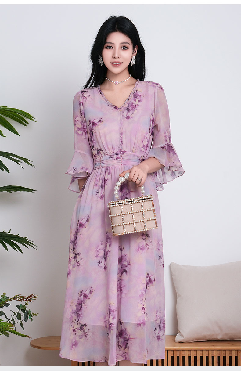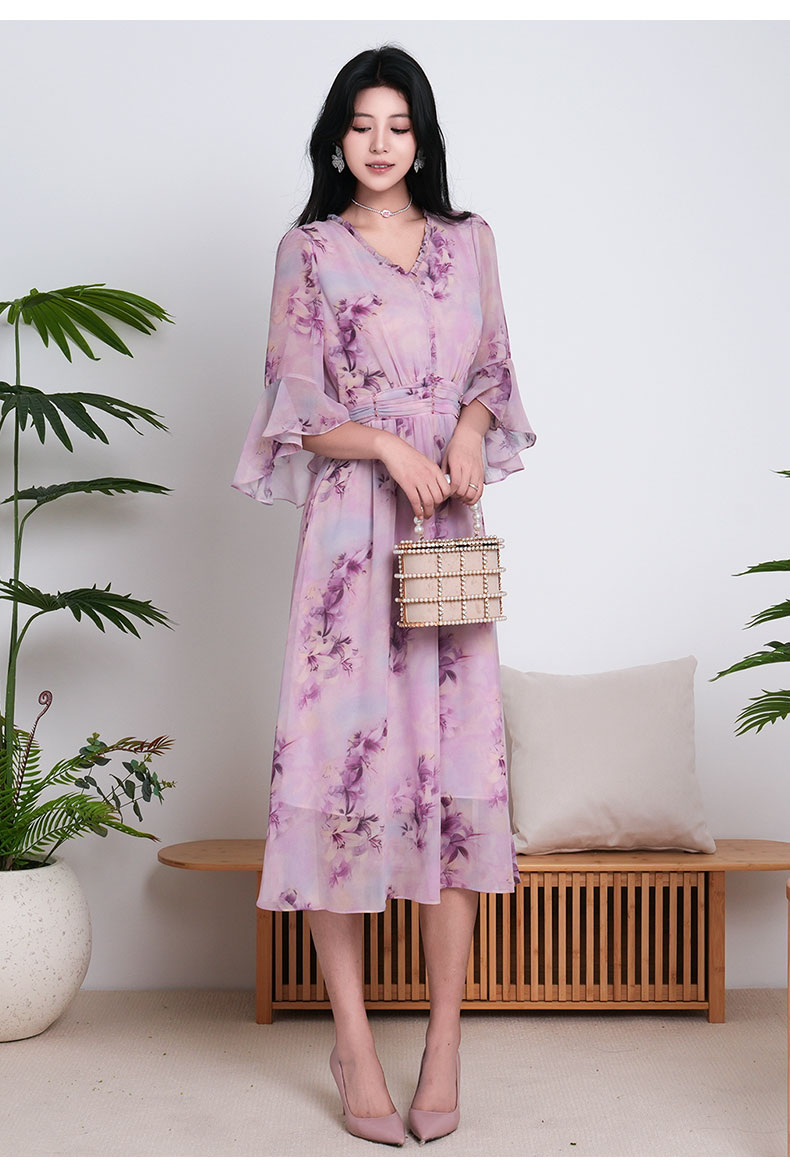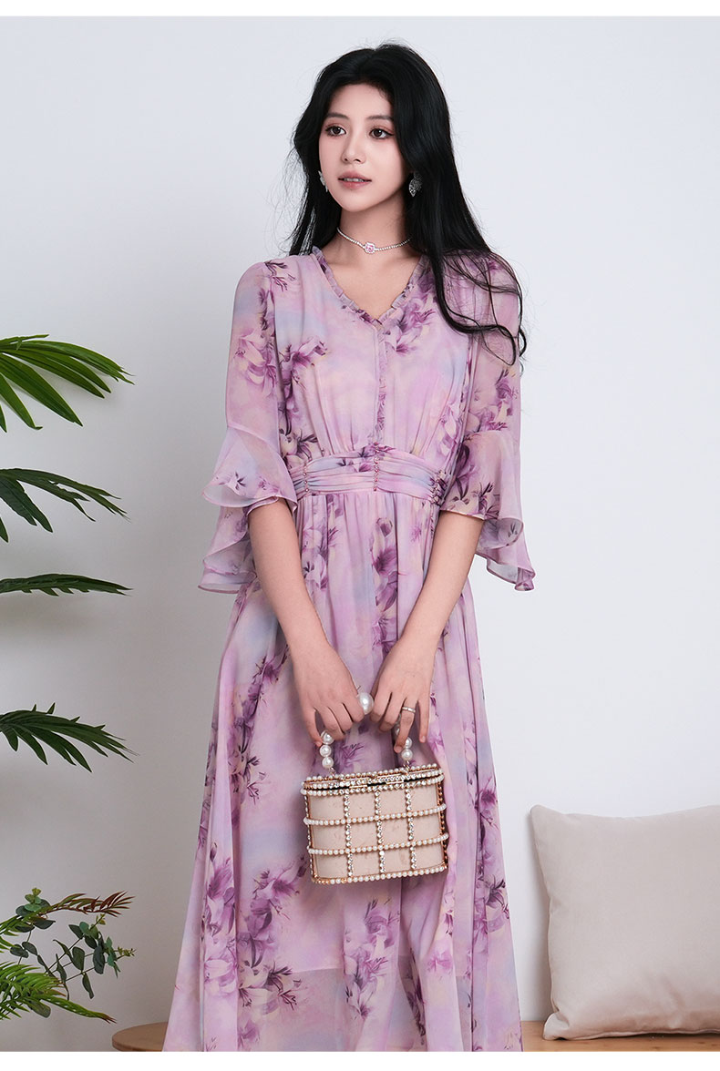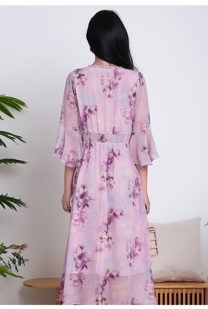 乔万尼新品大女主气质粉韵水彩印花V领收腰连衣裙ED2E521
