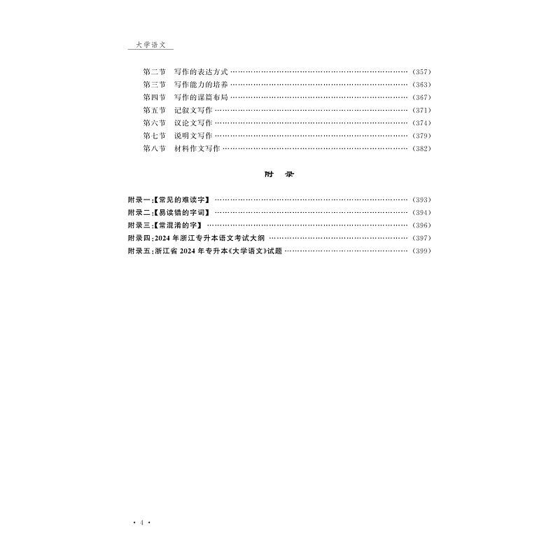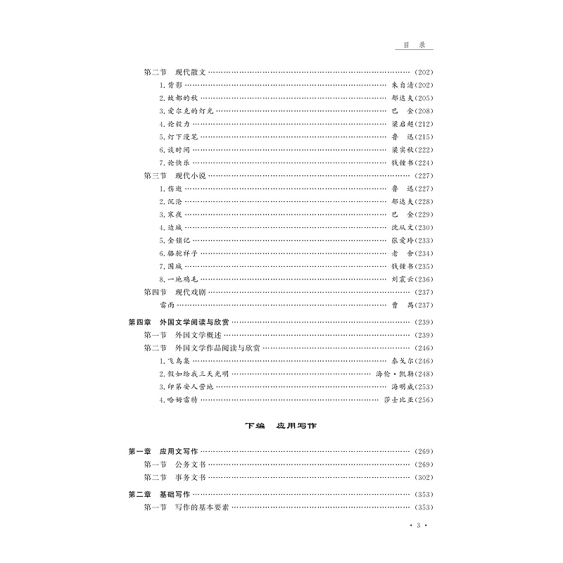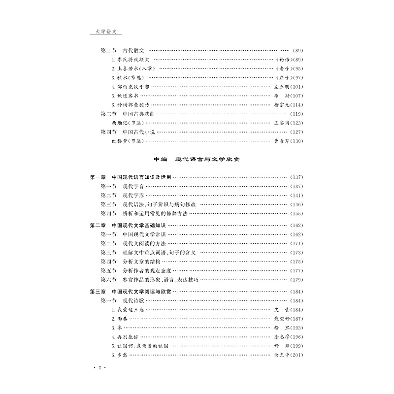 本教材为普通高校非中文专业通用教材,并结合浙江省专升本考试大纲编写而成。本教材的编写讲求大学语文的工具性和人文性的有机结合,涵盖了语言基础、文学鉴赏和实用写作三部分内容。教材的基本内容由三编组成:上编 中国古代文学部分:包括古代文学基础知识和中国古代文学阅读与欣赏。其中基础知识部分涵盖文言实词、文言虚词、 文言句式、文言文翻译等;阅读与欣赏部分涵盖古代诗词曲赋古代诗词曲赋、古代散文、古代小说、古代戏剧等赏析篇目。中编 现代语言与文学欣赏:包括中国现代语言知识及运用和文学作品欣赏。其中现代语言部分涵盖现代字音、现代字形、 现代语法(句子辨识并修改病句)、辨析和运用常见的修辞方法等;现代文学阅读与欣赏涵盖现代诗歌、现代散文、议论文 、现代小说、现代戏剧、外国文学作品赏析等。下编 应用与写作部分:包括应用写作和基础写作。其中应用写作涵盖公务文书和事务文书;基础写作主要是记叙文、议论文和说明文的写作方法。每节课后有拓展练习及其参考答案等。