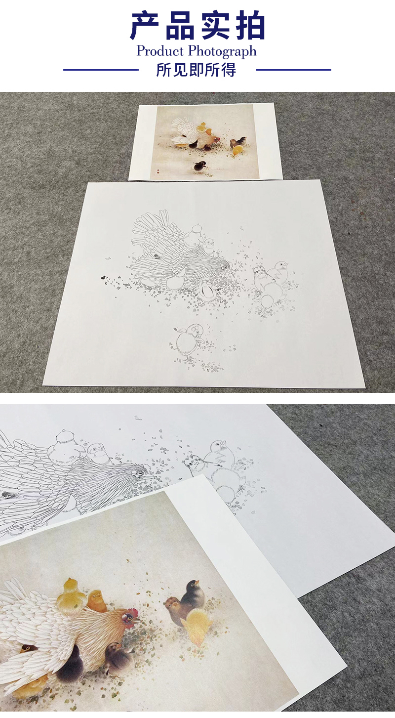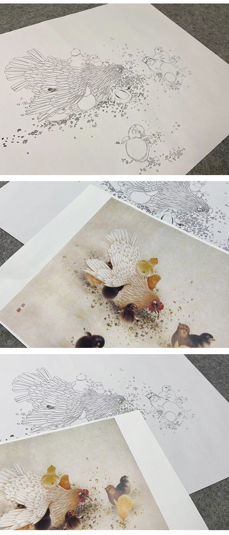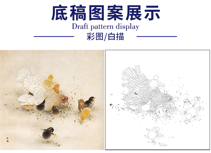 【无步骤】李长白工笔花鸟画白描底稿《母与子》母鸡鸡雏-斗方小品册页-LB10