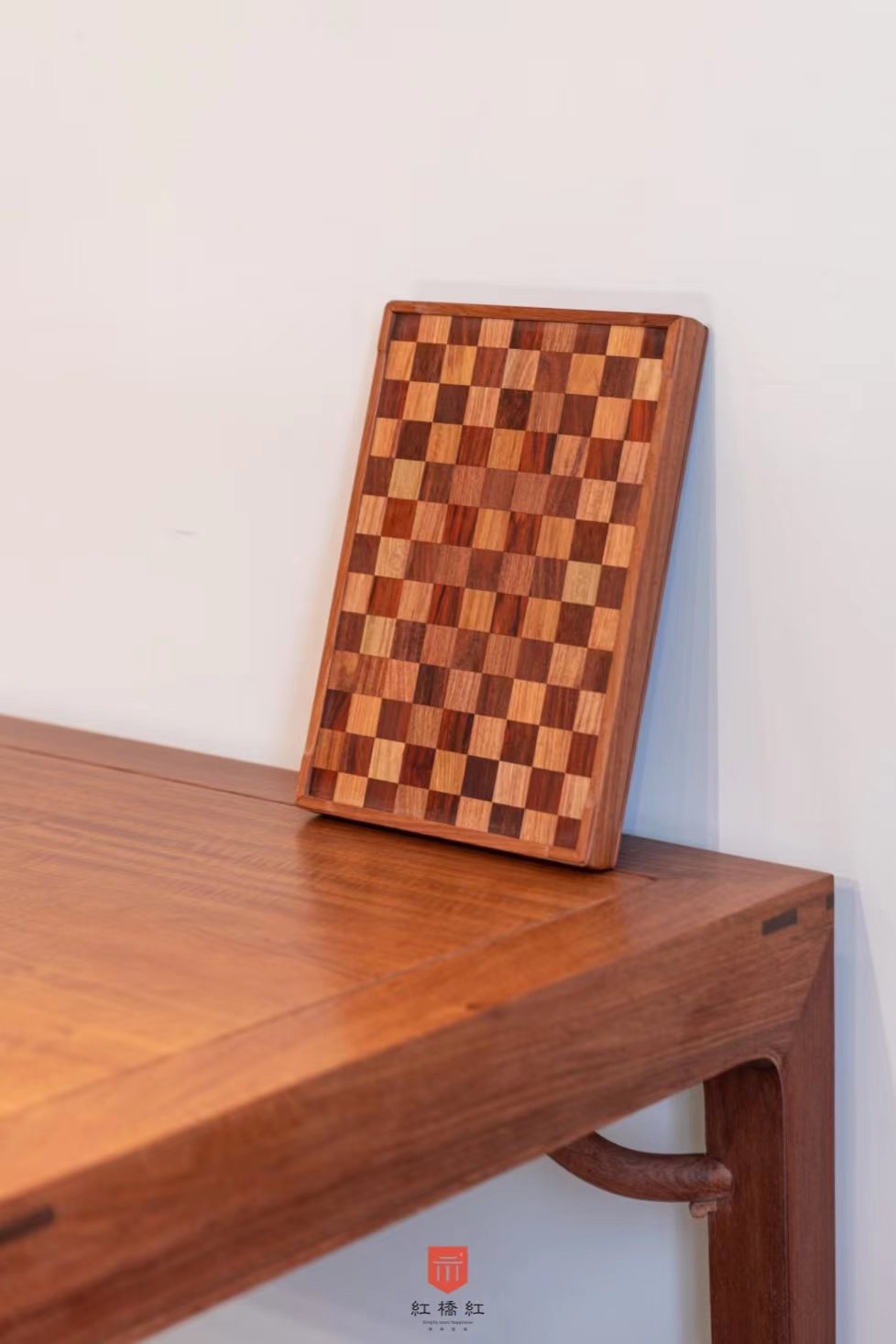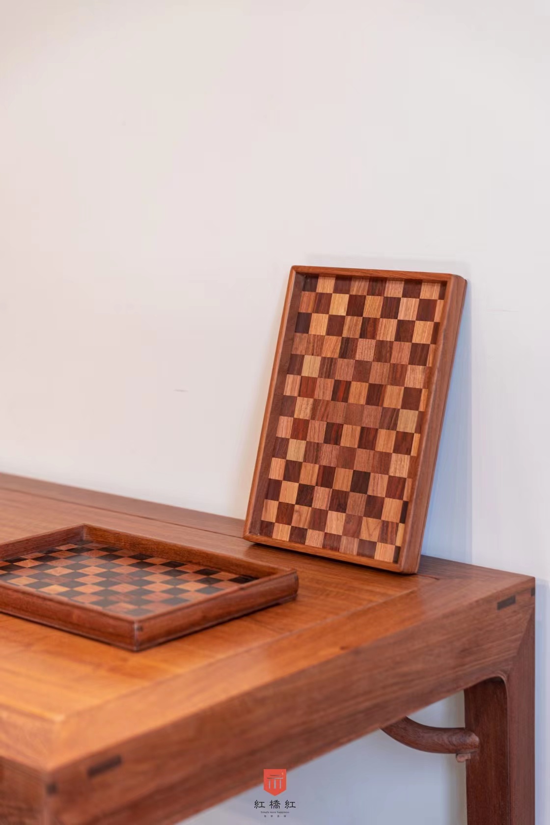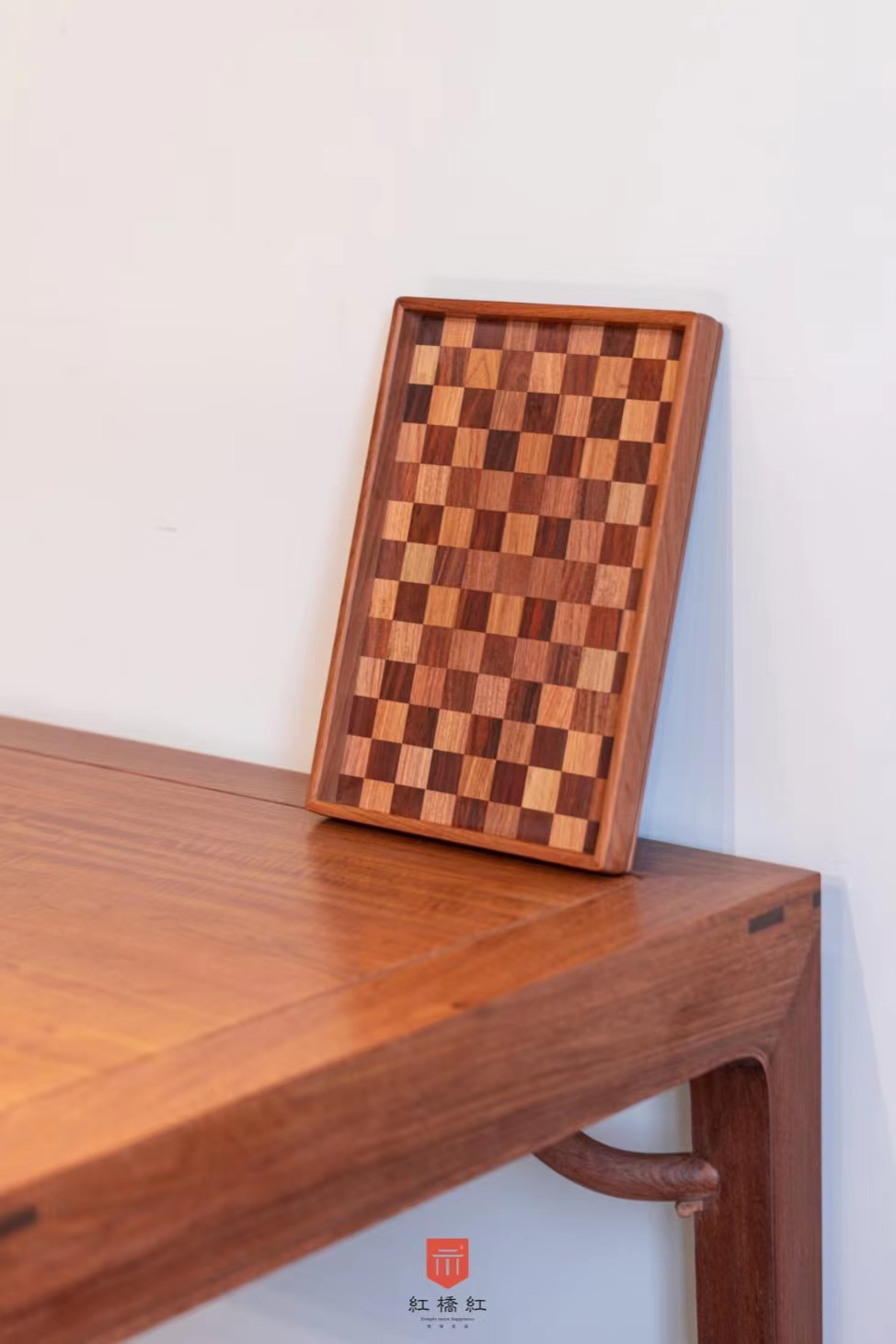文盘以素净文雅为美,此器四边攒框相接,底部采用缅甸花梨精品二膘料木块,和紫光檀(东非黑黄檀)或血檀木块,赞成田字纹,制作考究,榫卯之妙用,牢固的必然彰显,皆凝聚于其中。即使只用于盛放瓜果茶点,也可回望那份文人心及器物所带来的温度。