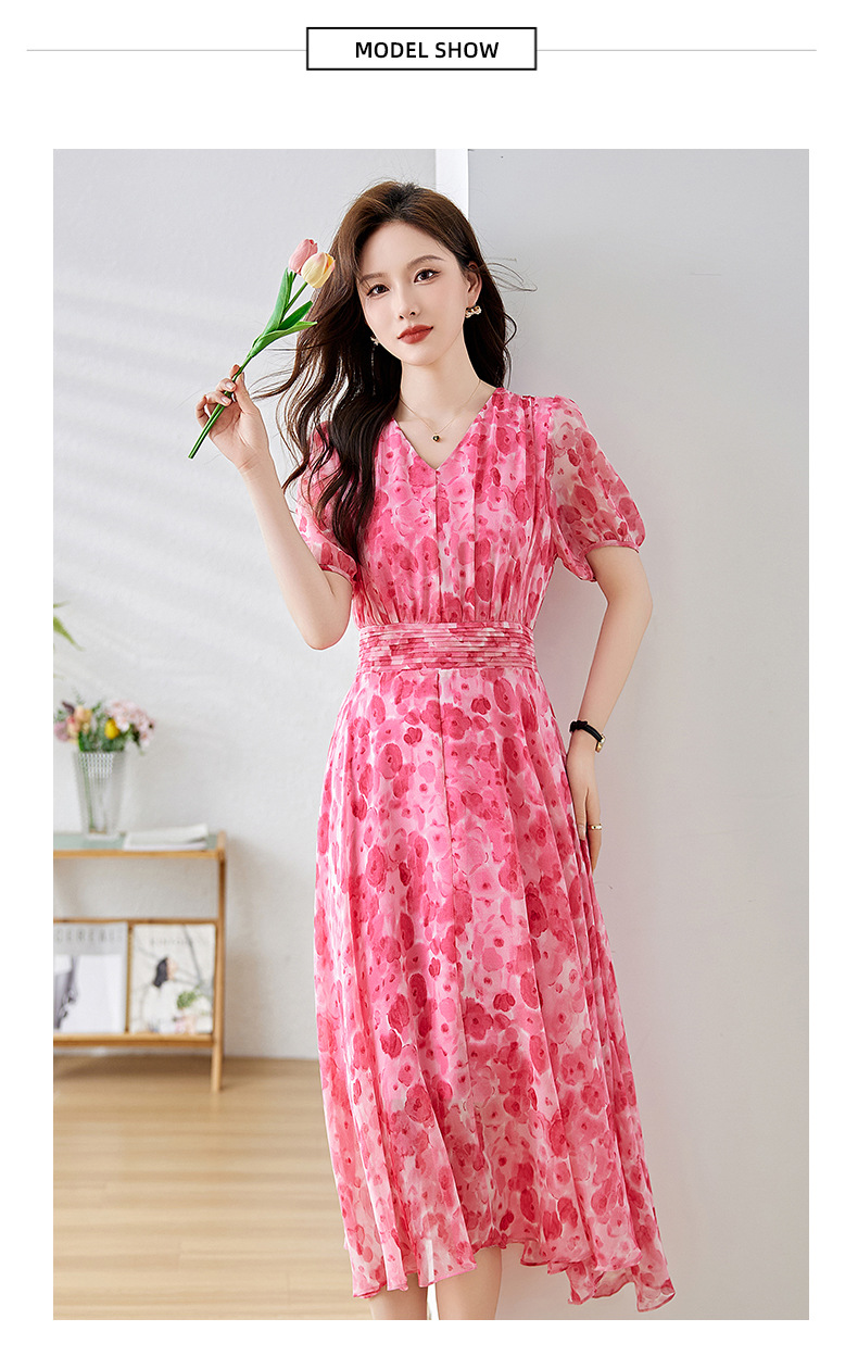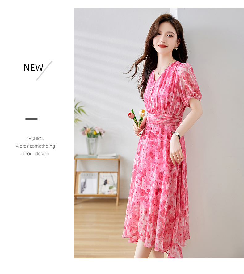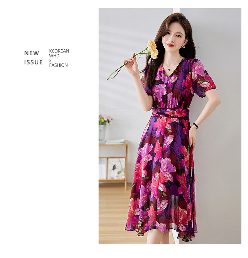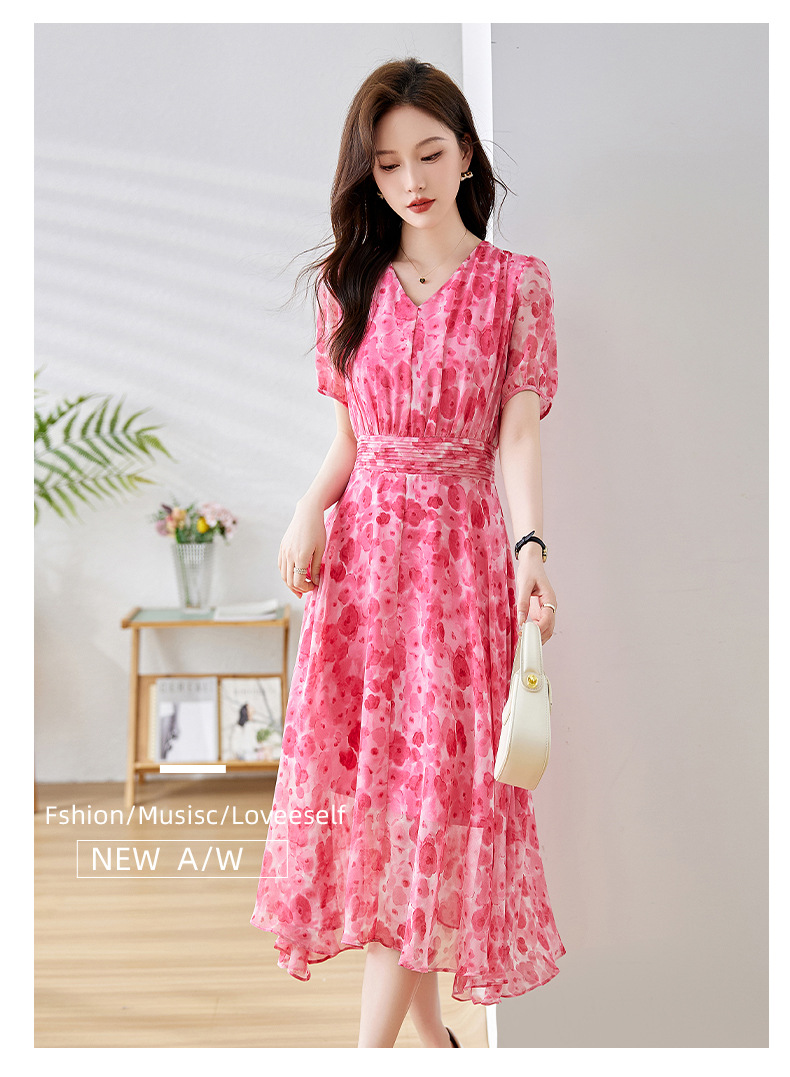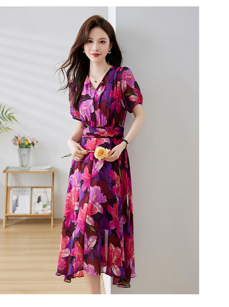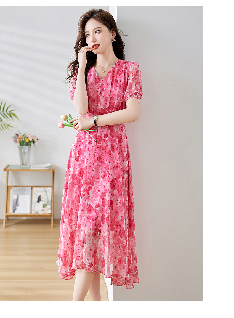 法式印花收腰显瘦,碎花气质v领连衣裙HR-6080