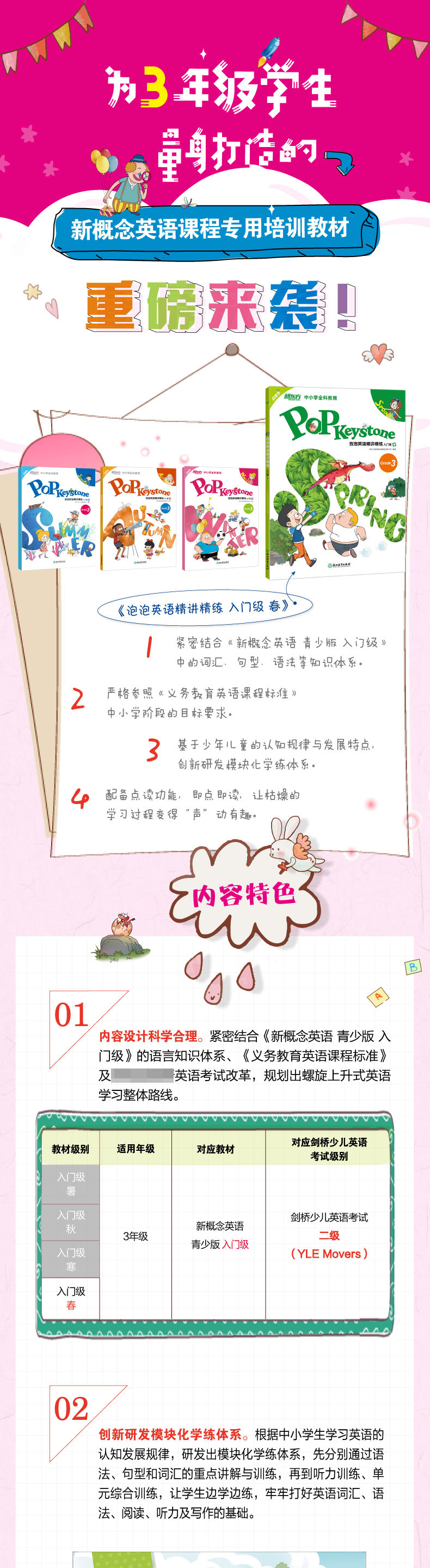 为更好地满足时下小学生的英语学习需求,新东方在开设新概念英语课程的过程中,使英语教育既延续,又与时俱进。与此同时,新东方联合数位英语教育工作者,先后历时三年,经过反复研讨、试验,特别针对三年级的学生研发出了适合他们使用的“泡泡英语精讲精练 入门级”系列辅导教材。
