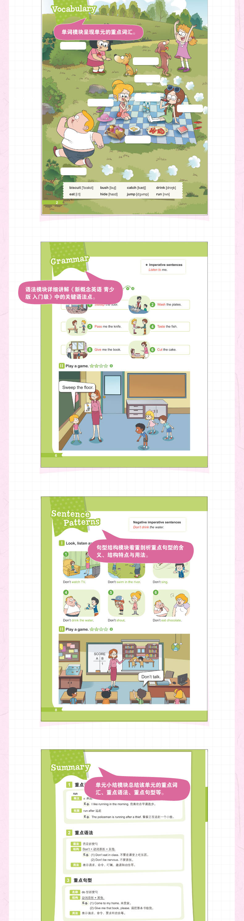 本系列教材重新对《新概念英语》的语言及语法体系进行梳理,按照三年级学生的认知特点、英语考试改革方案,创新研发出模块化学练体系,在每个单元灵活设计了词汇(Vocabulary)、语法(Grammar)、句型(Sentence Patterns)、总结(Summary)四大模块,综合提高学生的听、说、读、写能力,全面满足中国学生的英语学习需求。