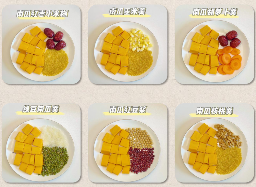 南瓜150g十红枣4颗十小米30g十水600m南瓜150g十绿豆20g十大米20g十水600ml南瓜150g十玉米半根十小米20g十水600ml南瓜150g十红豆20g十黄豆20g十水600ml南瓜150g十胡萝卜50g十红枣3颗十水600ml南瓜200g十核桃6颗十小米30g十水600m