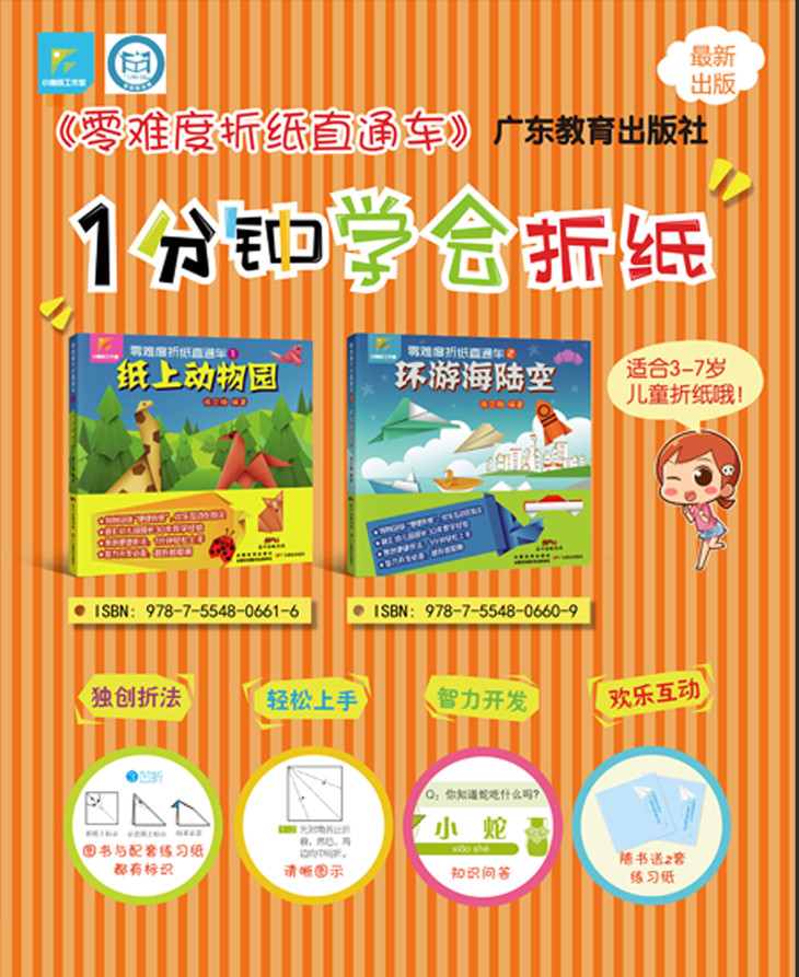 折纸是一门古老的指尖上的艺术。折纸过程充满了变化,给人带来无数的惊喜,更能提高孩子的创造力和想象力。不过,相信老师、家长都有这样的体会: 不少折纸的图解不易看懂,需要费工夫钻研探索才能明白;孩子常常觉得理解折纸图解十分吃力,需要老师、家长极耐心地重复解释。这些难题多多少少会影响教与学的效果和兴趣。