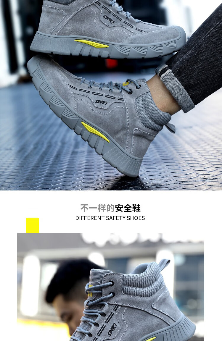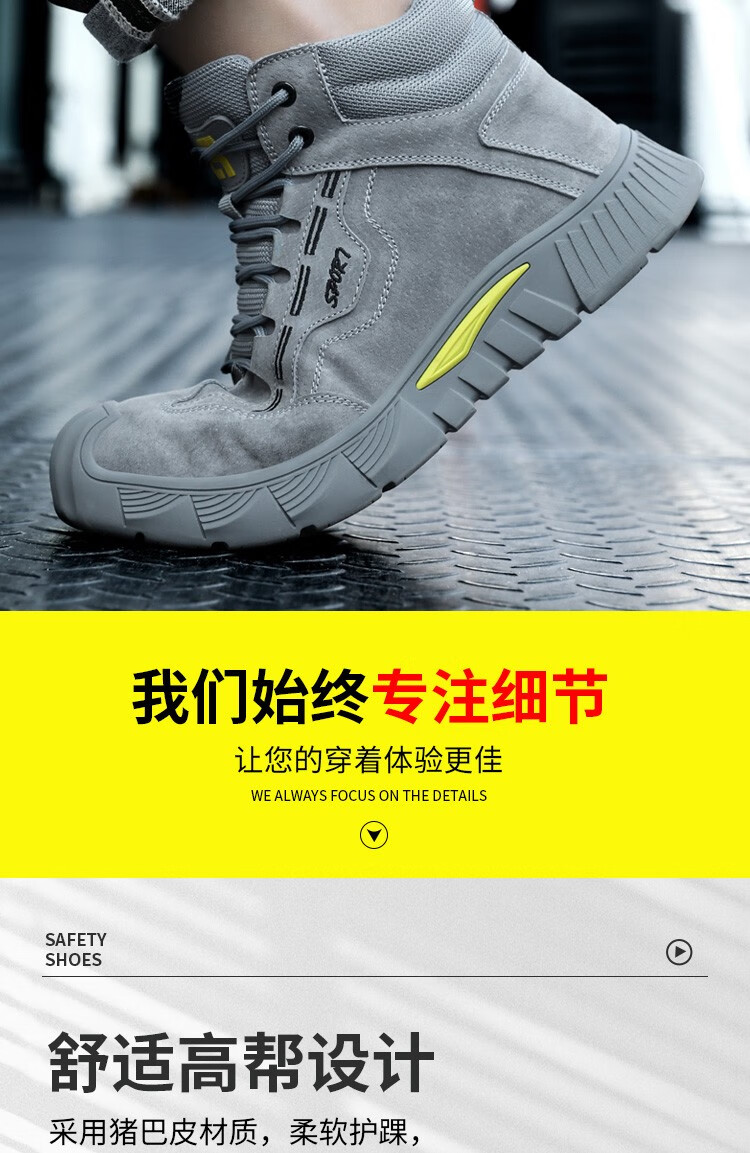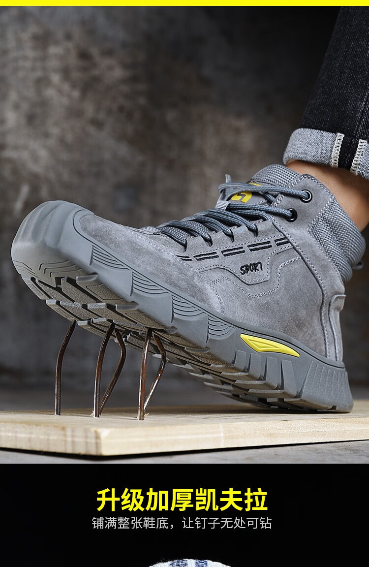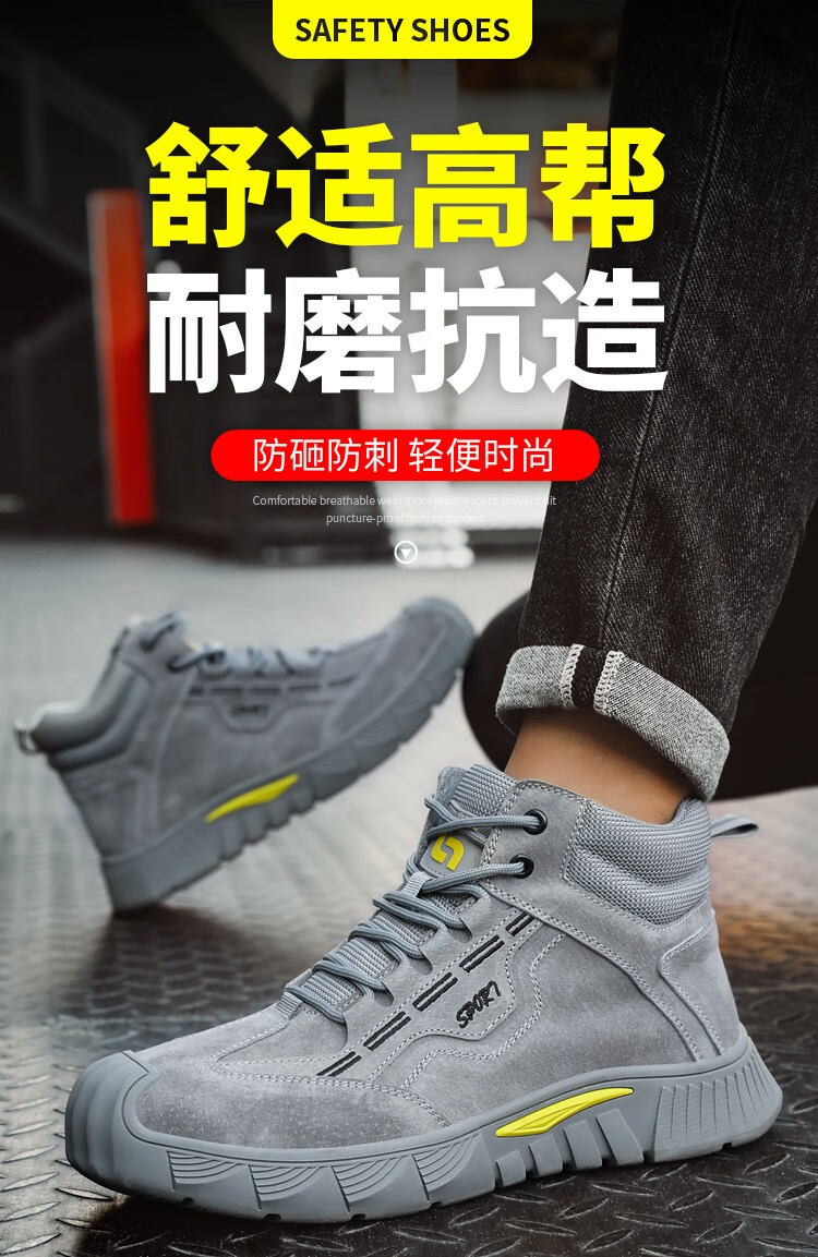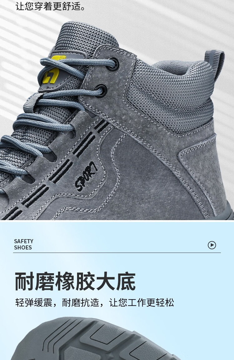 新款灰色高帮不加绒劳保鞋男防砸防刺钢包头猪皮四季款耐磨橡胶底舒适透气安全鞋工作鞋
