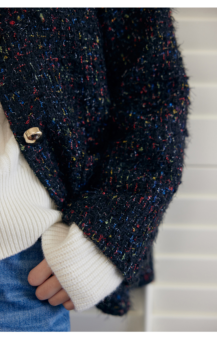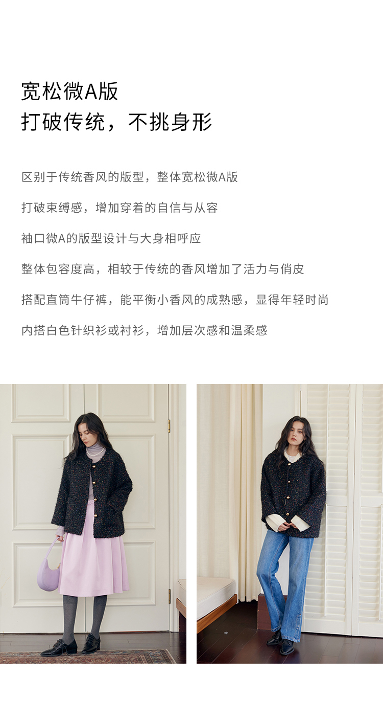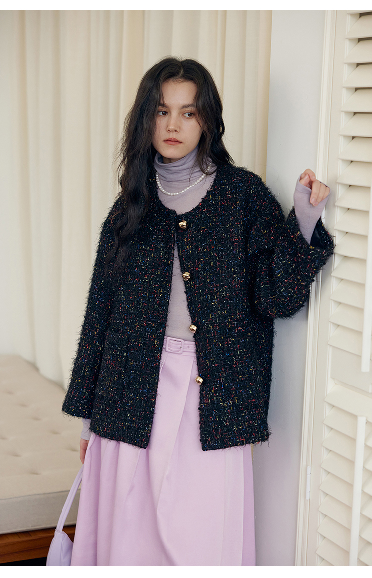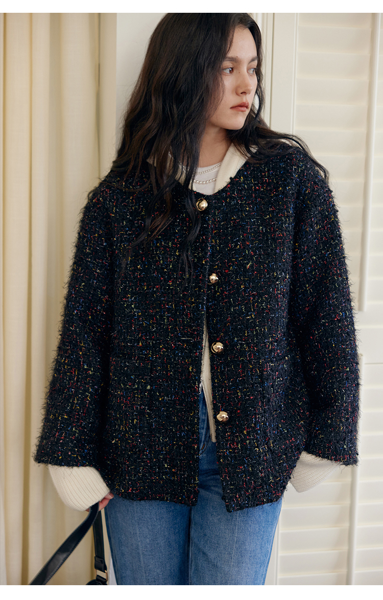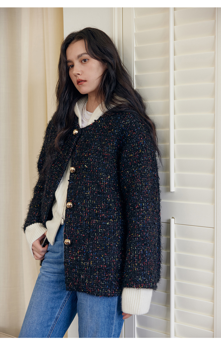 HeyDress花纱小香风外套女冬季圆领宽松显瘦粗花呢厚款黑色上衣