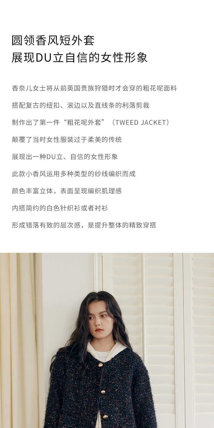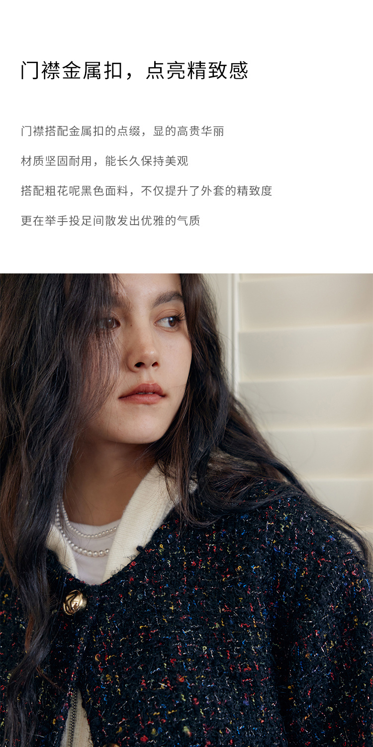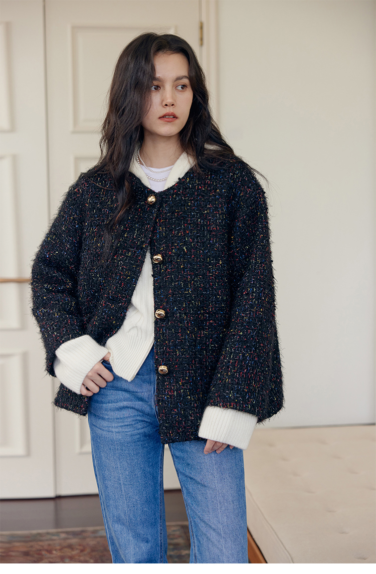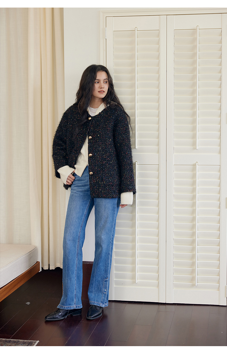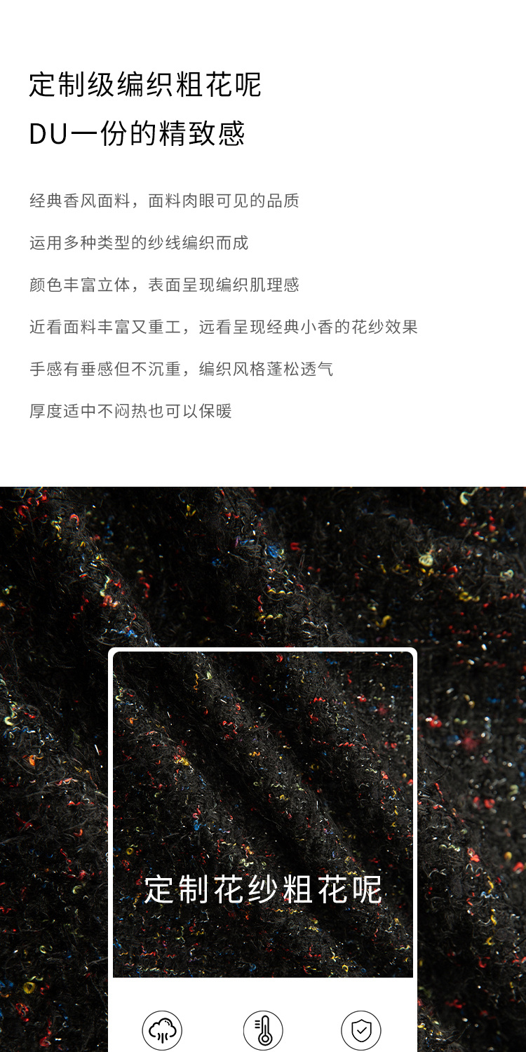 HeyDress花纱小香风外套女冬季圆领宽松显瘦粗花呢厚款黑色上衣