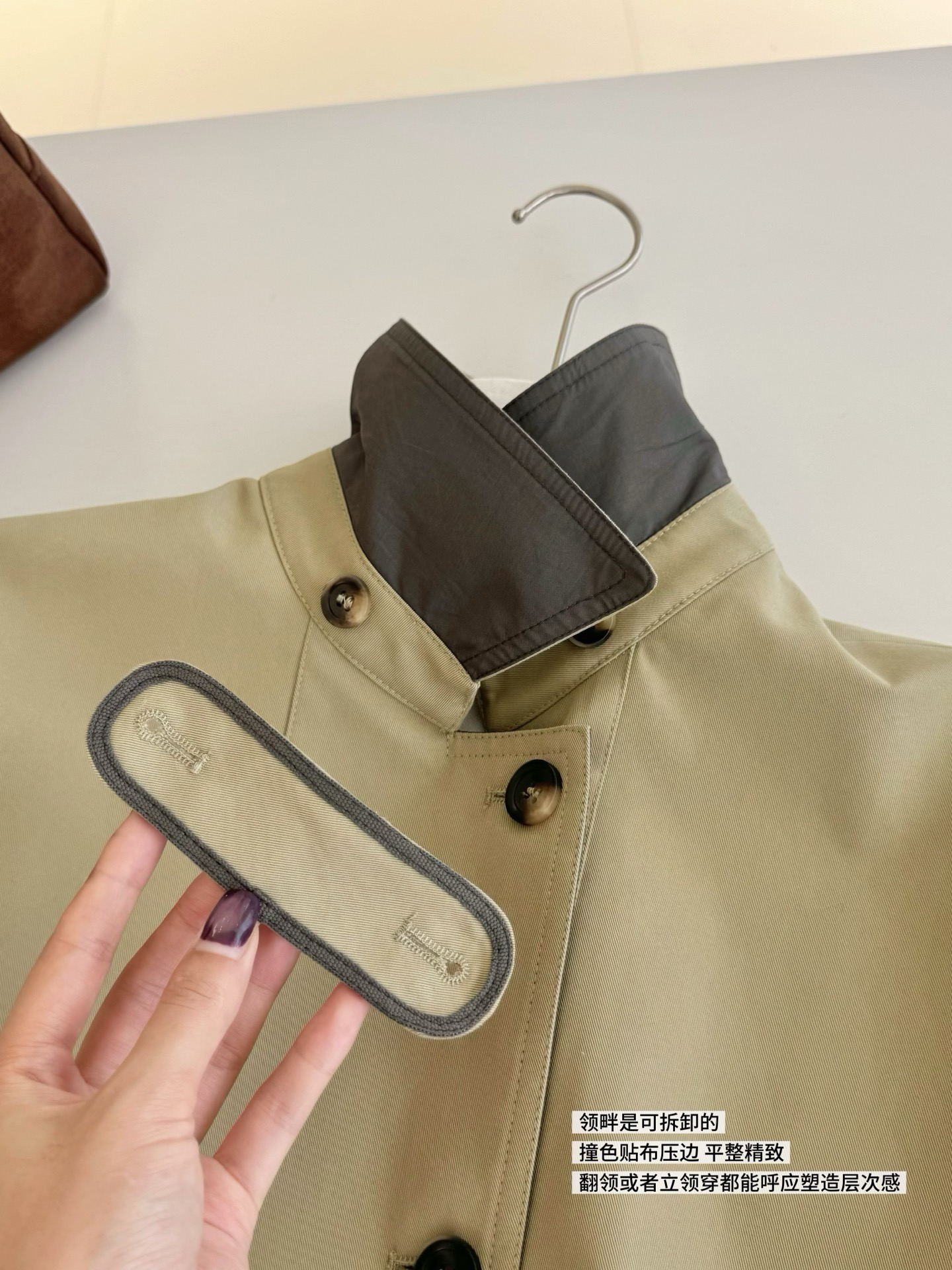 对内搭材质影响更小 穿脱更顺滑领畔是可拆卸的 撞色贴布压边平整精致