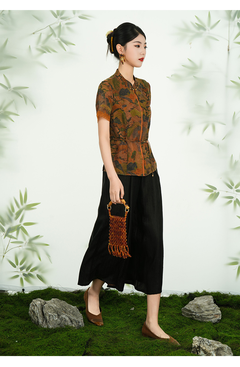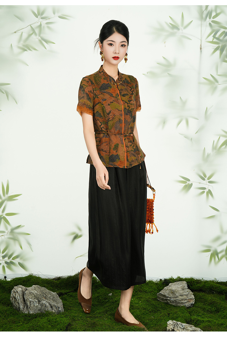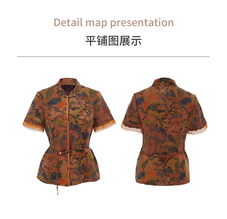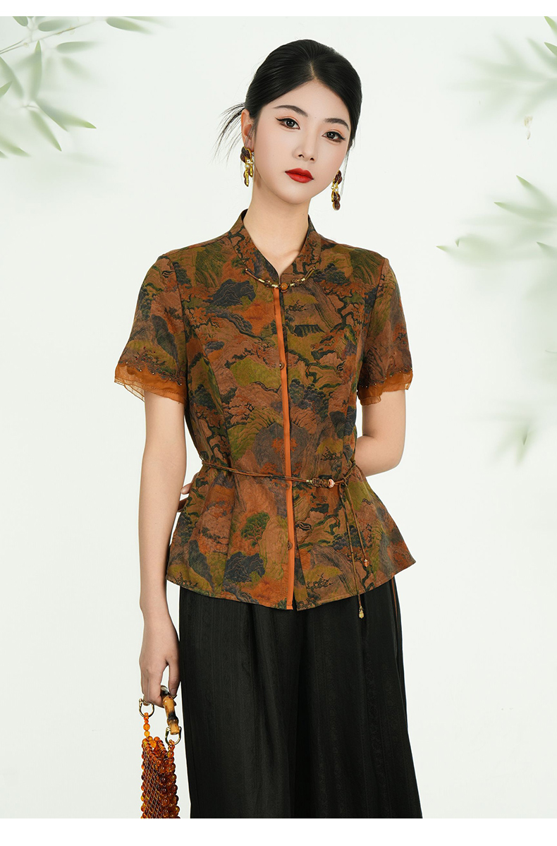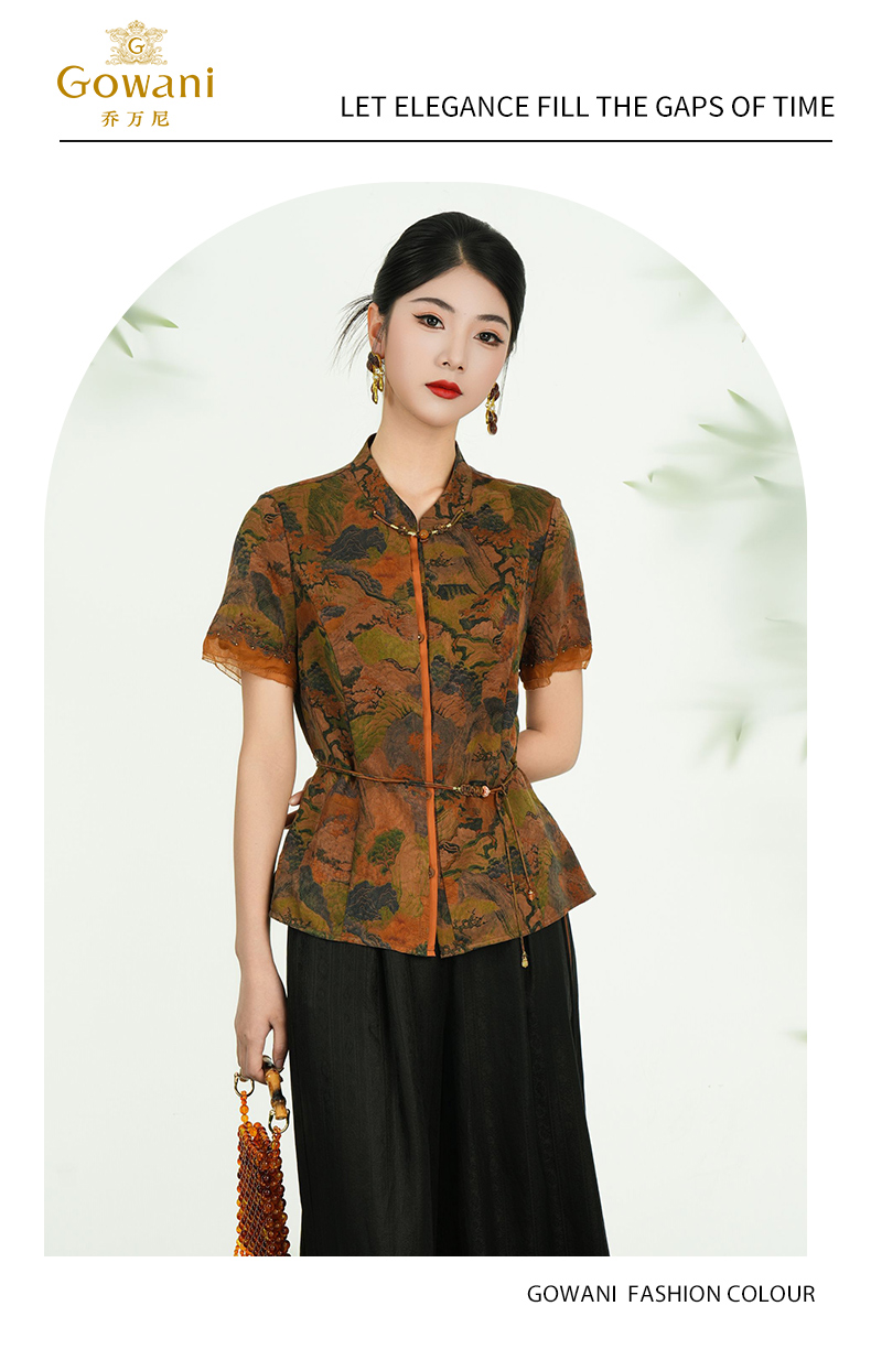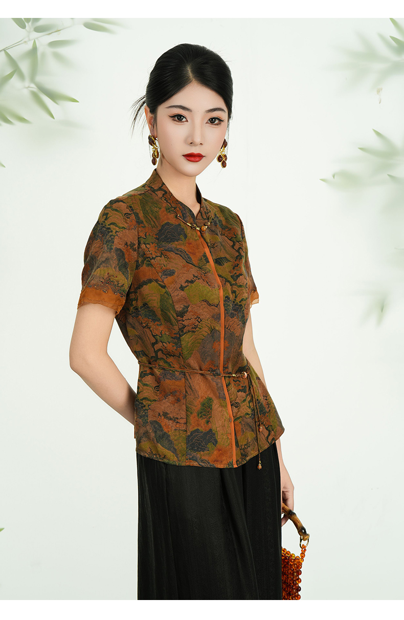 【春山远黛】【香云纱】乔万尼新品新中式印花收腰衬衫上衣ED2C407