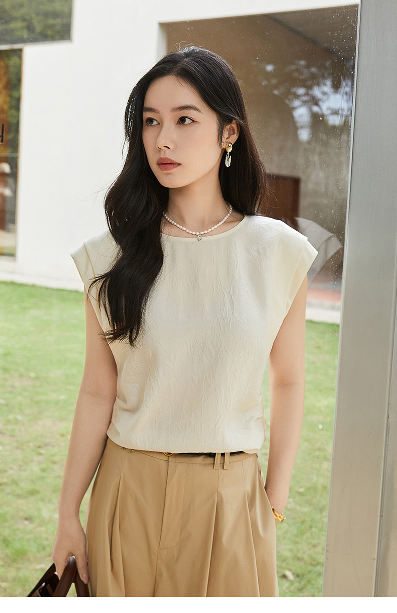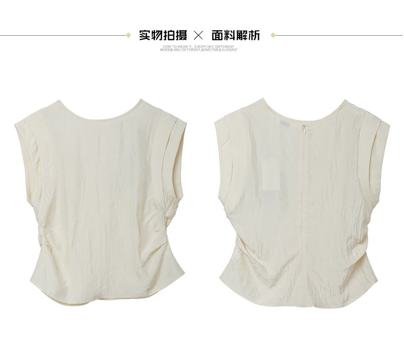 法式温柔风米白色无袖背心 收腰显瘦褶皱设计感圆领气质上衣