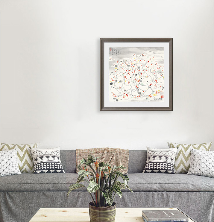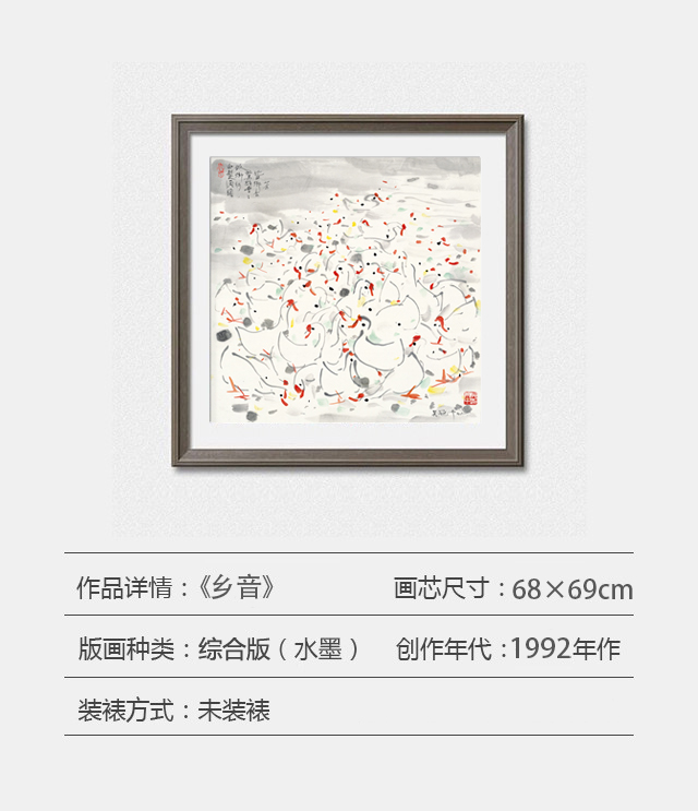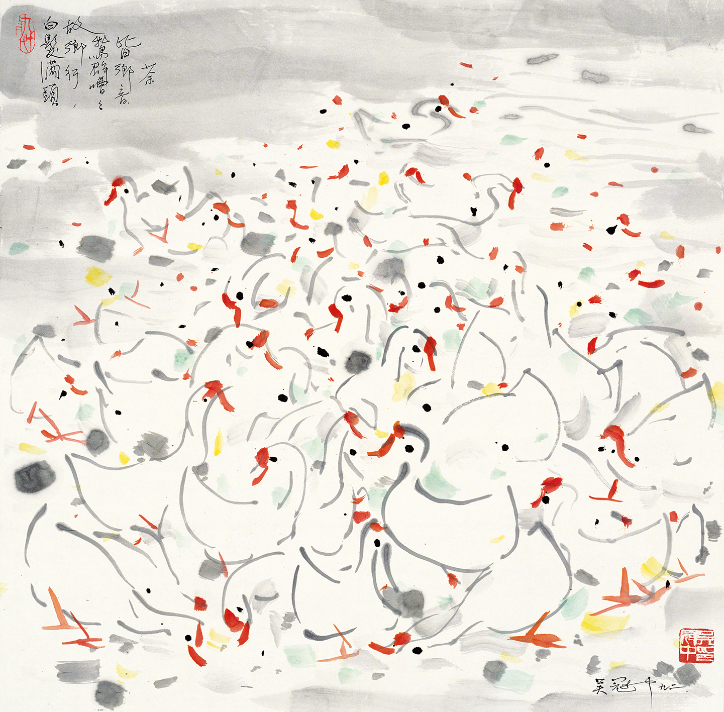 吴冠中先生在《乡音》中对“鹅”的刻画简化到极致,以至于在其中我们很难找到一些不必要的多余描绘。它们或引吭高歌,或俯身觅食,或摇摇晃晃地行走,或极速拍打着翅膀……当神态万千的白鹅以“复加”排列的方式被集合于同一个画面中时,便瞬间盈造出一幅充满生命活力与生活情趣的南方视像。
