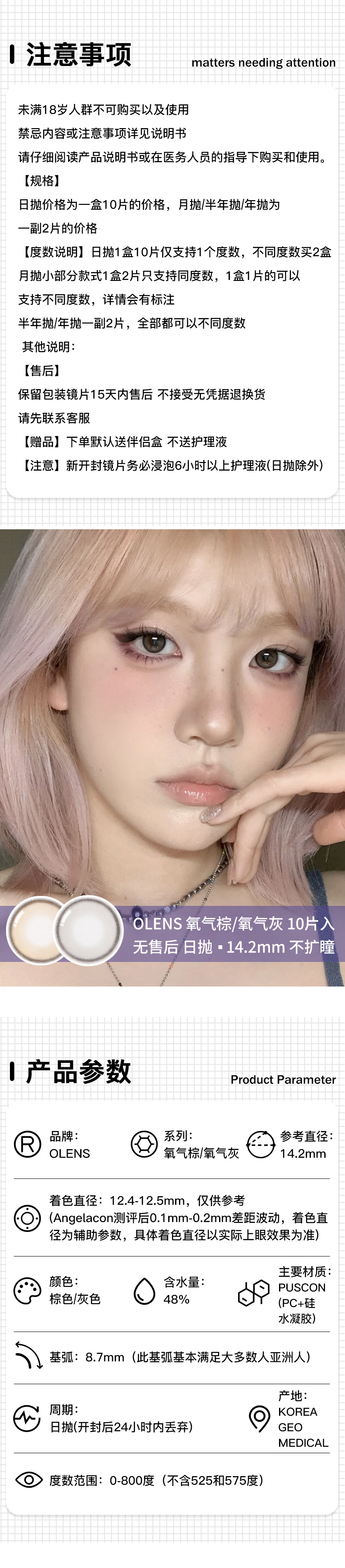 OLENS / 氧气棕/氧气灰 / 10片入 / 日抛 / 无售后 / 14.2mm / 不扩瞳细锁边清爽通透融瞳款