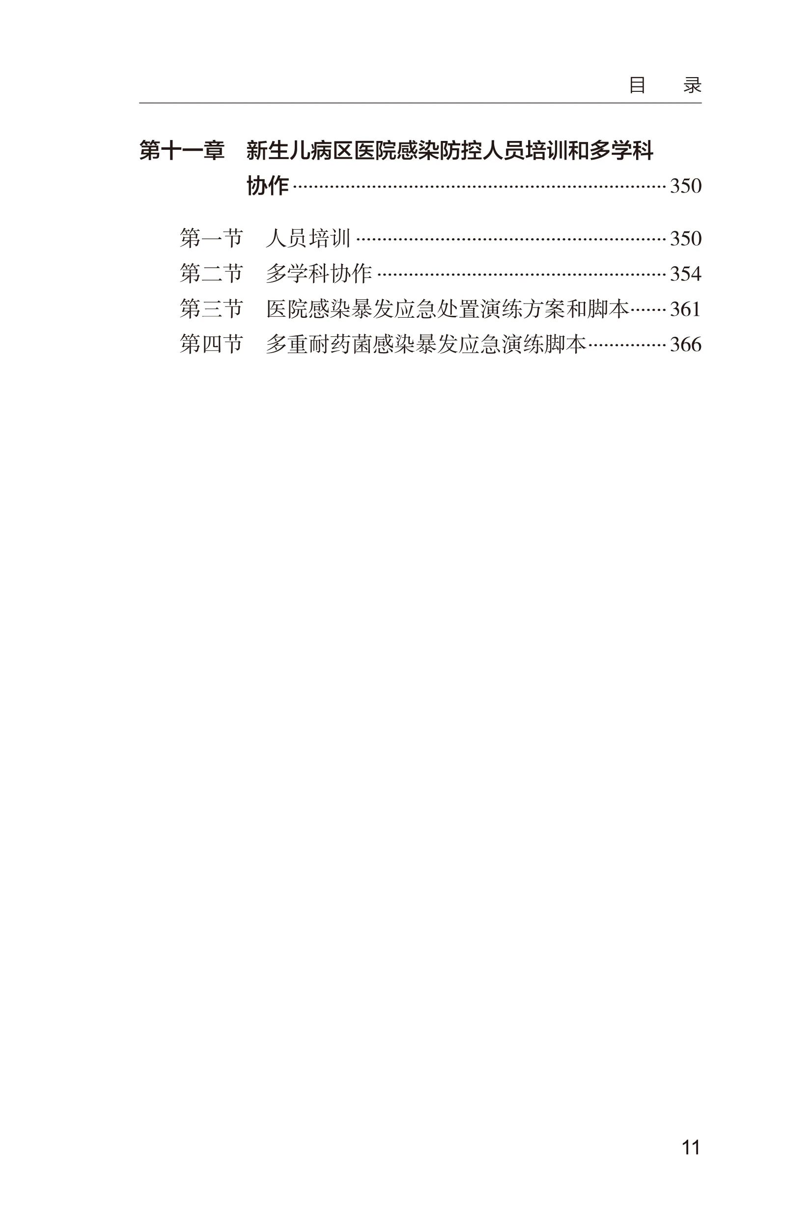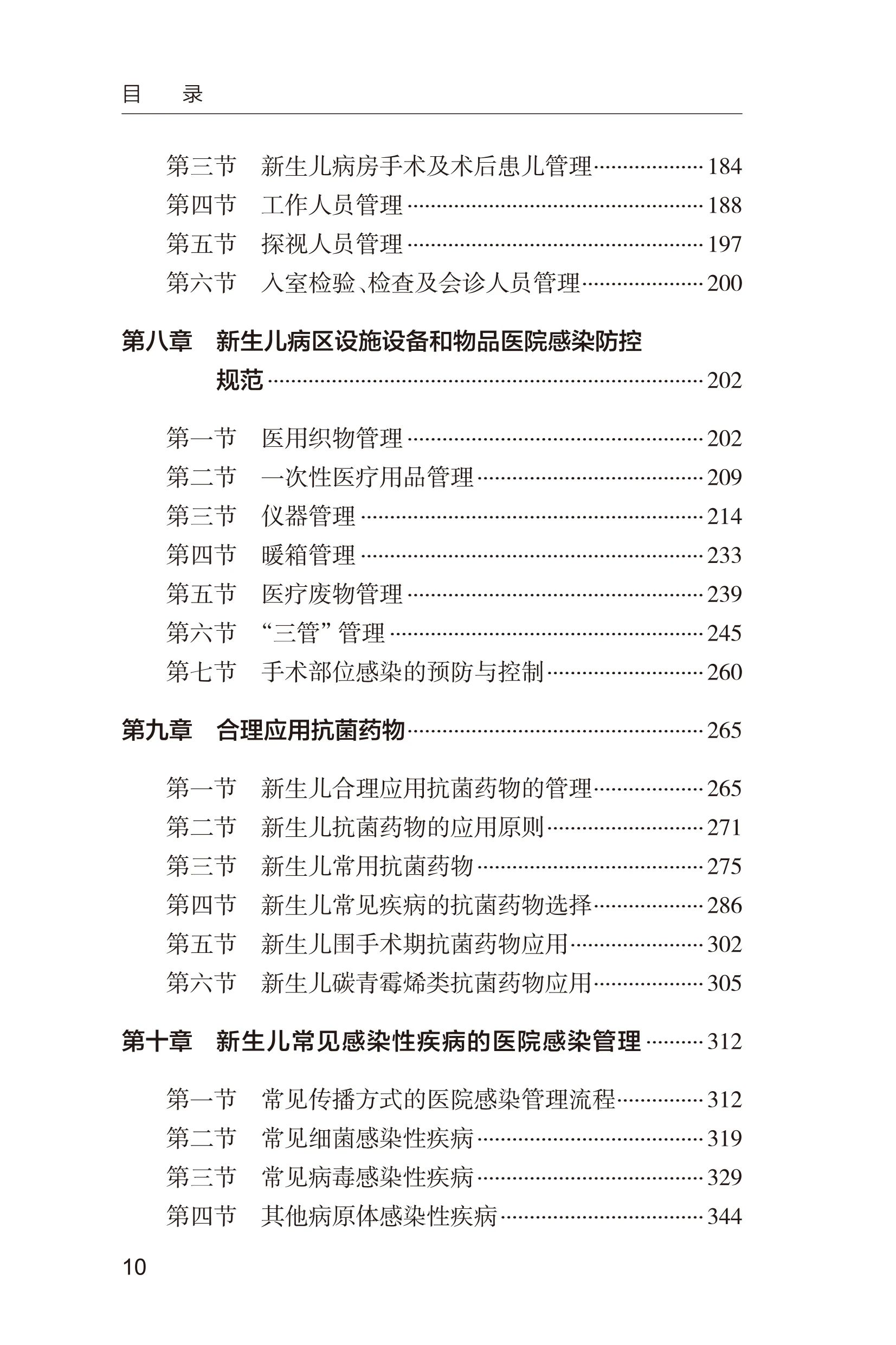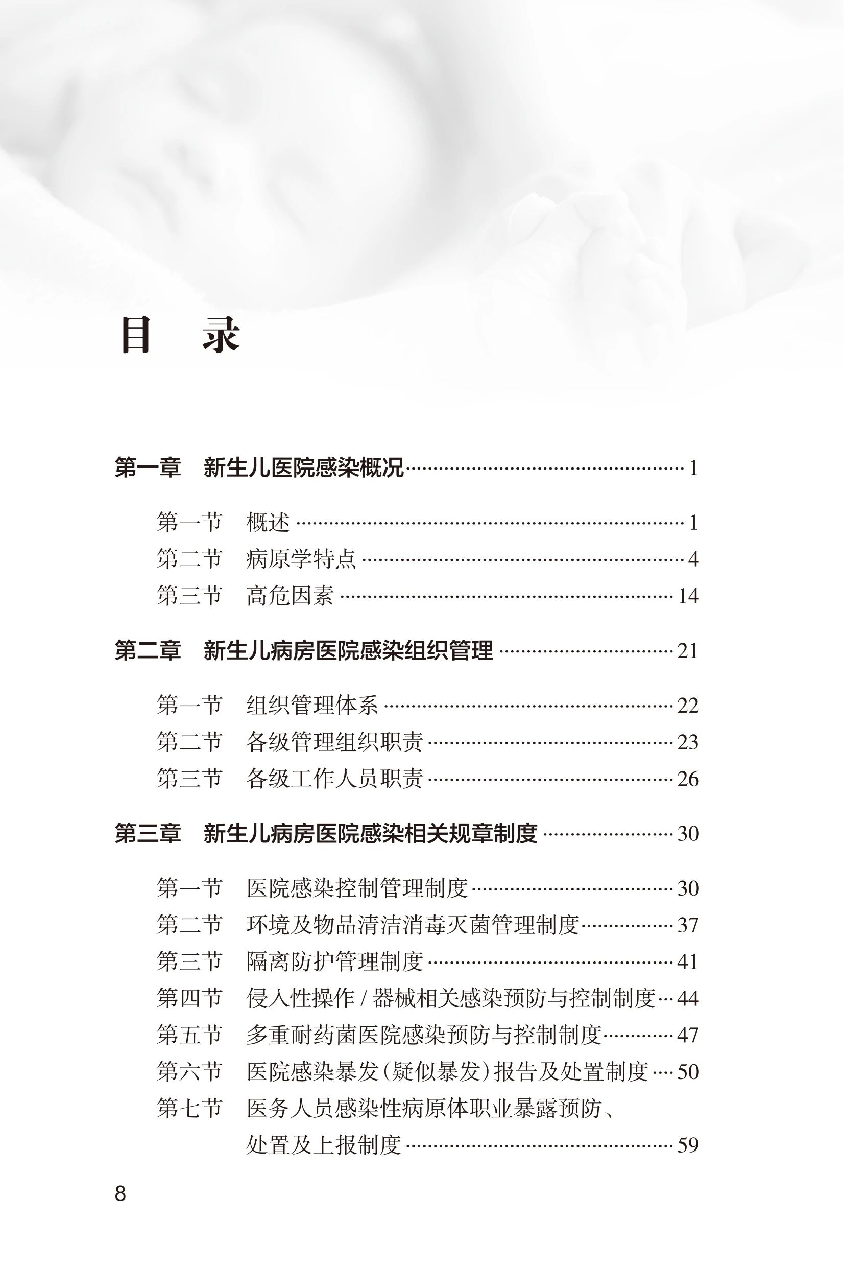 本书内容包括新生儿病房院感三级组织管理结构、各级管理组织和人员职责、新生儿病区建筑布局和设施设备规范、工作人员手卫生规范、接触传播隔离措施、患儿和环境主动监测的措施和方案、环境清洁消毒规范、配奶间、沐浴间、静配间的管理规范、织物管理、仪器规范管理、医疗废物管理、“三管”管理规范、合理使用抗生素的规范和建议、院感人员培训和多学科协作规范等。