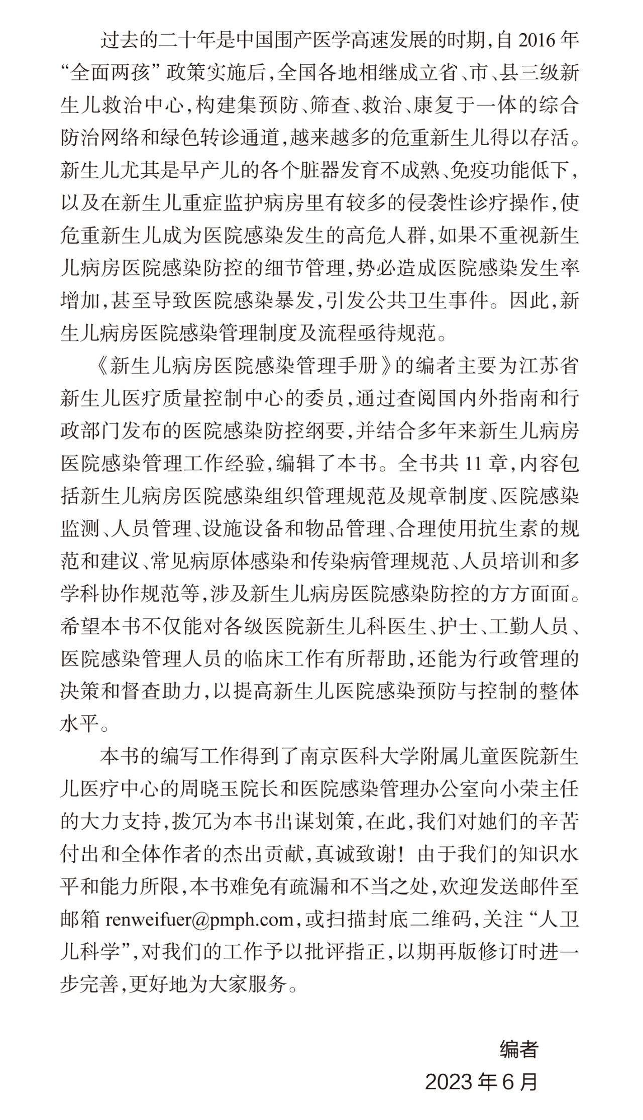 本书目标人群为各级医院新生儿科医生、护士、院感管理人员,编写团队梳理了20余年来医院感染的管理经验,查阅国内外指南及卫生行政部门发布的院感防控纲要,内容十分贴合新生儿病房建设和管理的实际要求。