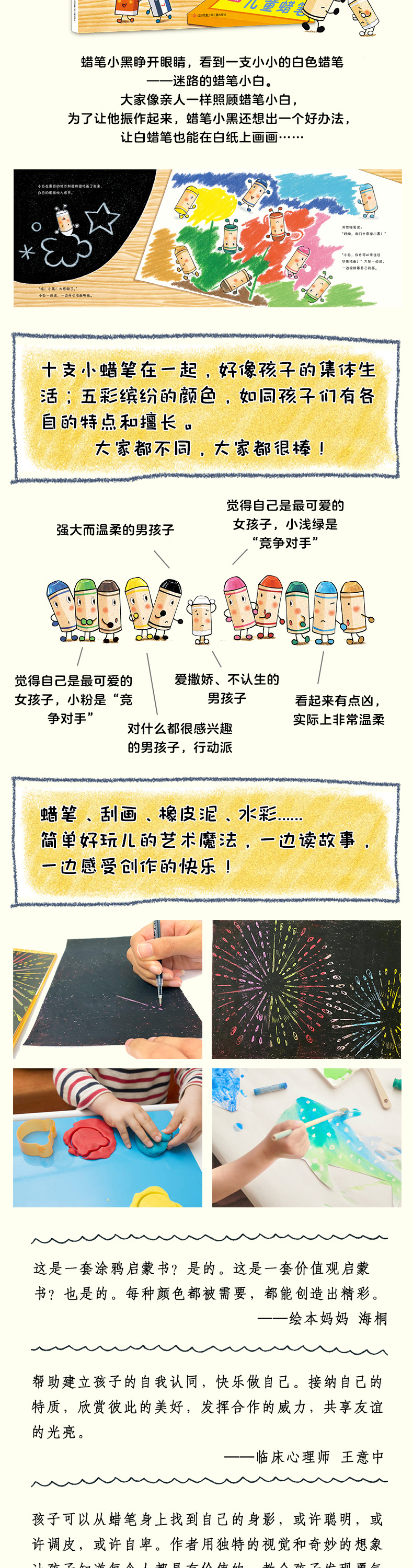 每一个故事都和新颖的艺术技法完·美结合,比如刮画制作、水彩的油水分离画法、橡皮泥的新玩法等,读故事的同时,引导孩子主动接触文具,体验动手和绘画的乐趣!