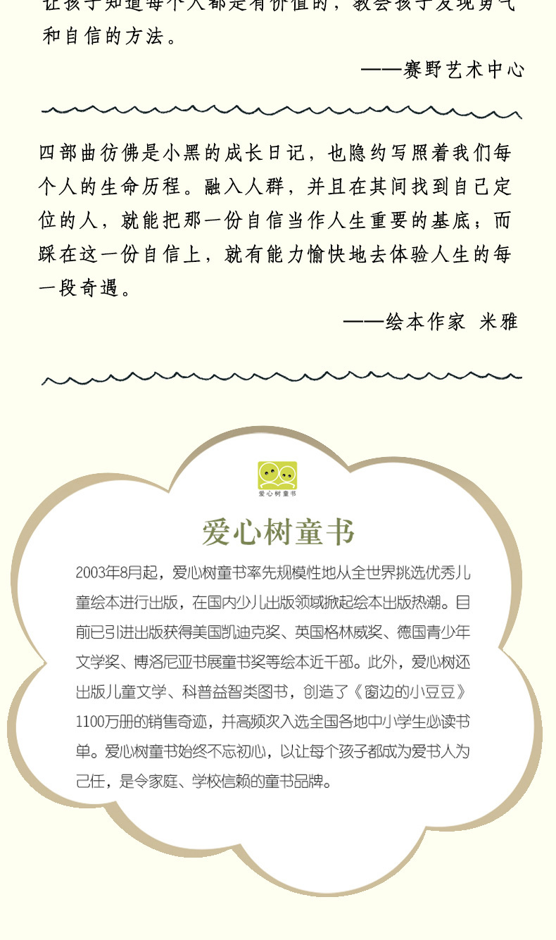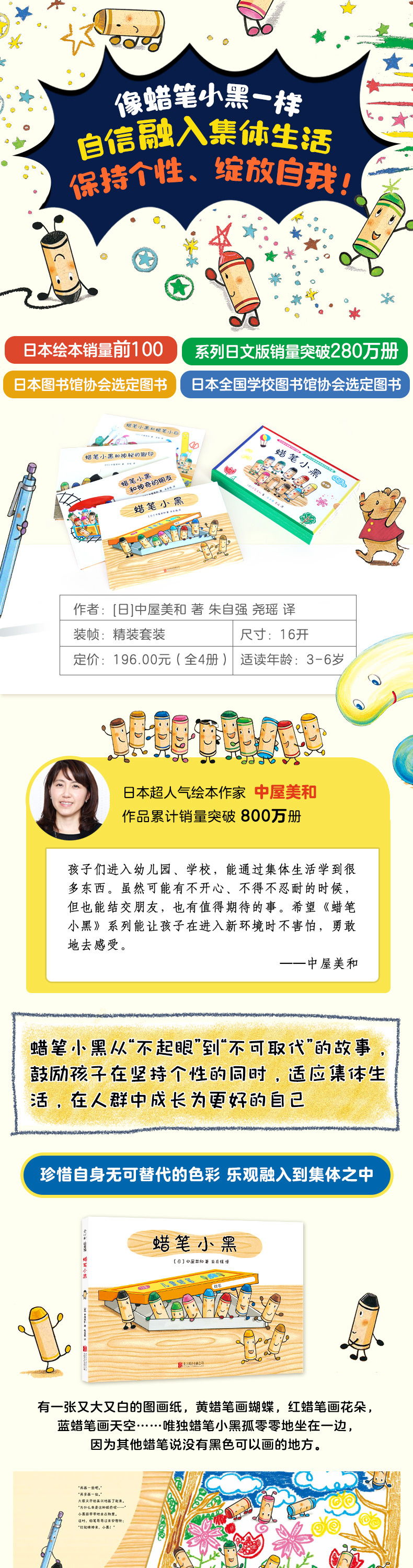 孩子们进入幼儿园、学校,能通过集体生活学到很多东西。虽然可能有不开心、不得不忍耐的时候,但也能结交朋友,也有值得期待的事。希望《蜡笔小黑》系列能让孩子在进入新环境时不害怕,勇敢地去感受。——中屋美和