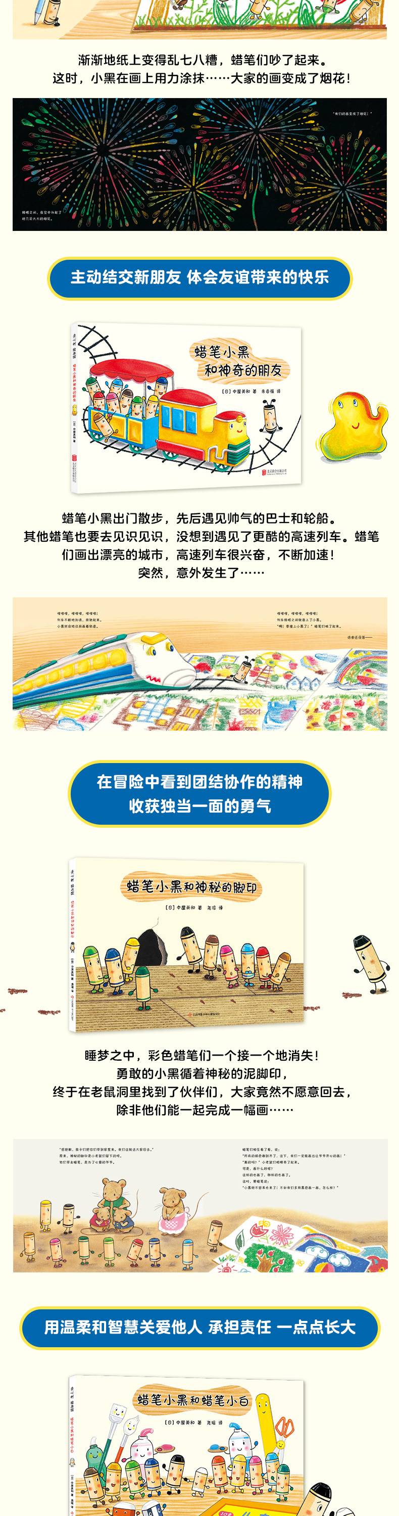 从一开始的不起眼、不自信,到《蜡笔小黑和神奇的朋友》中主动跟新朋友打招呼,再到《蜡笔小黑和神秘的脚印》中勇敢地独自寻找小伙伴们、《蜡笔小黑和蜡笔小白》中像大哥哥一般照顾蜡笔小白,蜡笔小黑不仅把劣势转化为优势,得到小伙伴们的认可和喜爱,还充分发挥专长帮助别人、解决困难。他的每一段冒险,都鼓励着孩子坚持个性的同时适应集体生活,在人群中成长为更好的自己。
