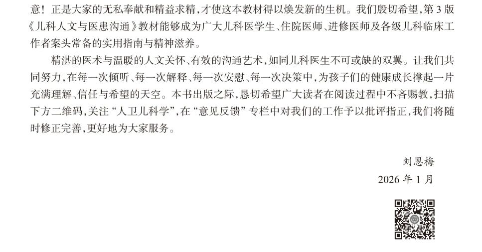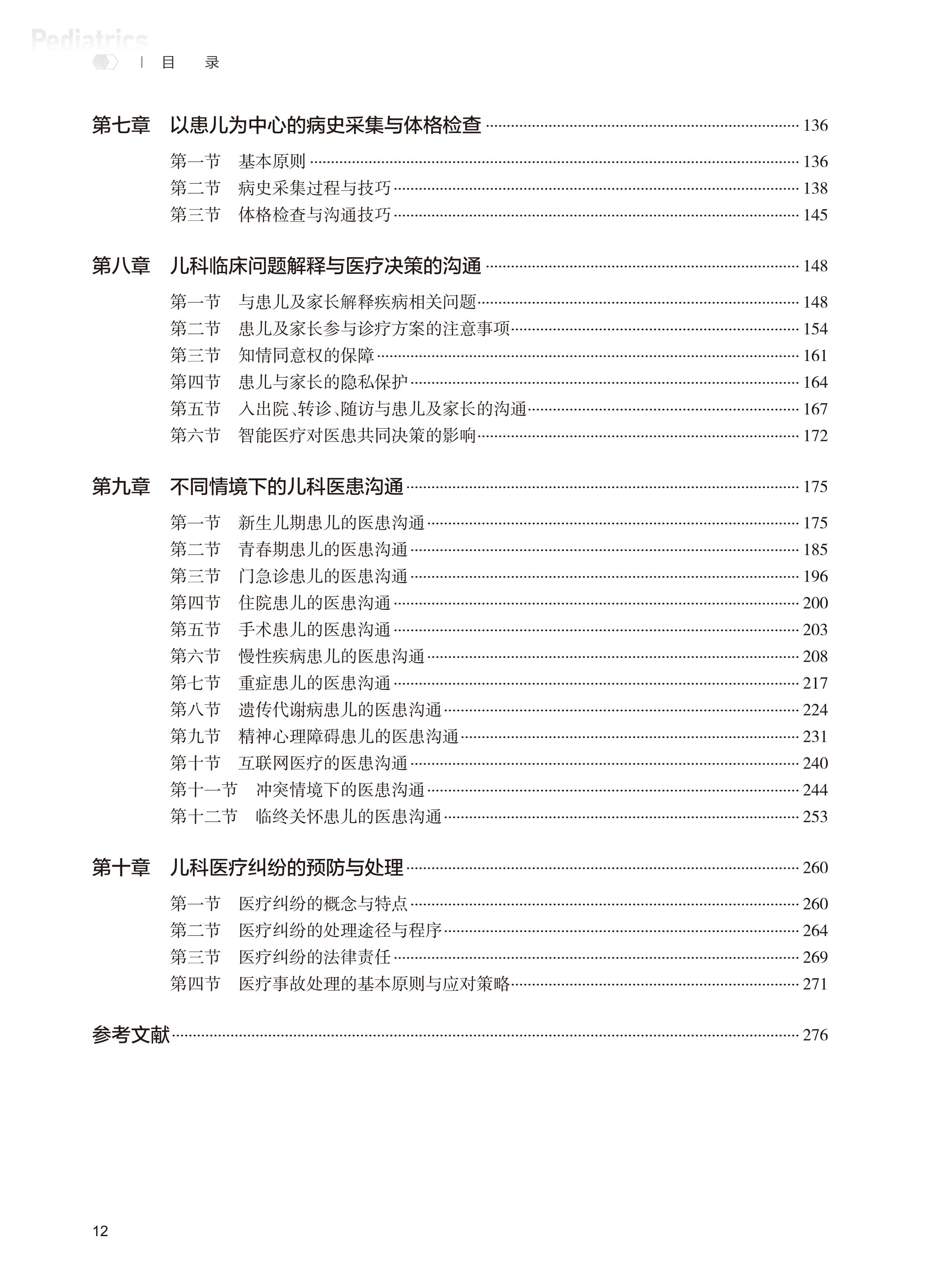 2.全书分十章,内容突出儿童作为沟通主体的地位,强调不同年龄段儿童(从新生儿到青少年)的沟通特点与技巧,以及如何尊重儿童的知情同意权与自主决策权;不仅关注沟通“术”的层面,更深入挖掘其背后的“道”,传递儿科医学人文精神的核心价值,以及如何将其内化为职业素养,外化为沟通行为;引入了大量源于临床场景的、具有代表性的案例,并辅以精练的解析与反思,力求让理论落地,让学习者“身临其境”;融合了医学伦理学、医学心理学、社会学、叙事医学、积极心理学等多学科的最新成果,为构建和谐的儿科医患关系提供更广阔的视角和更坚实的理论基础。