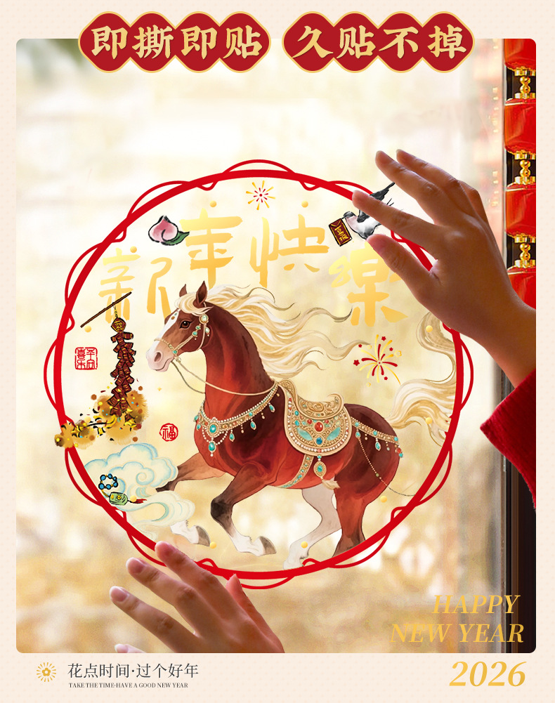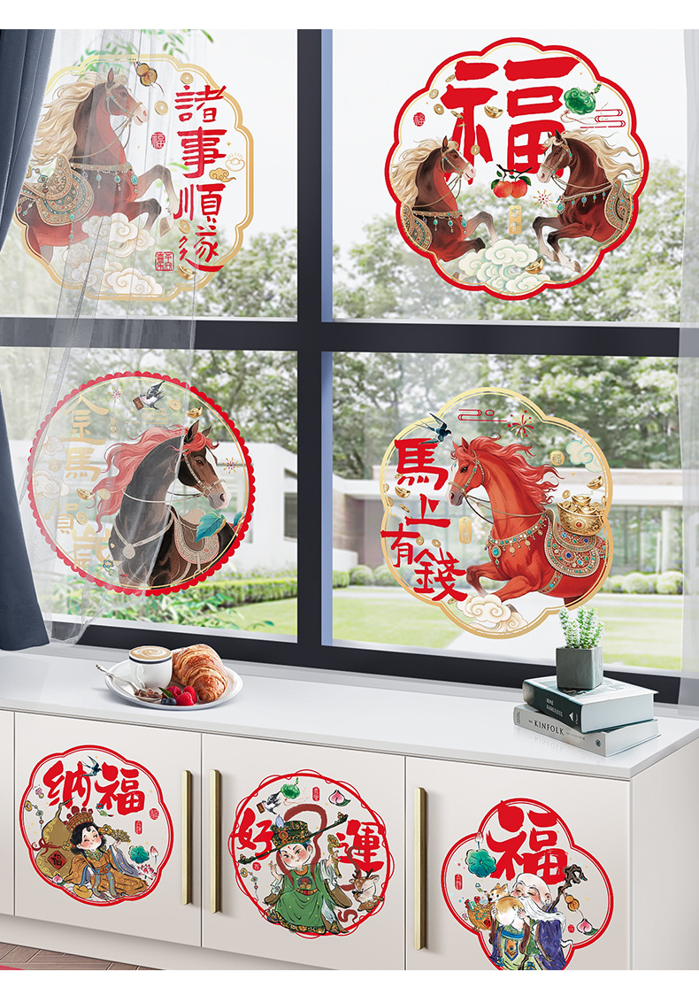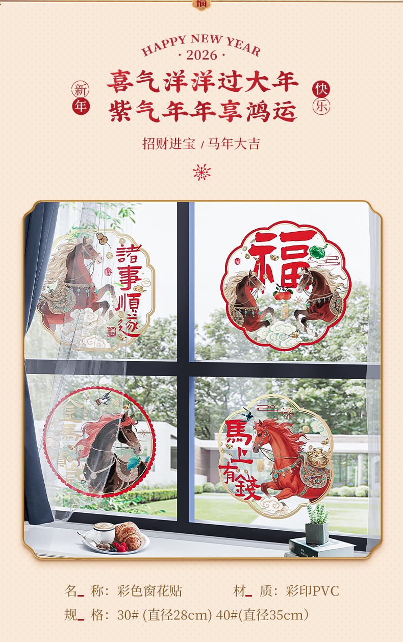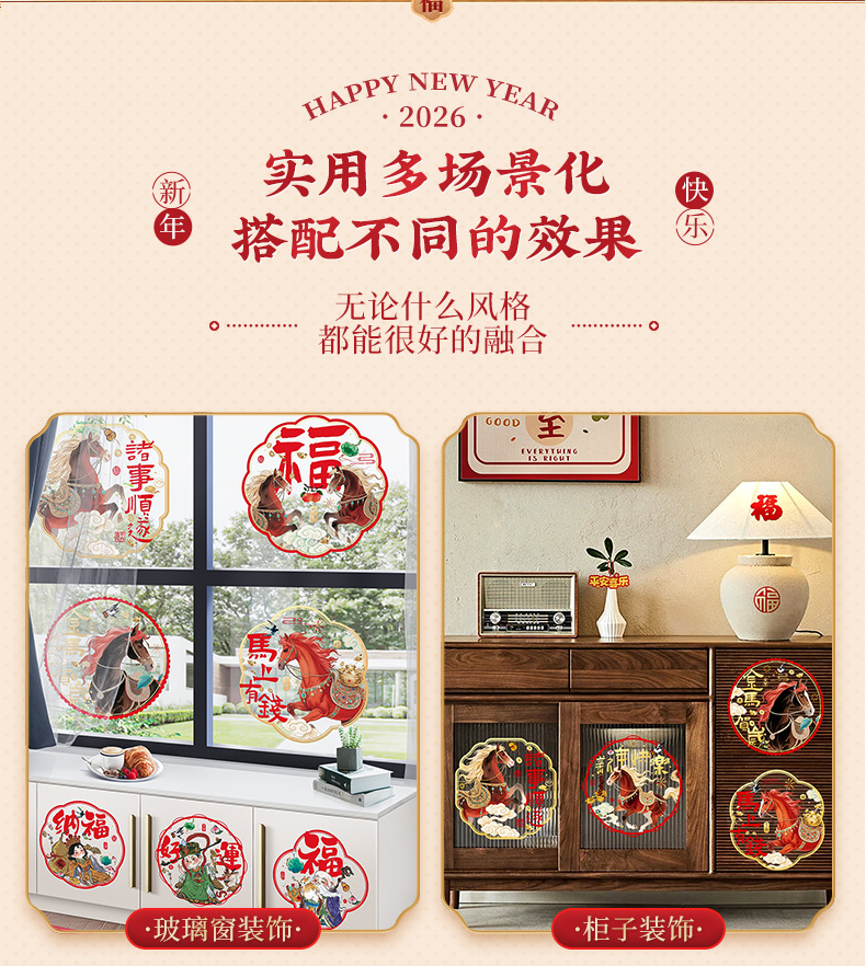 【招财进宝❗️马年大吉】2026新年装饰品马年春节彩色过年氛围贴纸静电贴玻璃门贴窗花。jc