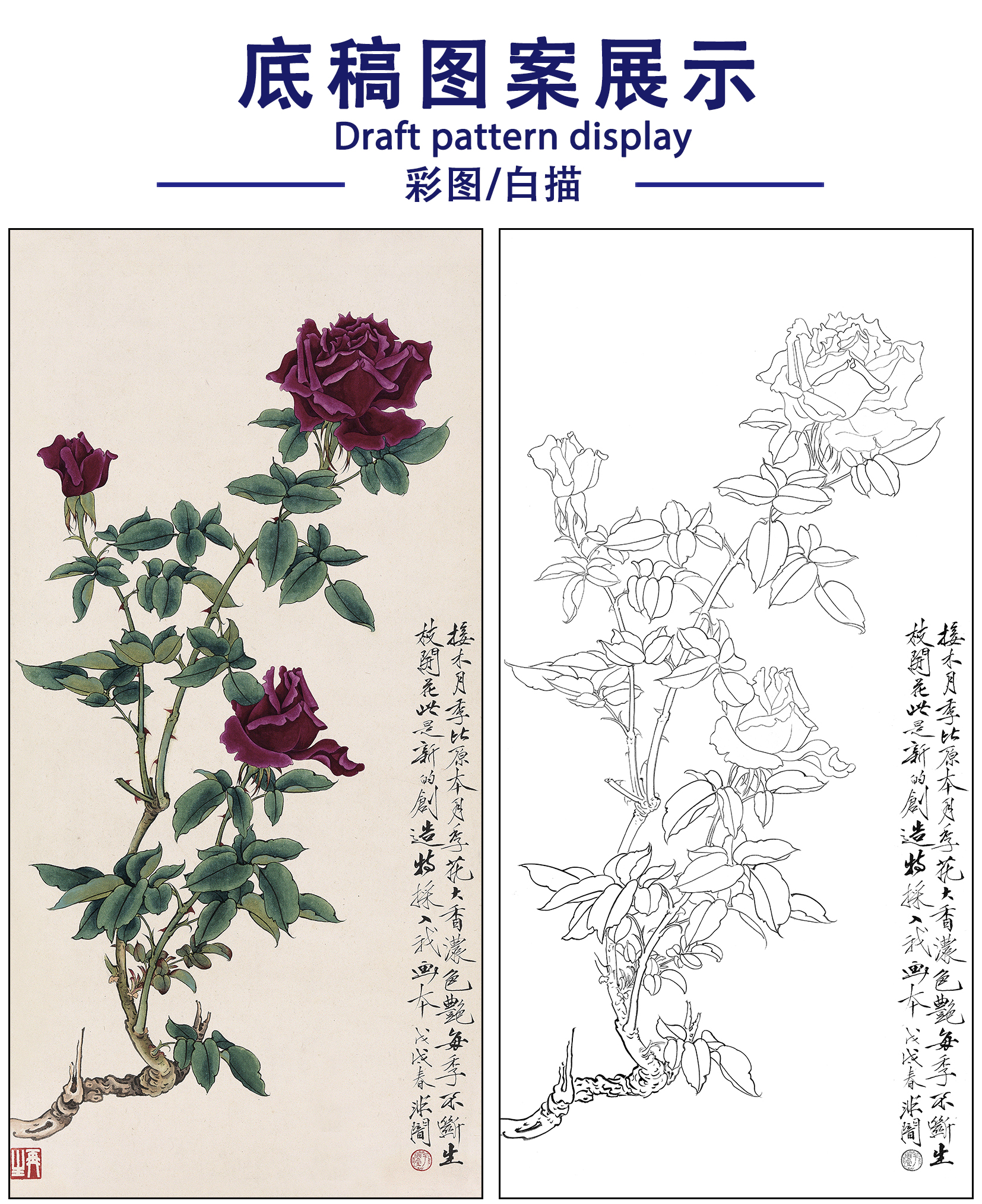 工笔画白描底稿于非闇花鸟《月季花》临摹勾线高清打印稿FA63