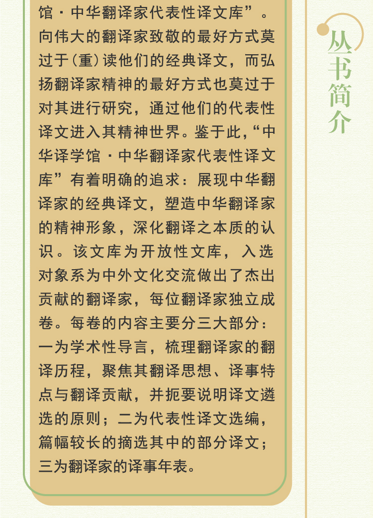 回望中国的翻译历史,陈望道的《共产党宣言》的翻译,傅雷的文学翻译,朱生豪的莎士比亚戏剧翻译……一位位伟大的翻译家创造了经典,更创造了永恒的精神价值。基于这样的认识,浙江大学中华译学馆为弘扬翻译精神,促进中外文明互学互鉴,郑重推出“中华译学馆·中华翻译家代表性译文库”。向伟大的翻译家致敬的最好方式莫过于(重)读他们的经典译文,而弘扬翻译家精神的最好方式也莫过于对其进行研究,通过他们的代表性译文进入其精神世界。鉴于此,“中华译学馆·中华翻译家代表性译文库”有着明确的追求:展现中华翻译家的经典译文,塑造中华翻译家的精神形象,深化翻译之本质的认识。该文库为开放性文库,入选对象系为中外文化交流做出了杰出贡献的翻译家,每位翻译家独立成卷。每卷的内容主要分三大部分:一为学术性导言,梳理翻译家的翻译历程,聚焦其翻译思想、译事特点与翻译贡献,并扼要说明译文遴选的原则;二为代表性译文选编,篇幅较长的摘选其中的部分译文;三为翻译家的译事年表。