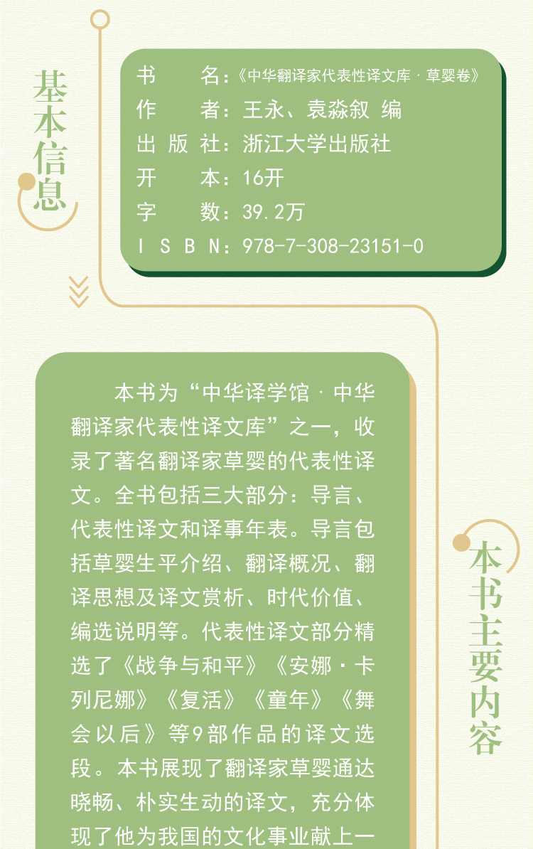 本书为“中华译学馆?中华翻译家代表性译文库”之一,收录了著名翻译家草婴的代表性译文。全书包括三大部分:导言、代表性译文和译事年表。导言包括草婴生平介绍、翻译概况、翻译思想及译文赏析、时代价值、编选说明等。代表性译文部分精选了《战争与和平》《安娜·卡列尼娜》《复活》《童年》《舞会以后》等9部作品的译文选段。本书展现了翻译家草婴通达晓畅、朴实生动的译文,充分体现了他为我国的文化事业献上一部又一部俄苏文学经典,为广大读者送来丰富精神食粮的时代价值。