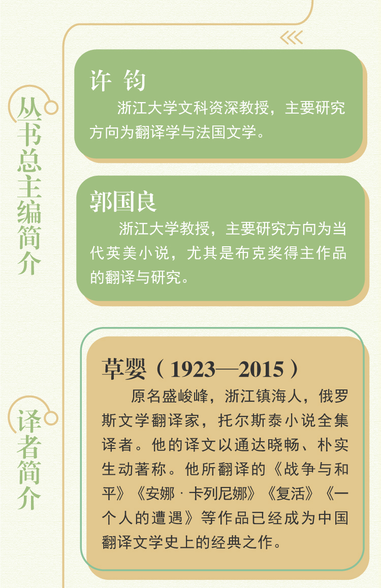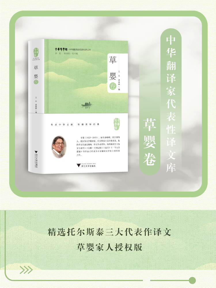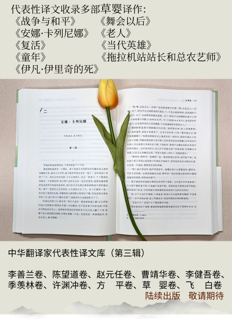 草婴(1923—2015),原名盛峻峰,浙江镇海人,俄罗斯文学翻译家,托尔斯泰小说全集译者。他的译文以通达晓畅、朴实生动著称。他所翻译的《战争与和平》《安娜?卡列尼娜》《复活》《一个人的遭遇》等作品已经成为中国翻译文学史上的经典之作。