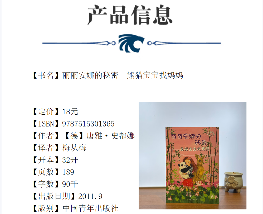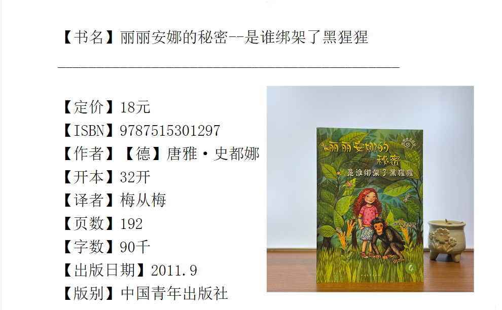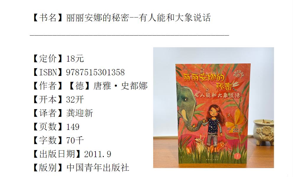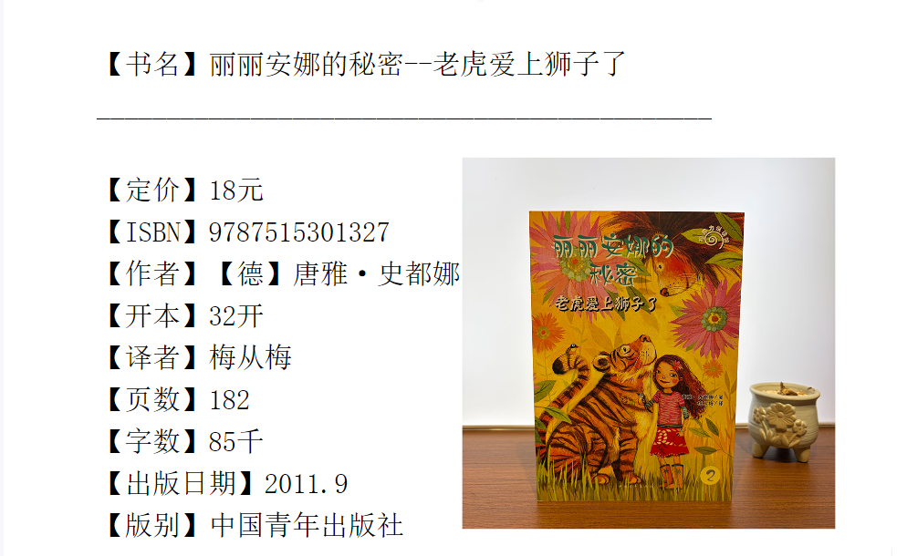唐雅·史都娜(Tanya Stewner), 1974年生于伯吉斯地区,10岁开始写作,曾在杜塞尔多夫、乌帕塔尔和伦敦学习文学翻译、英语和文学,并做过多年的翻译和编辑。《丽丽安娜的秘密》是史都娜的个儿童文学系列,并给她带来了巨大的成功。该系列的本《有人能和大象说话》就使她获得了“金书大盗”奖的*新人奖。《丽丽安娜的秘密》系列还包括随后出版的《老虎爱上狮子了》《海豚遇到大麻烦》《是谁绑架了黑猩猩》《马儿为什么不听话》以及《熊猫宝宝找妈妈》,是近年少有的儿童文学畅销书,已经售出瑞典、荷兰、波兰、西班牙、韩国等国的外语版权。