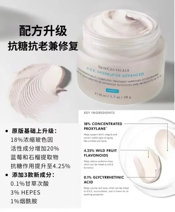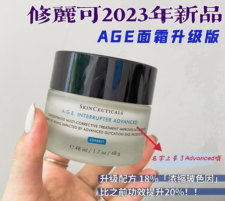 👑修丽可 新款AGE面霜48ml 👍升级版实在太牛了! 🤩玻色因含量30%溶液,降到了18%浓缩玻色因,活性成分提升了20% 💎添加了1%甘醇酸新成分,抗炎清除自由基能力提升 💦延缓糖化衰老过程 🙌质地更清透,肤感更优秀,膏体颜色也有明显变化 ✨功效:淡化皱纹、恢复紧致、对抗糖化、提升亮泽、屏障修复、补水保湿 ✅功效比旧版更显著
