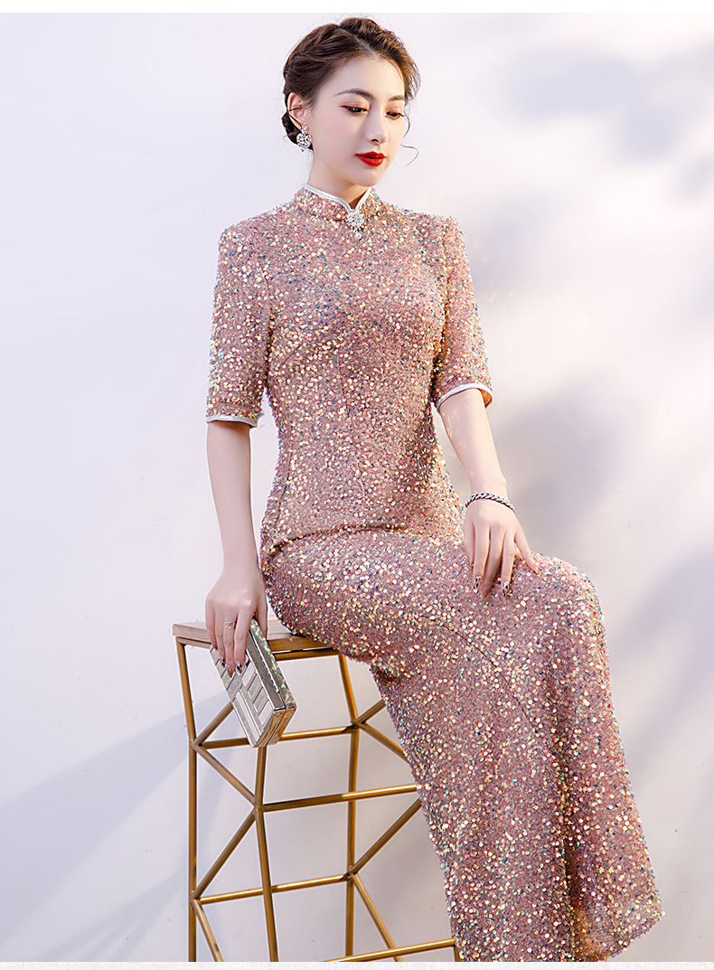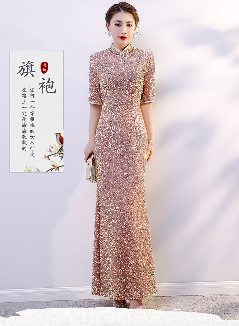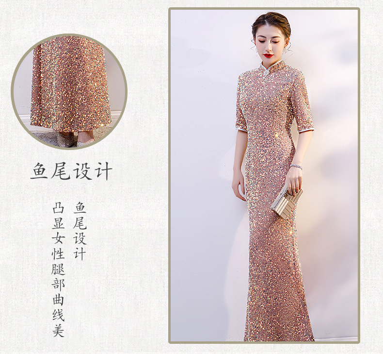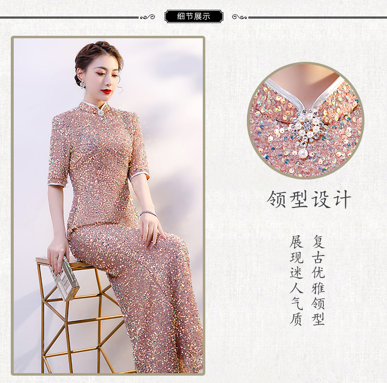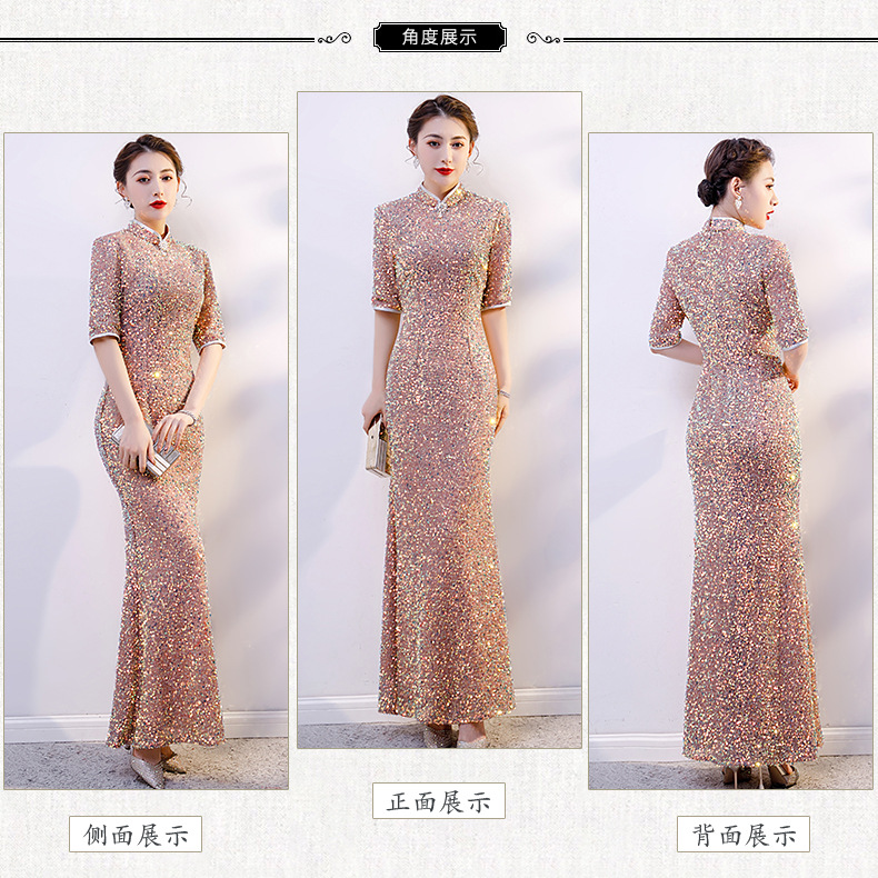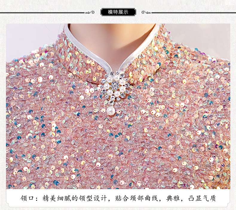 亮片旗袍新款端庄大气走秀演出服长款优雅改良版连衣裙