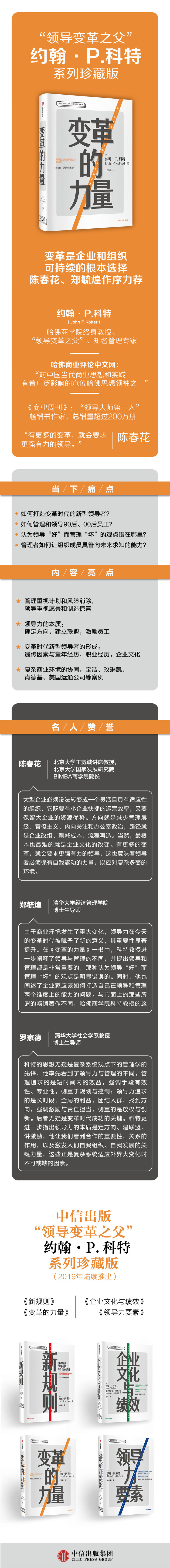 科特是一位重要的管理思想家,他区分了领导和管理的概念,强调的基本职能在于倡导改革之风。他也研究了企业文化与经营业绩的关系,揭示出灵活适应性的企业文化能显著长期经营业绩。他更是持续关注领导力的发展,不仅仅明确提供了新商业环境下领导力要素的内涵,更是基于变化的视角,探讨变革的力量来源及行动指导。在今天来看,仍然令人印象深刻,发人深省。这套丛书会从不同的视角给读者带来收获。我重新阅读这4本书的时候,较之早期阅读又有了全新的收获: