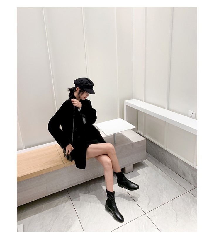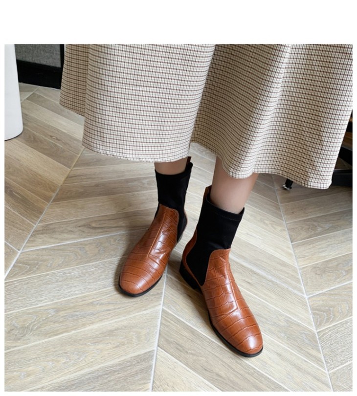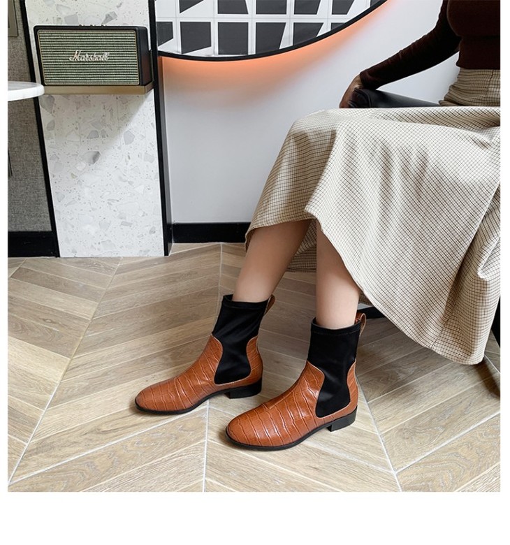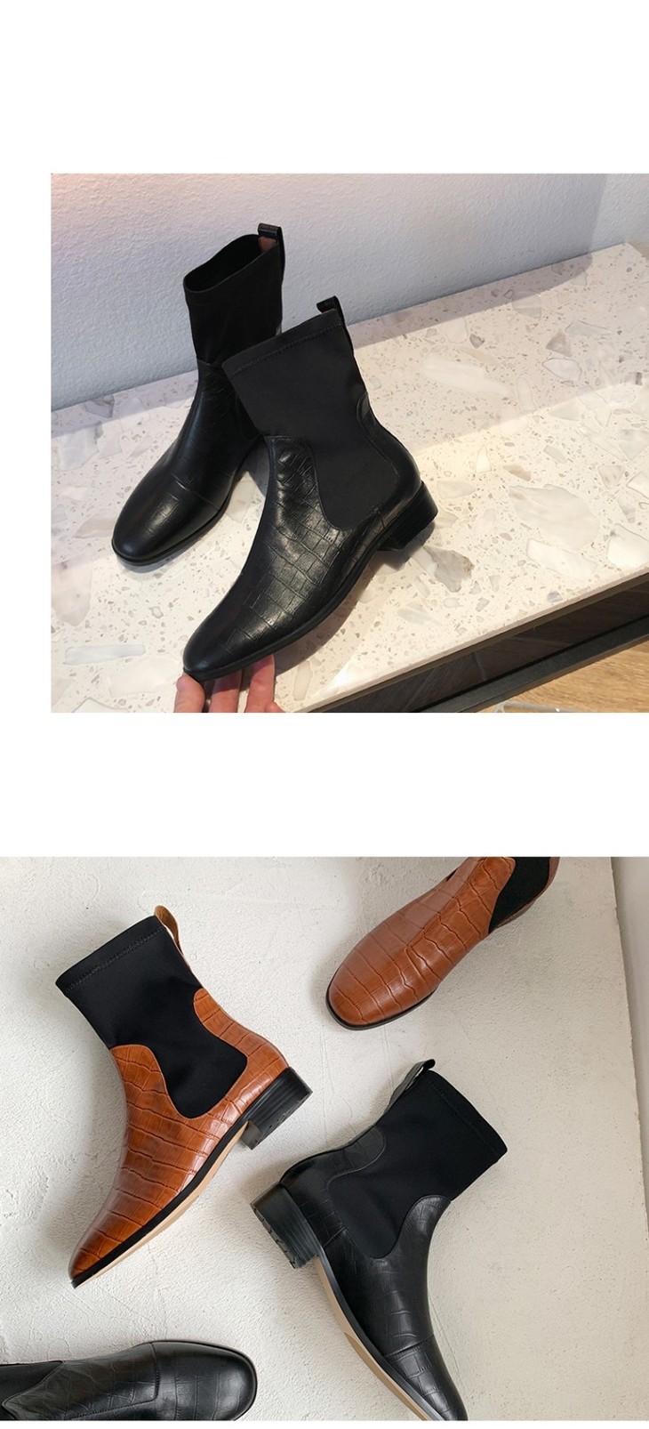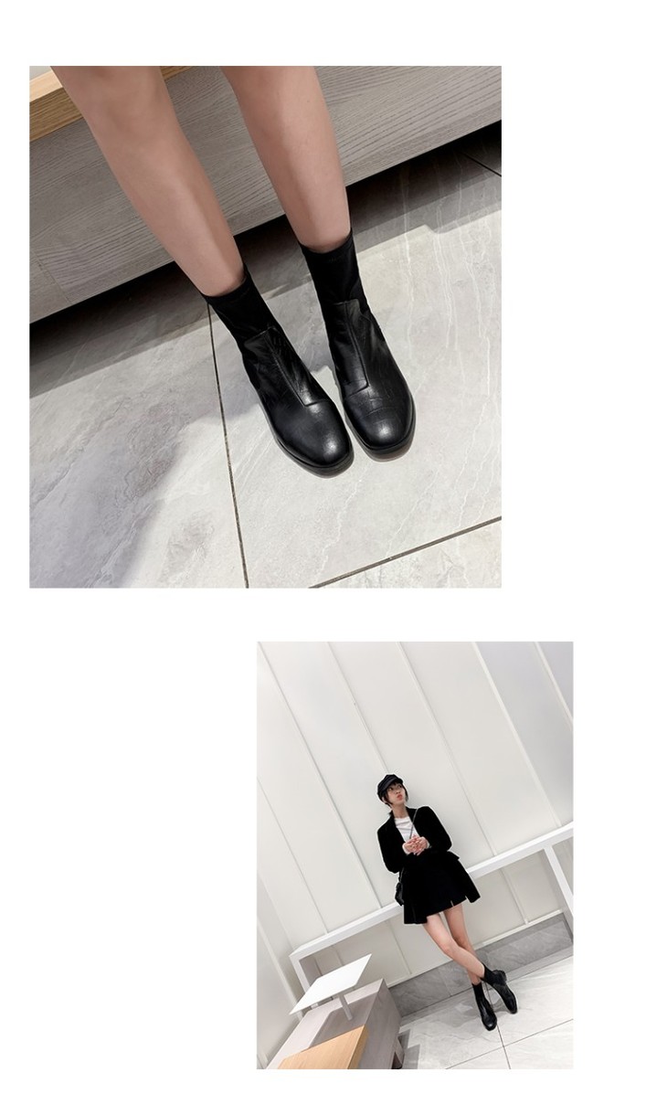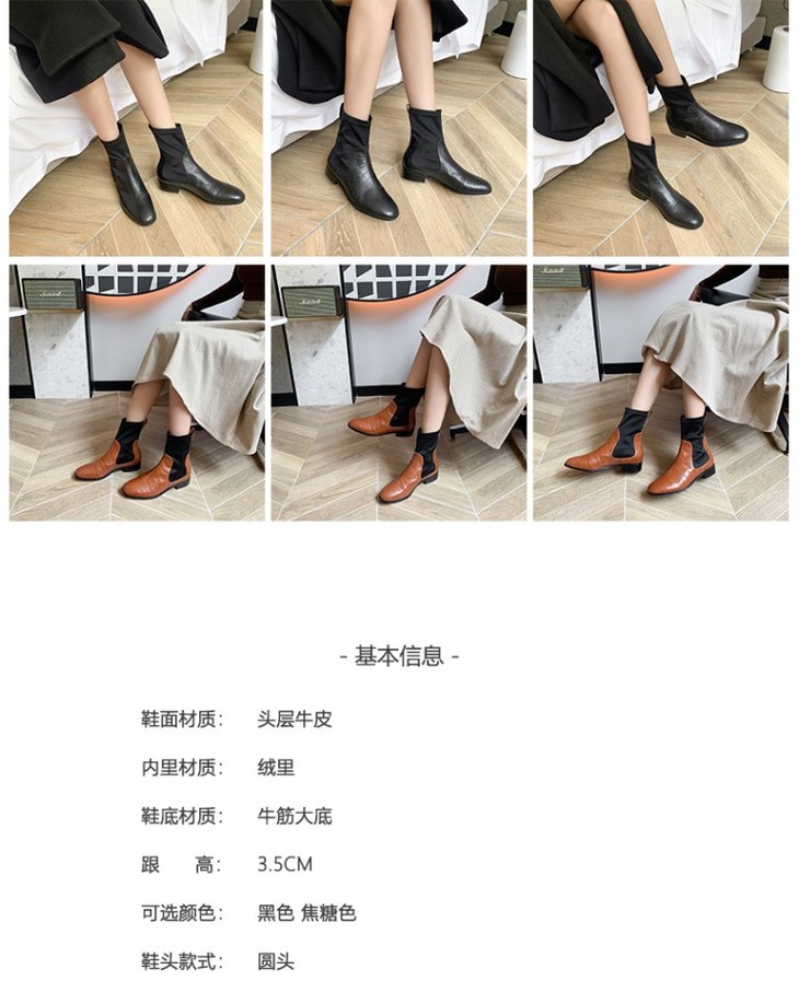 QQJ-JW-709 秋季新款圆头方根纯色真皮弹力靴松紧带复古时尚低跟短筒靴