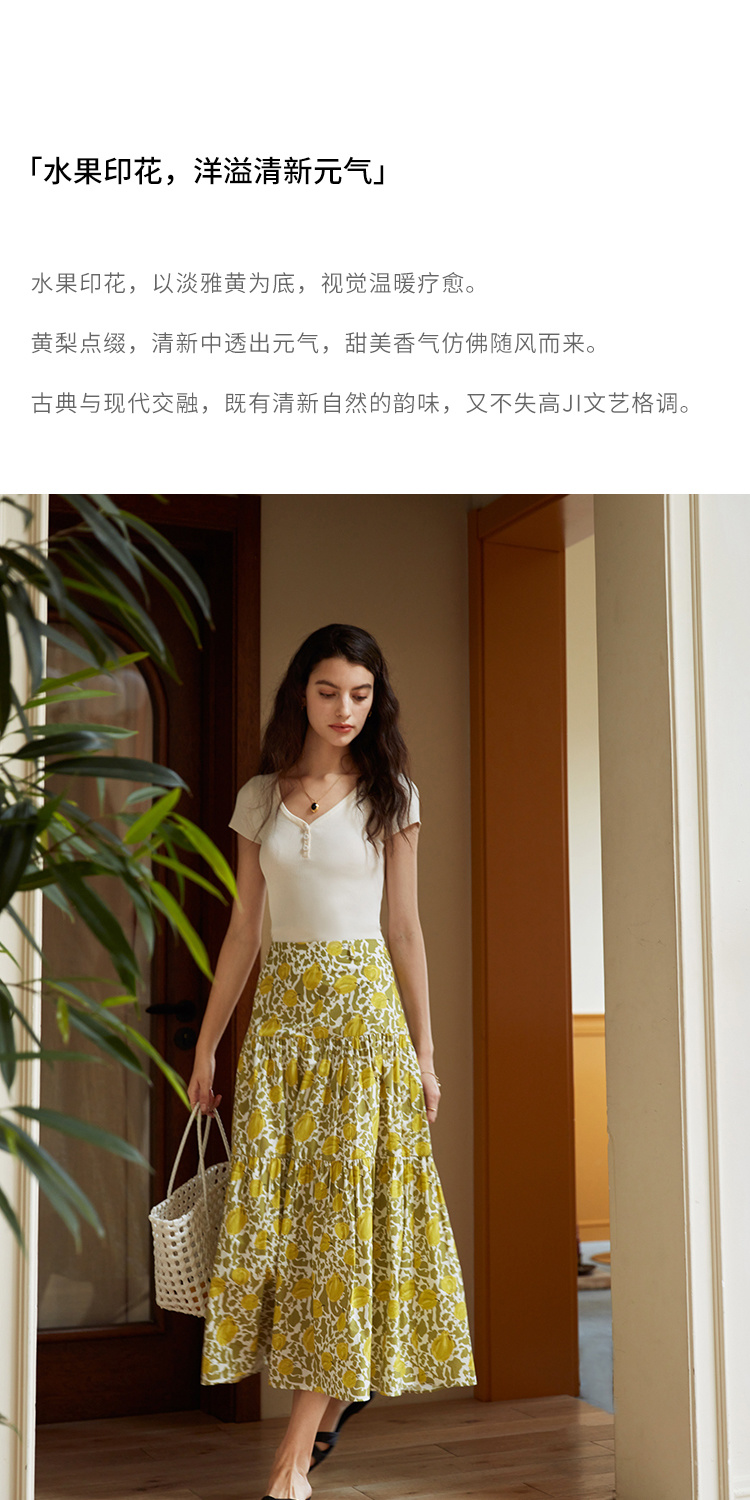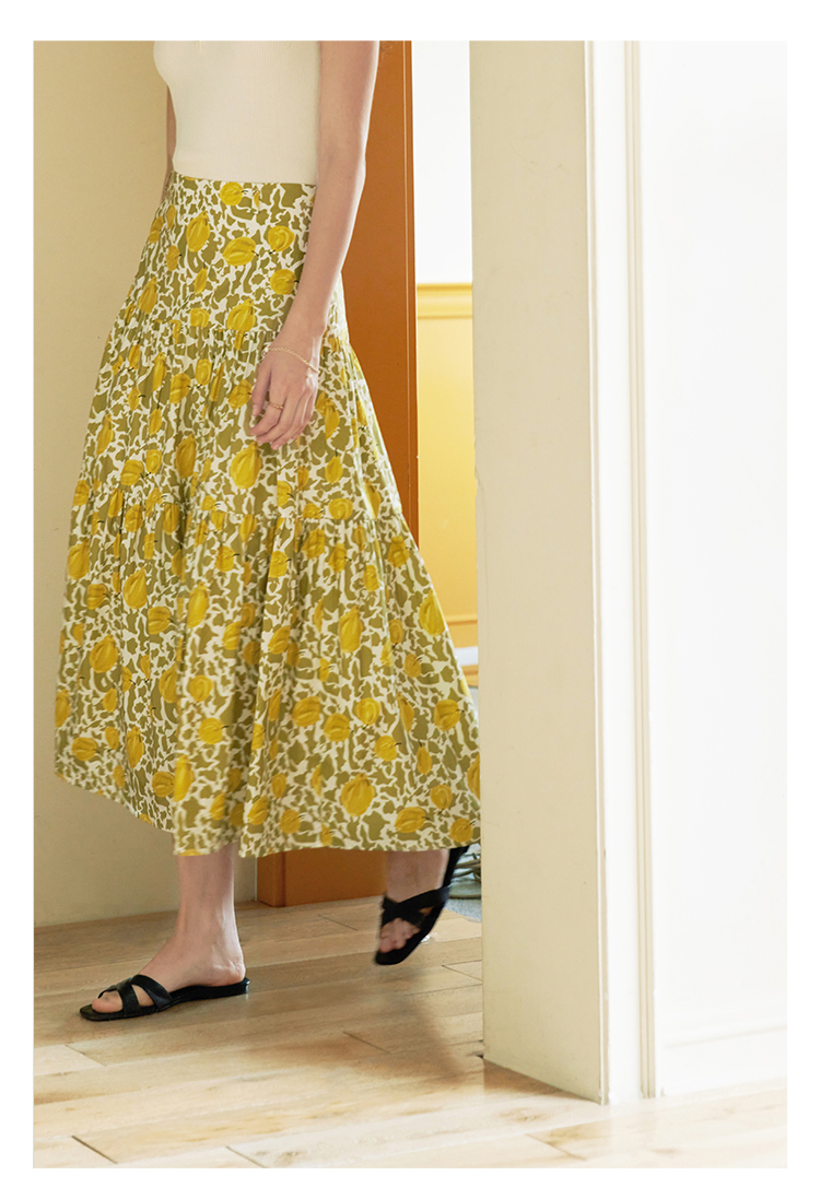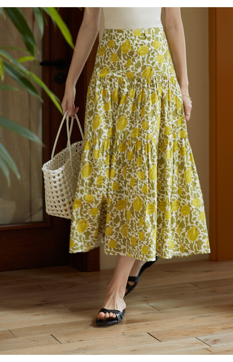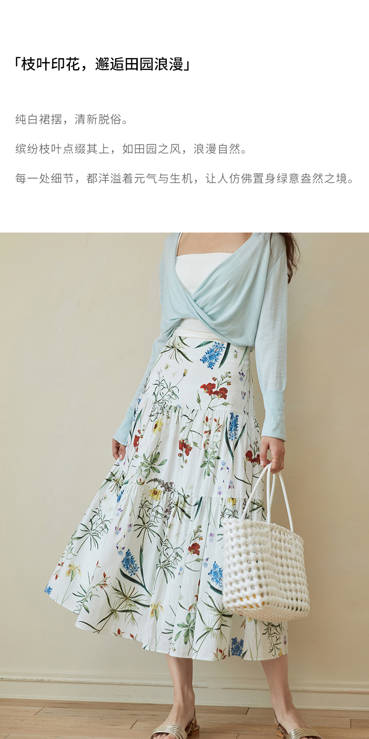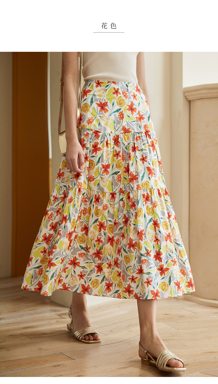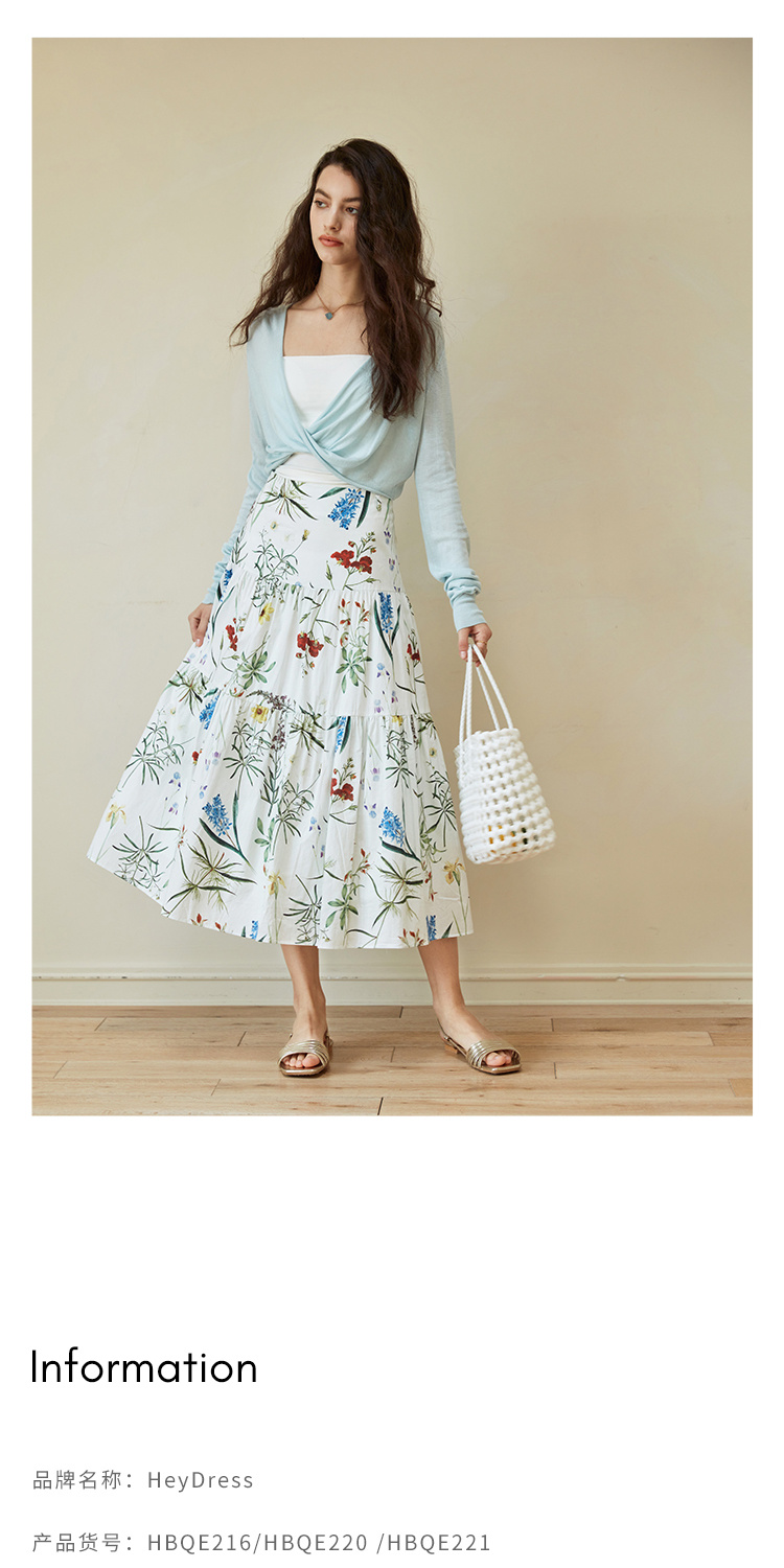 HeyDress法式印花半身裙女春夏高腰宽松压褶A字裙优雅气质伞摆裙