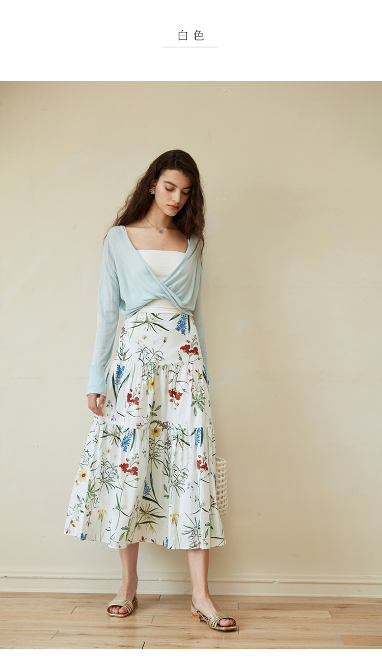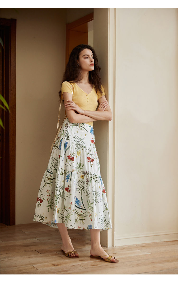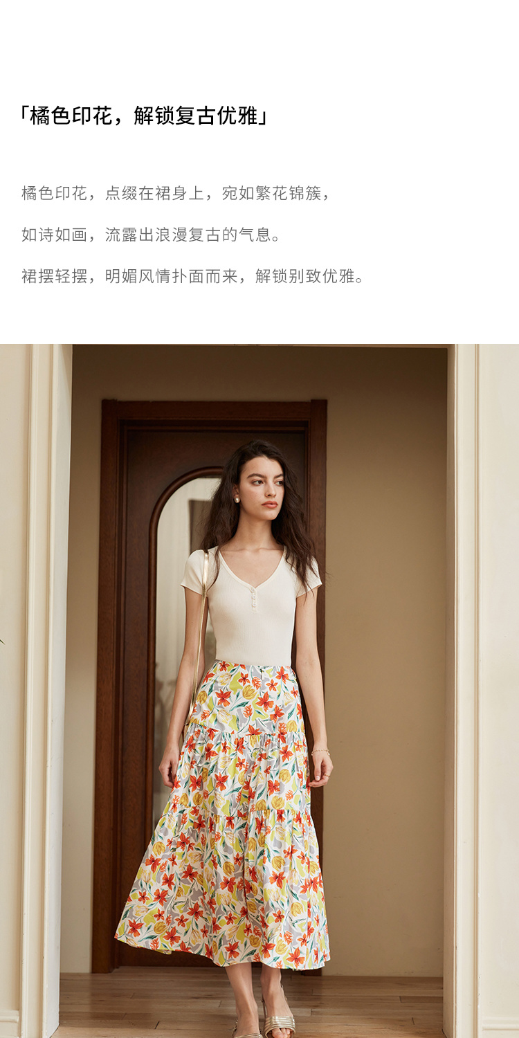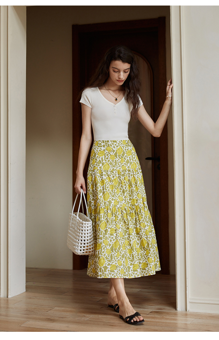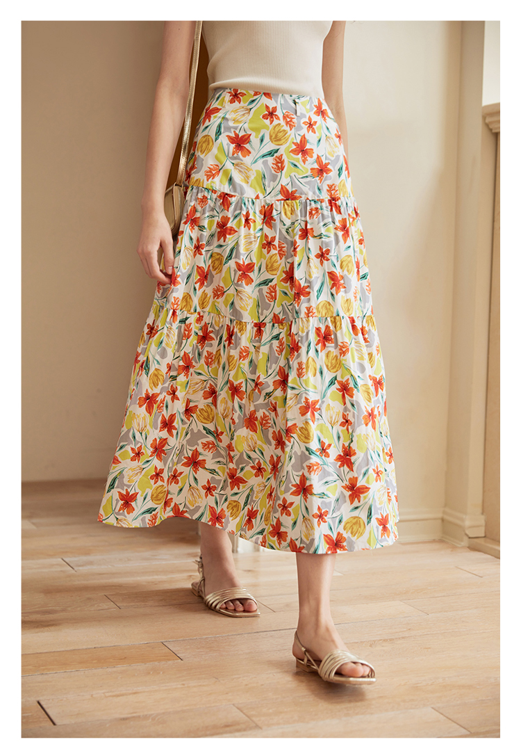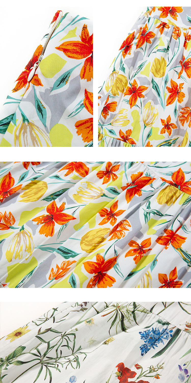 HeyDress法式印花半身裙女春夏高腰宽松压褶A字裙优雅气质伞摆裙