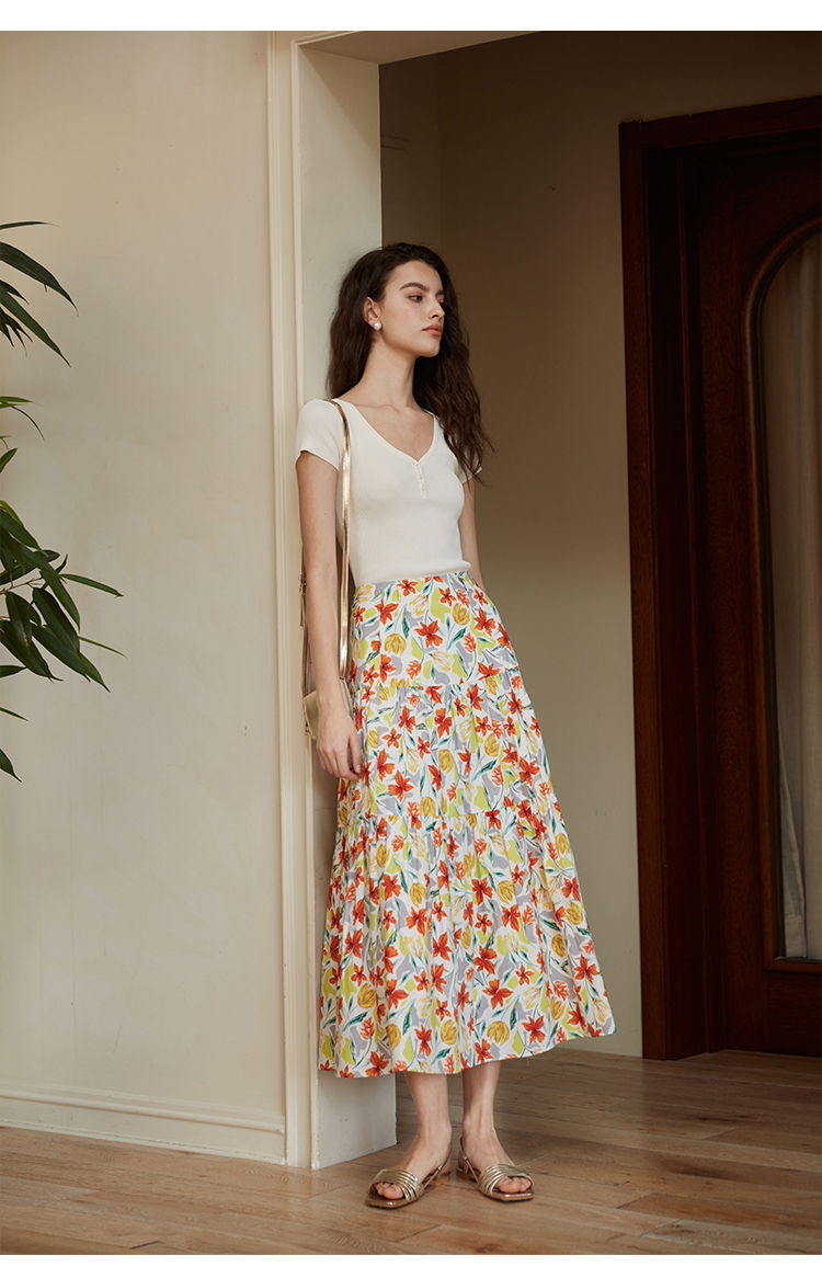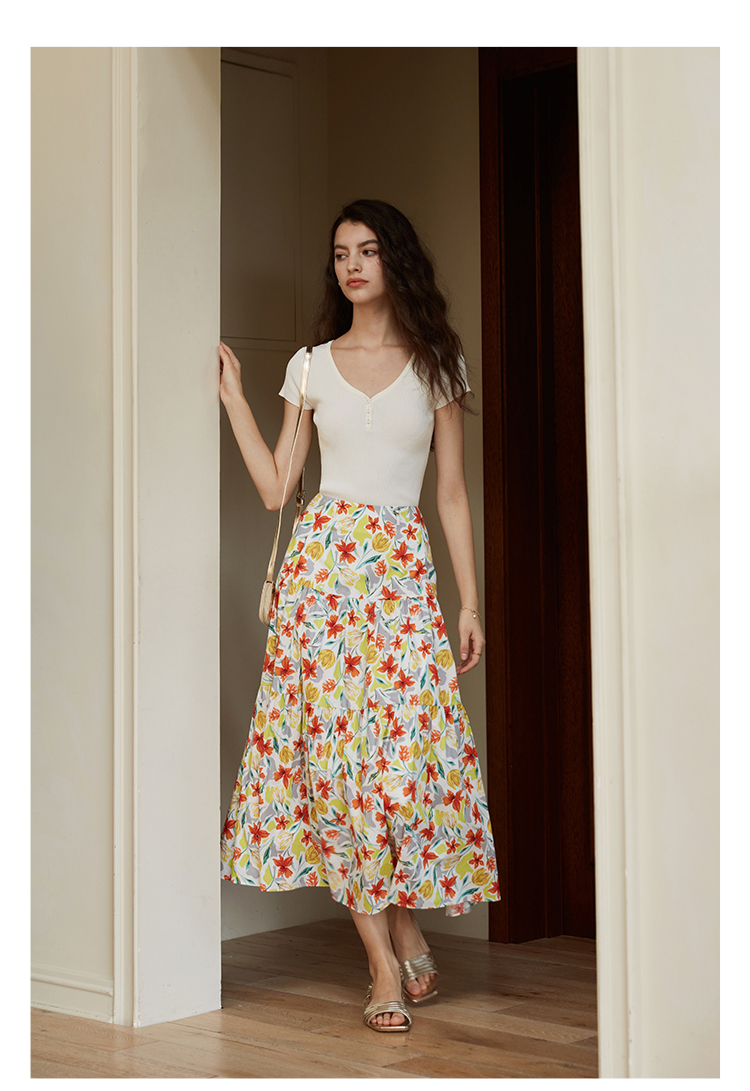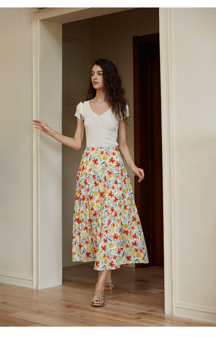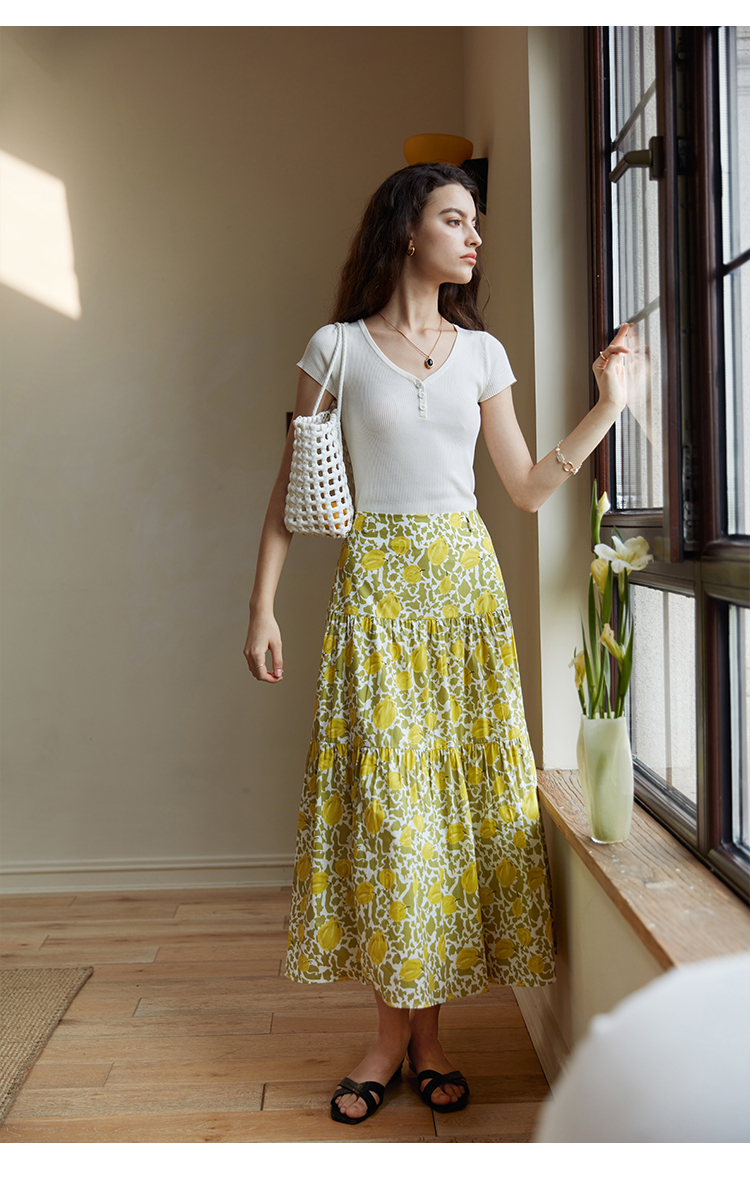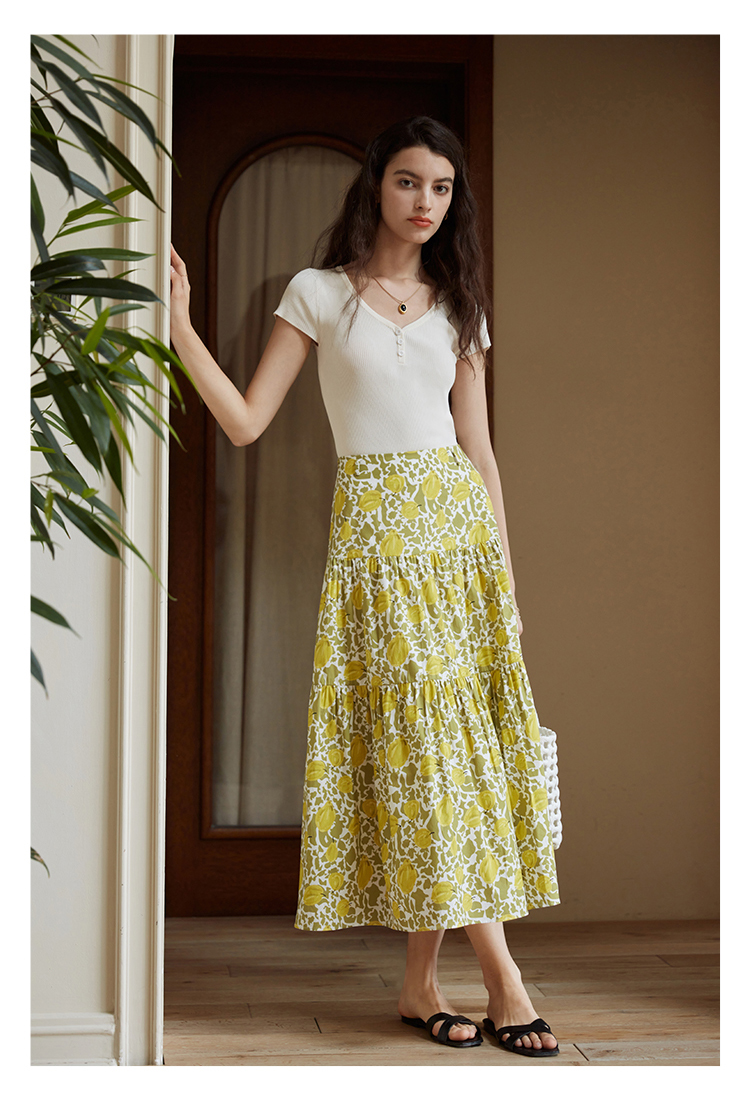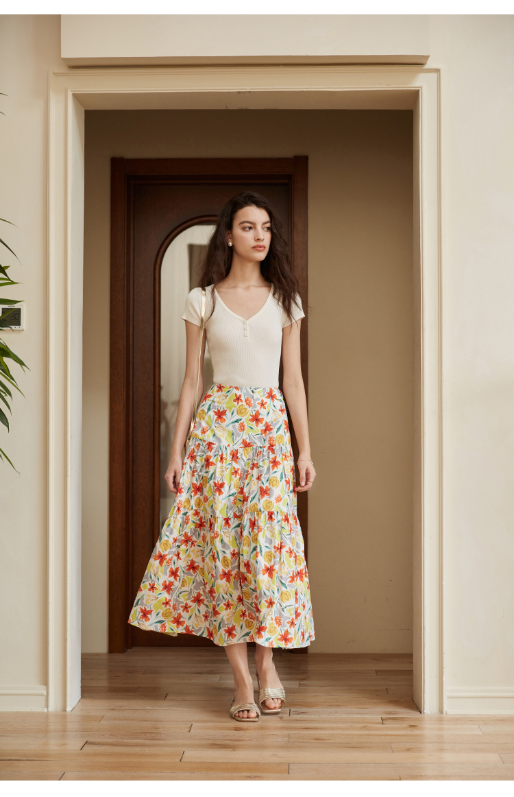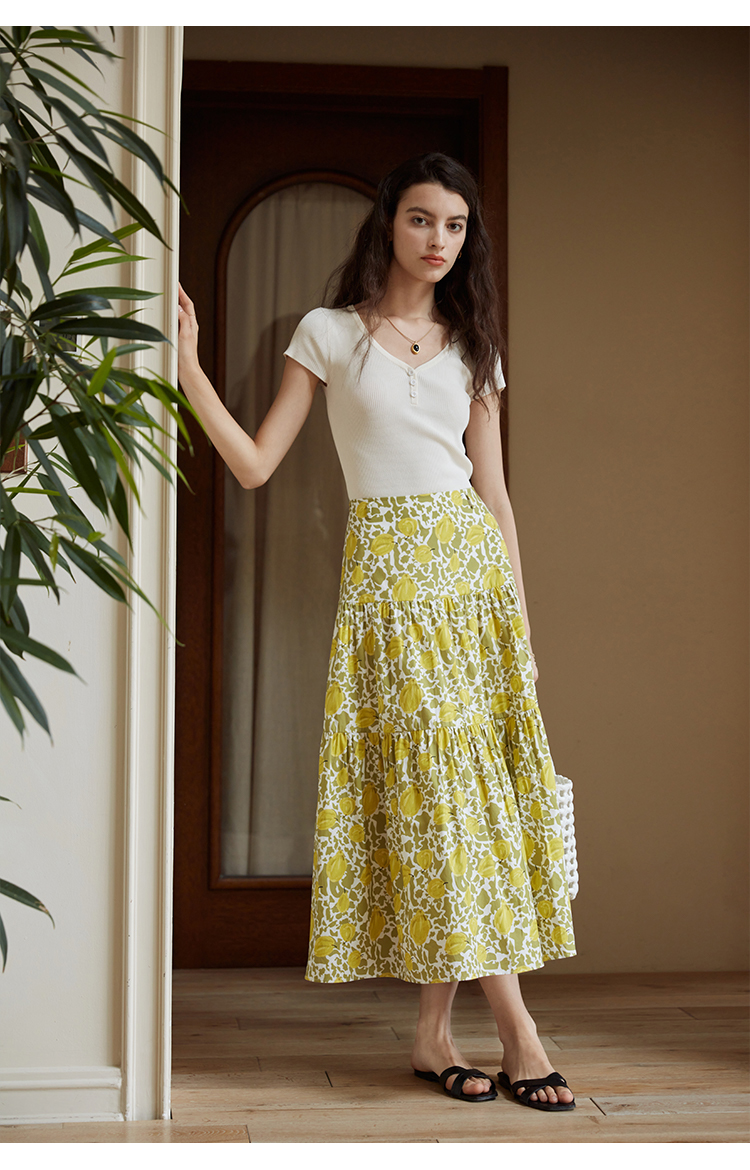 HeyDress法式印花半身裙女春夏高腰宽松压褶A字裙优雅气质伞摆裙