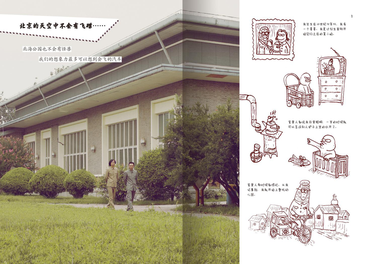 在彭磊此次修订绘制的新书《北海怪兽》中,以其油画作品中的代表形象“咪咪和嘎嘎”为原型。以故事的形态展现70年代至今的潮流变迁。他的画风,诙谐中透着戏谑,可爱的卡通中表现出深刻的现实。而这种带着岁月痕迹的叙述方式,让人联想到另一本堪称经典的书《小时候》,可以说《北海怪兽》就像一本以漫画形式表现的《小时候》。