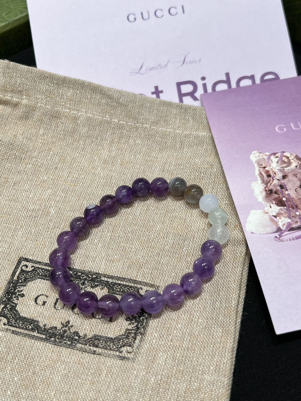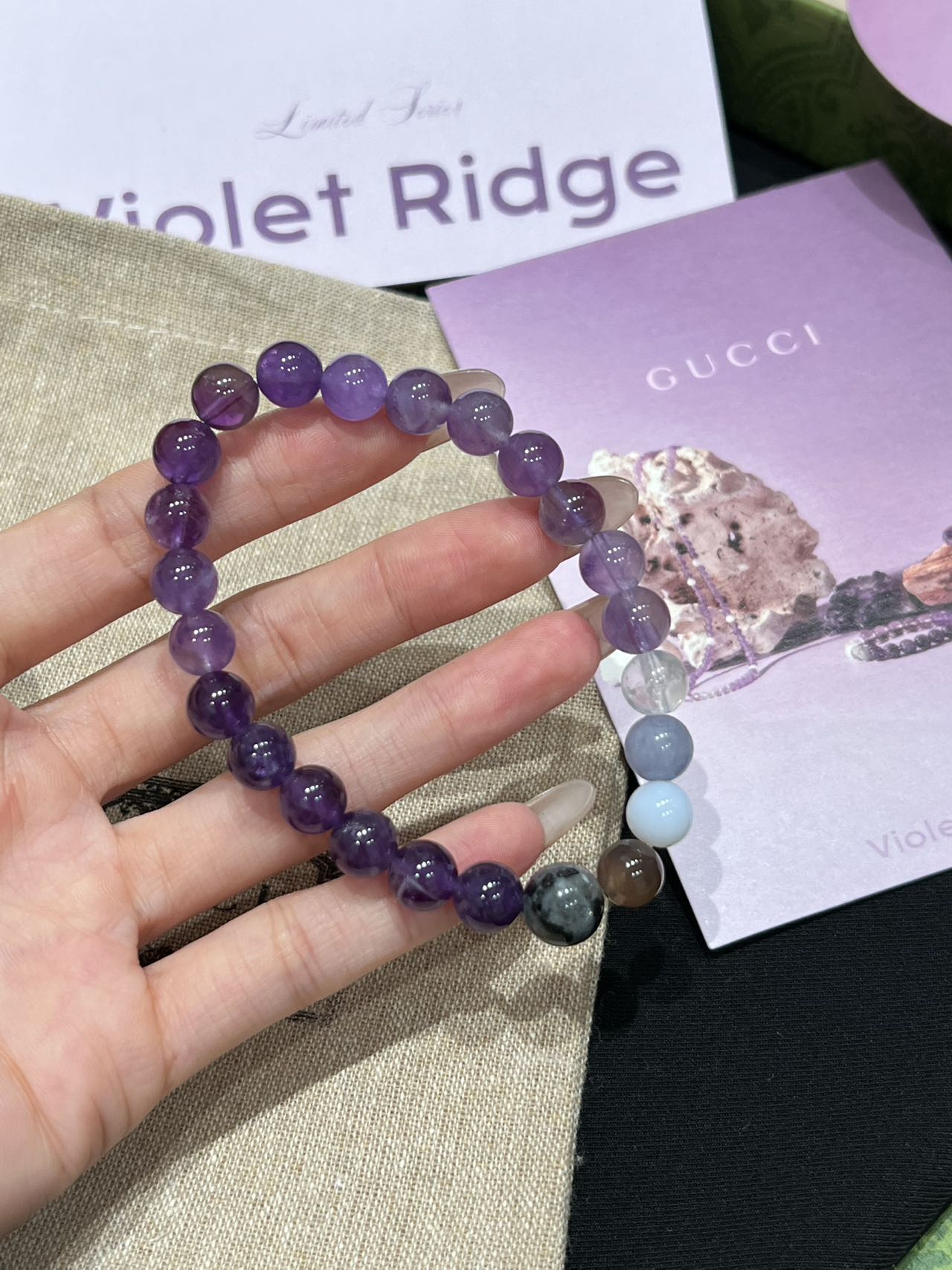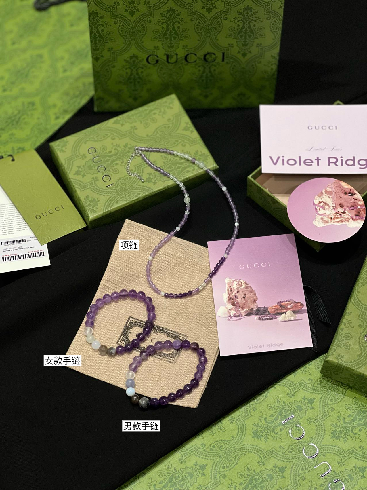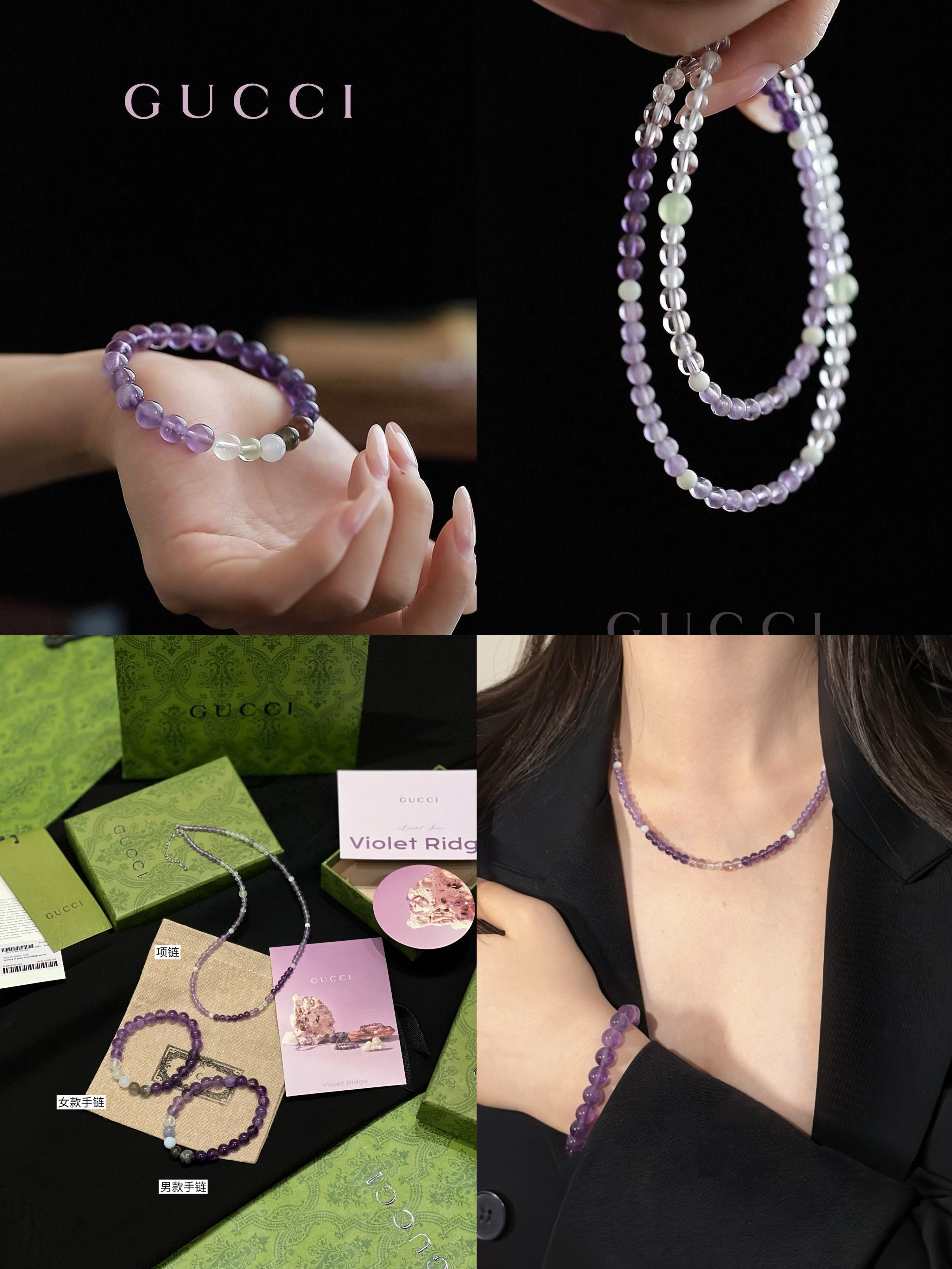 古家高级珠宝VioletRidge系列九紫离火手串/项链…今年必入的首饰,优化你的运势,自然之诗,能量之脉!!九紫离火年,一定不能错过的紫色手串!!guc同款高能量紫水晶手串…来,姐妹们!各位大女主们!迅速来补财位,迎接大财入库!九紫离火运是求财和发展的好时机!这个阶段适合佩戴不同的紫色手串,以吸引正能量!是女性崛起转运的时刻!是属于女性的20年!紫色自古便是尊贵与吉祥的象征,它融合了白与蓝的温柔和冷静,既显贵气又不失优雅,散发着深沉的艺术魅力!!⚠️每一颗水晶均由日本京都百年工坊匠人手工甄选,溯源巴西紫晶洞、马达加斯加粉晶矿脉、印尼金曜石岩层,微镶技法串联,让晶石天然裂隙化为光轨,层叠如起伏山脊!整个系列有项链/手串,男女现货,全部原封带芯片!款式:女款手链、男款手链、项链