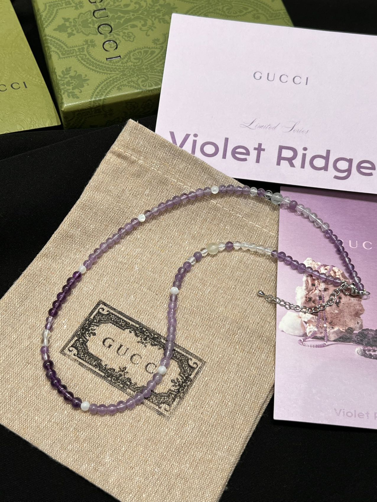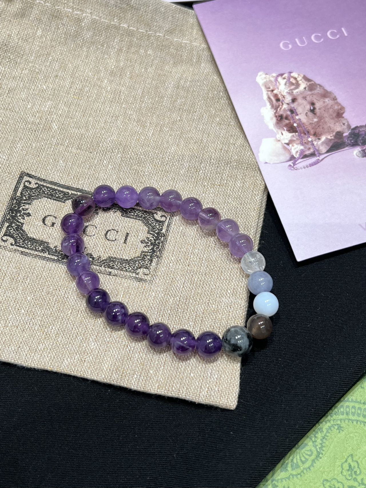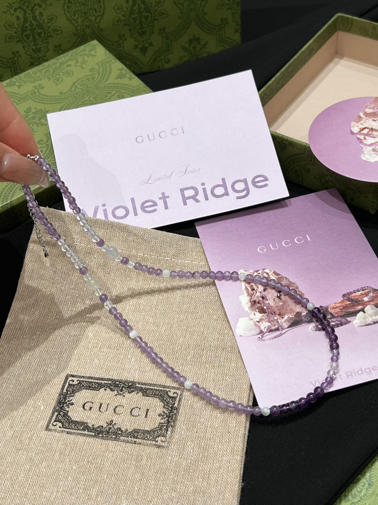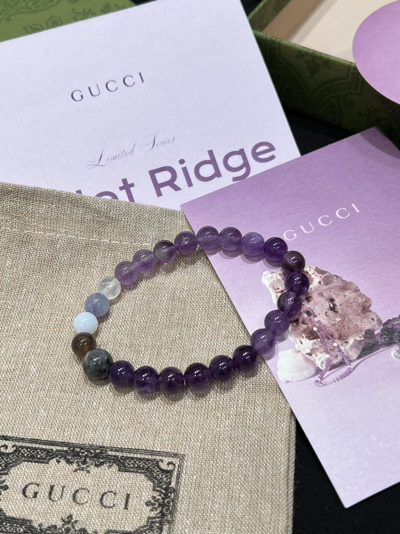 古家高级珠宝VioletRidge系列九紫离火手串/项链…今年必入的首饰,优化你的运势,自然之诗,能量之脉!!九紫离火年,一定不能错过的紫色手串!!guc同款高能量紫水晶手串…来,姐妹们!各位大女主们!迅速来补财位,迎接大财入库!九紫离火运是求财和发展的好时机!这个阶段适合佩戴不同的紫色手串,以吸引正能量!是女性崛起转运的时刻!是属于女性的20年!紫色自古便是尊贵与吉祥的象征,它融合了白与蓝的温柔和冷静,既显贵气又不失优雅,散发着深沉的艺术魅力!!⚠️每一颗水晶均由日本京都百年工坊匠人手工甄选,溯源巴西紫晶洞、马达加斯加粉晶矿脉、印尼金曜石岩层,微镶技法串联,让晶石天然裂隙化为光轨,层叠如起伏山脊!整个系列有项链/手串,男女现货,全部原封带芯片!款式:女款手链、男款手链、项链